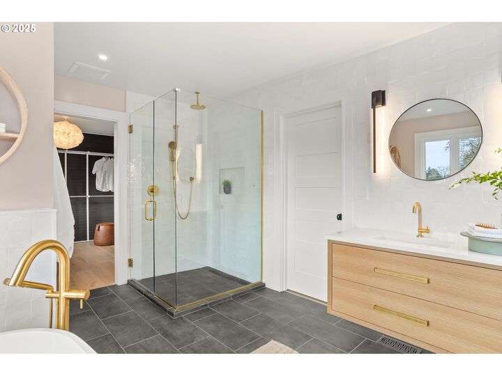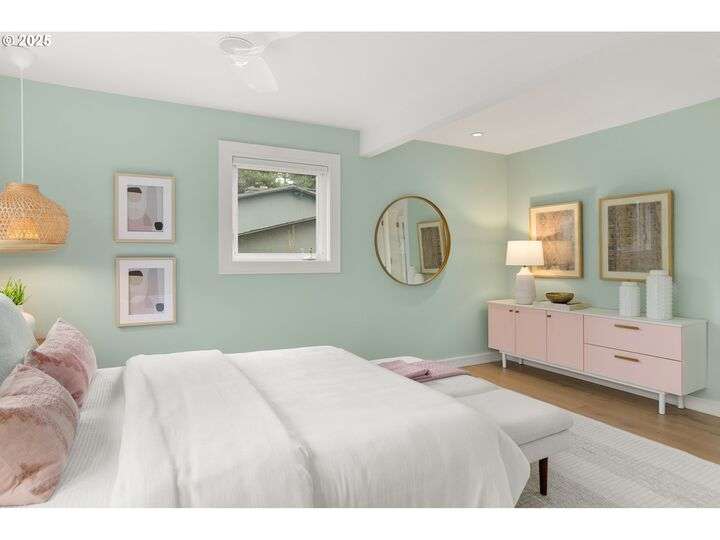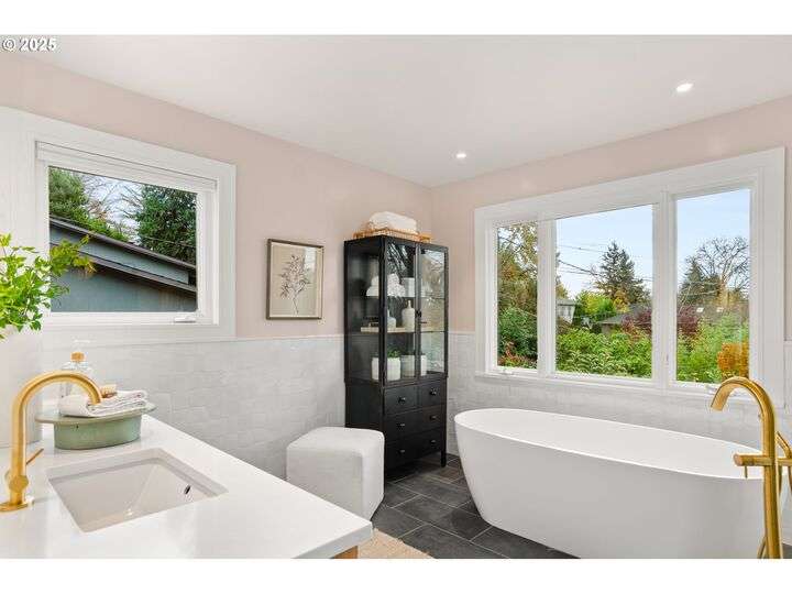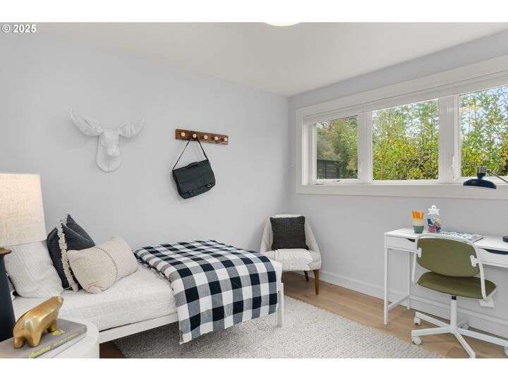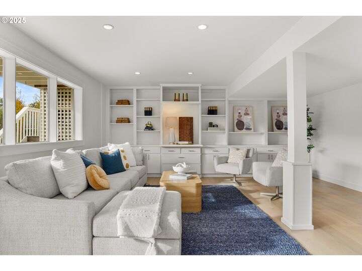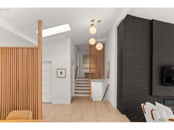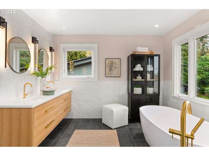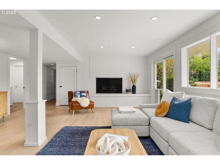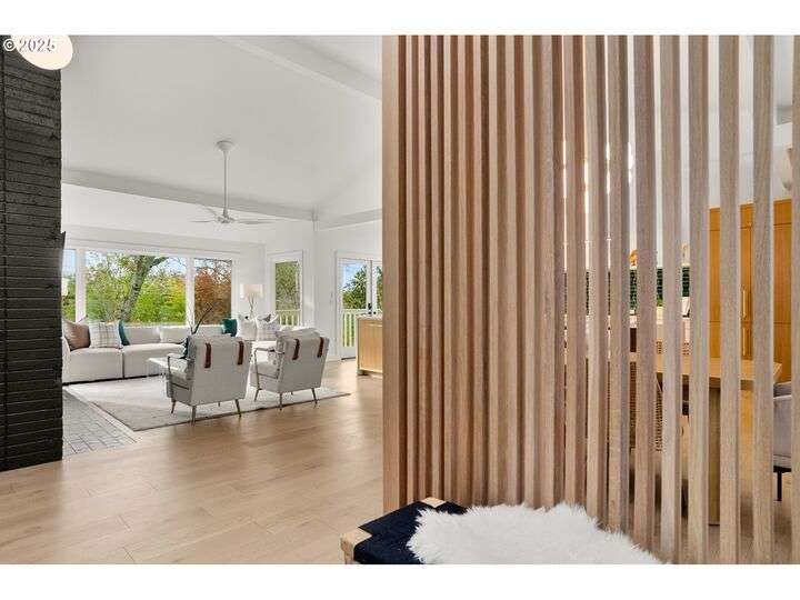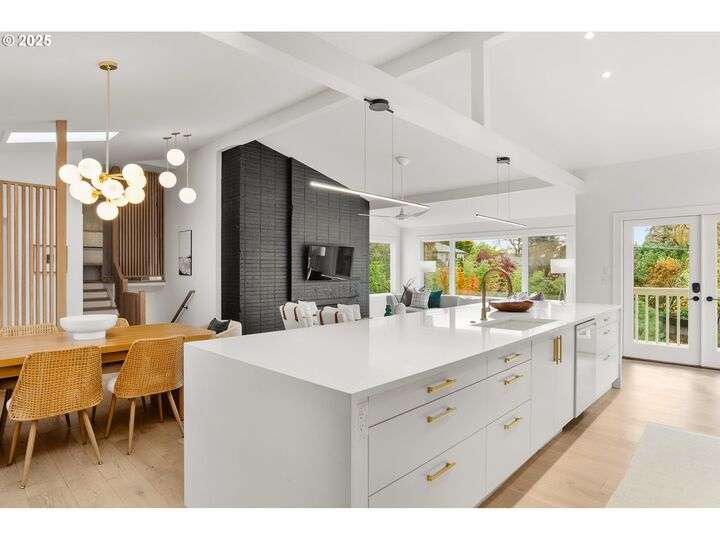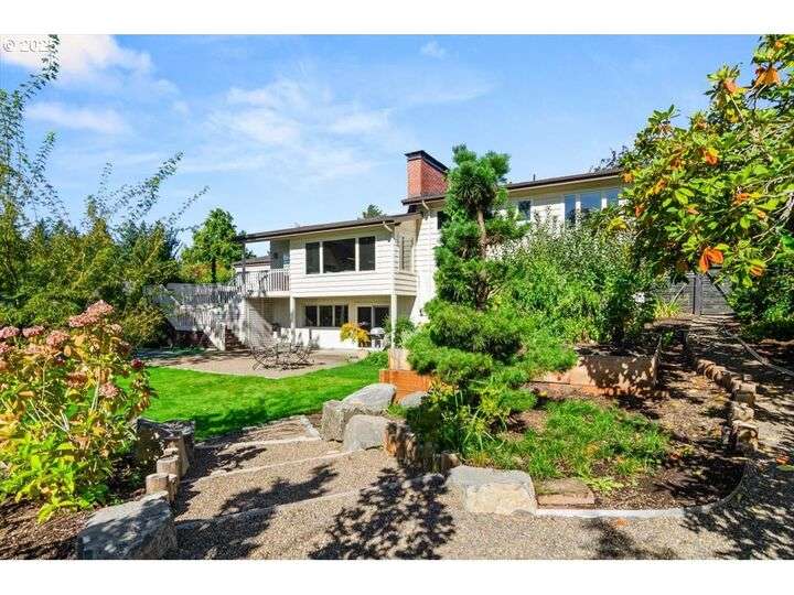 Nestled on a private 0.29-acre lot in Portland’s desirable Wilcox Estates, this recently remodeled mid-century modern home embodies relaxed sophistication and timeless design. Expansive windows fill the vaulted, light-filled interiors with natural warmth, showcasing wood floors and thoughtfully curated finishes throughout. The open-concept great room connects seamlessly to a designer kitchen featuring quartz countertops, an oversized island, Dacor 6-burner range, and built-in 48” refrigerator. Glass doors extend the living space to an expansive deck overlooking the lush backyard—ideal for alfresco dining or friendly pickleball matches on your private court. The tranquil primary suite offers a spa-inspired retreat with Ann Sacks tile, a freestanding tub, and heated floors. The lower level provides exceptional flexibility with three additional bedrooms, a recently remodeled full bath, and a welcoming family room perfect for guests or evenings by the fire. Located within the coveted Wilcox Estates, residents enjoy access to neighborhood tennis courts, a community pool, and nearby parks—all within the top-rated Bridlemile school district. A perfect blend of design, comfort, and community.