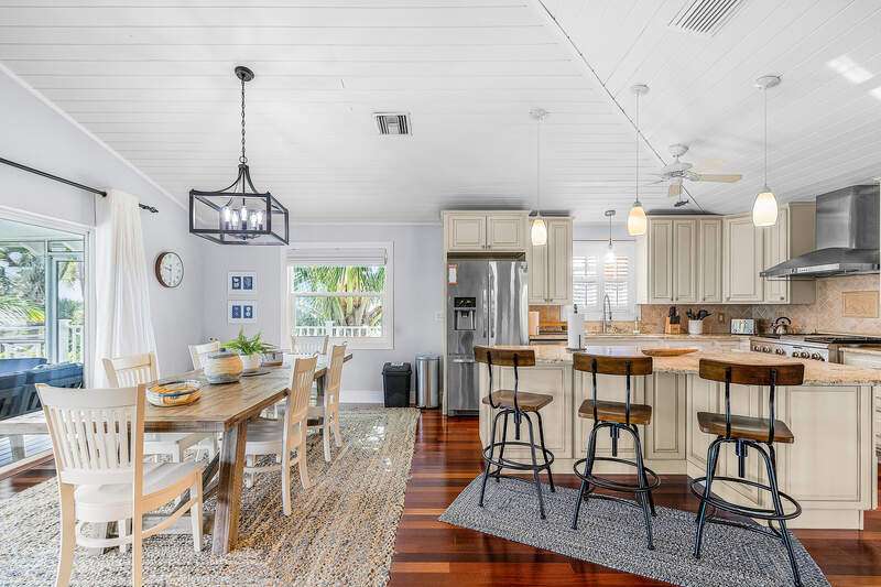 Upon walking into this updated and classic "Old Florida" home, the warmth and charm from the wood cathedral ceilings, solid mahogany floors, custom upgraded kitchen with all stainless appliances, including a wine cooler, gas cooktop, warming tray, and pantry, will make you feel as if you've ARRIVED. The hurricane sliding doors lead to the warm tropical breezes blowing through the palm trees, as you relax on your screened porch upstairs while reading a book or watching the boats coast by in Charlotte Harbor. Not to mention the quick and easy access to the Gulf with the deeded dock around the corner that can accommodate up to a 24' boat, and Boca Grande Pass the "Tarpon Fishing Capitol of the World". This impeccably maintained home has concrete block on the first floor, Hardie siding on the upper level, and a metal roof. The guest bedroom is an ensuite, with privacy for your guests, and there is a "TV room"/Den/Study upstairs that has a large closet for extra storage. The laundry has a convenient door leading downstairs to the pool. The lower level suite has a new epoxy floor and PVC wainscoting on the walls for ease in maintenance, along with a private screen porch with sliders from the bedroom and the living room. The pool has a ledge for seating with whirlpool jets, table, and built in tiki (along with a new pump and filter) is surrounded by unique bamboo fencing with lots of privacy. Make your appointment today!