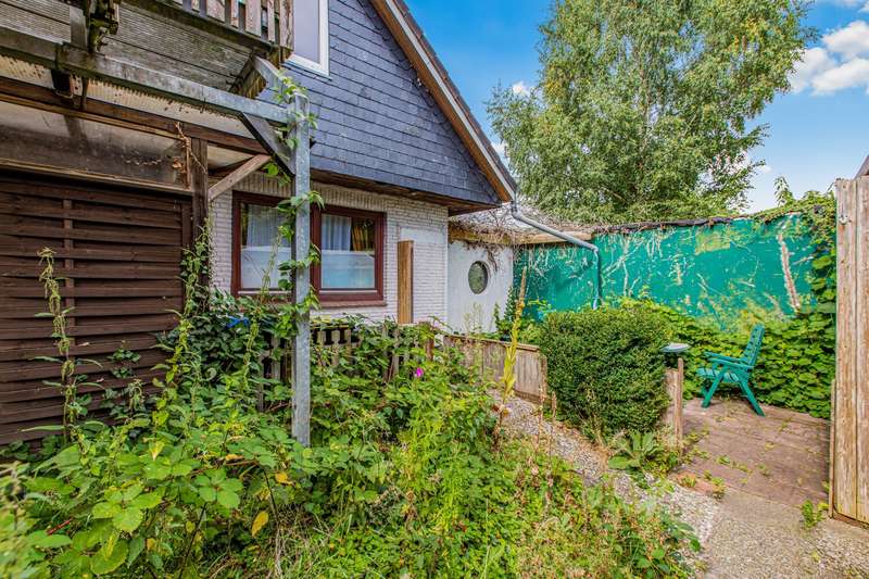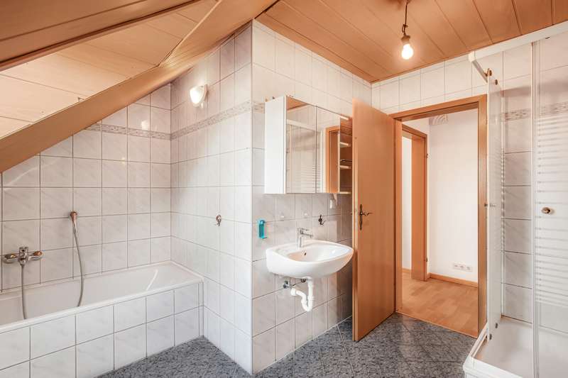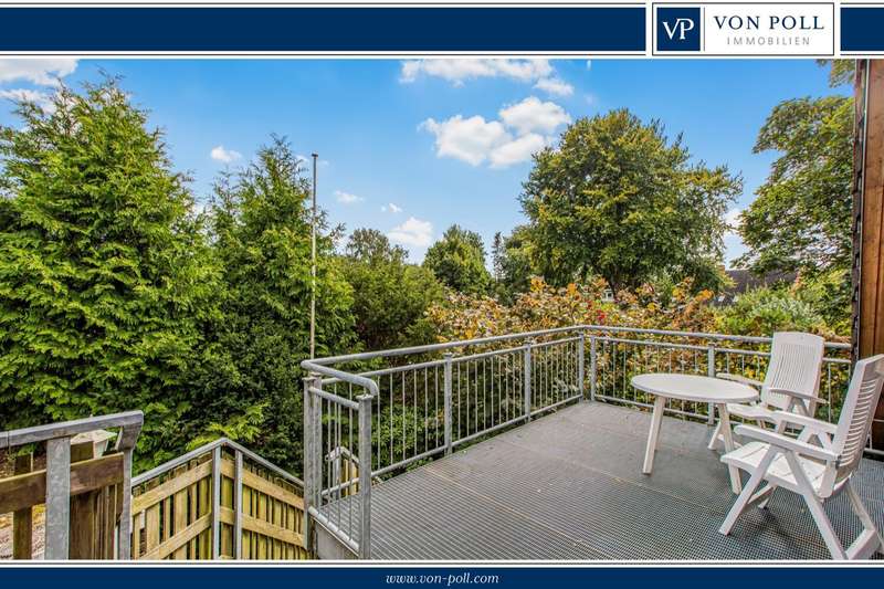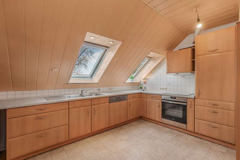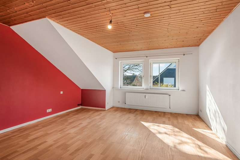 The apartment on offer is located on the top floor of a spacious two-family house, which was built in 1971 and only extended in 1994. It is characterized by a well thought-out floor plan, ample storage space and a quiet cul-de-sac location and offers an ideal home for couples or families. The apartment is conveniently accessed via an external staircase on the gable end of the house, ensuring maximum privacy from the occupant below. There is a sunny roof terrace in front of the apartment, inviting you to enjoy a relaxed breakfast in the sun above the rooftops of Fockbek. The apartment itself has a total living space of 126 m², spread over five rooms. You can feel the spacious atmosphere as soon as you enter the apartment. All rooms are easily accessible from the hallway: the timeless full bathroom, a small guest WC, three bedrooms, a study, the kitchen with built-in furniture in beech decor and enough space for a dining area and the large living/dining area. The latter is flooded with light thanks to the many windows and invites you to spend cozy hours with friends or family. The loft, which offers plenty of storage space for suitcases or Christmas decorations, is also worth highlighting. The garden impresses with a sheltered terrace, so that nothing stands in the way of a hot afternoon coffee in the sun. You can also realize your own personal garden ideas here. For example, you can plant a vegetable patch, create a small lawn for playing or transform the area into a colorful sea of flowers. The former garage has been converted into a workshop with a storage room and could be used again immediately after a roof renovation. There is a parking space directly in front of the house. Large, solid apartment in a very quiet, central residential area of Fockbek. Don't miss out on this rare opportunity!