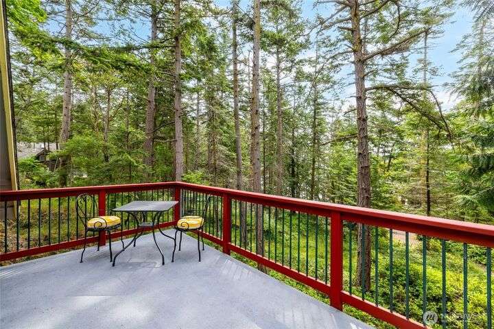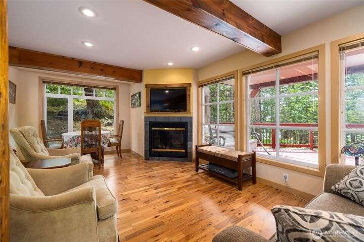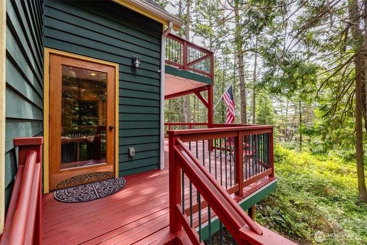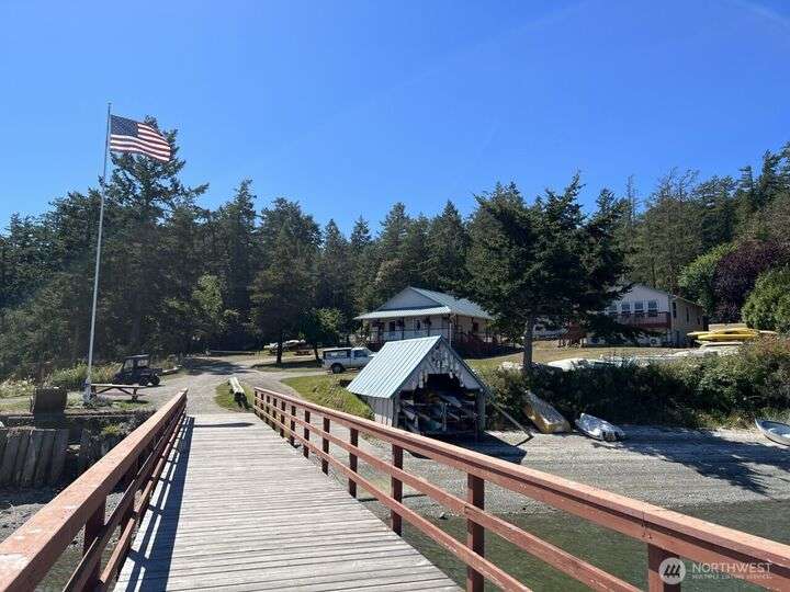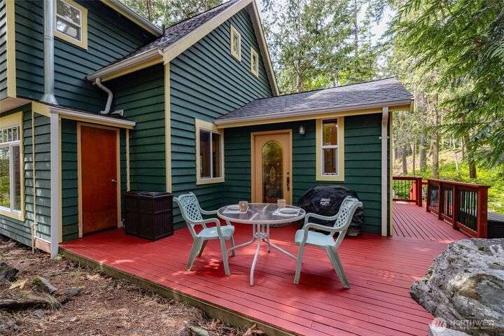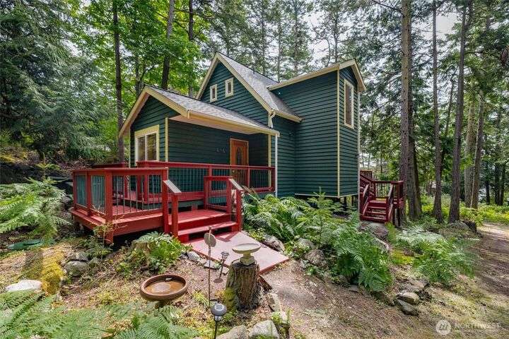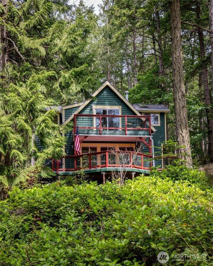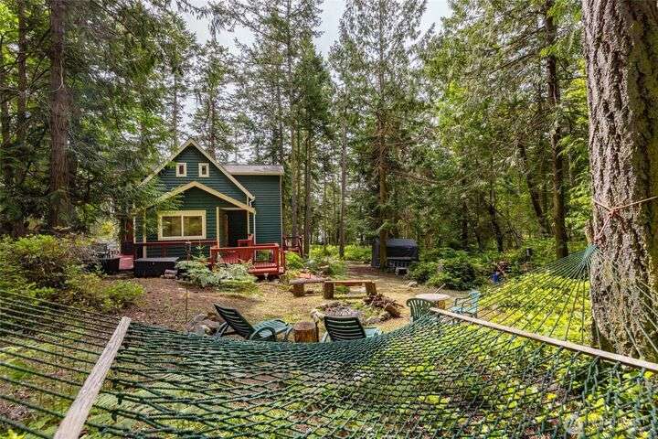 Amazing price for this special home. Nestled in the firs with the water sparkling through the trees, house has multiple decks for enjoying the sunny days and cool evenings. The primary bedroom has an ensuite bath with soaking tub and separate shower, plus a propane fireplace and private deck. The main floor great room has warm Australian Cypress floors, fully equipped kitchen, lovely dining area and another propane fireplace. Main floor bedroom hosts the washer/dryer and has its own deck access. A 3/4 bath is perfect for guests. All you need is your toothbrush to start using this delightful place. Fully furnished, including golf cart. A mooring buoy can be purchased separately. Two deep-water docks, private airstrip, clubhouse, caretakers.
