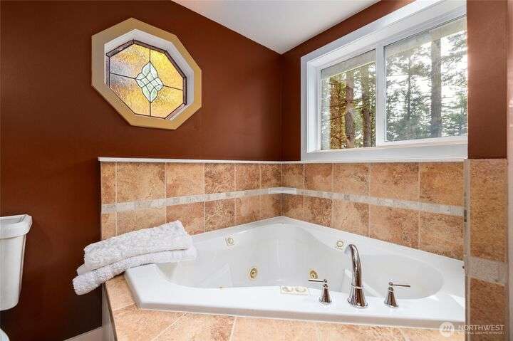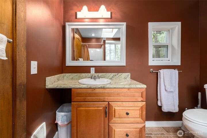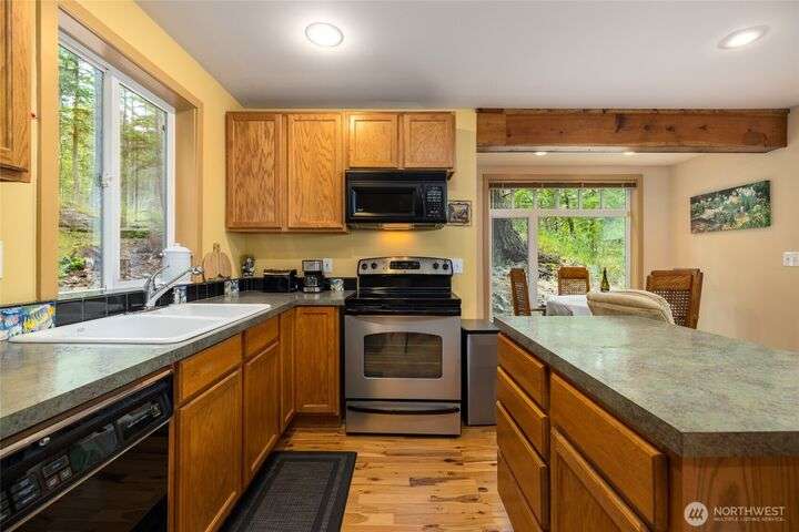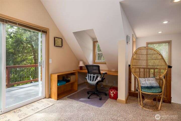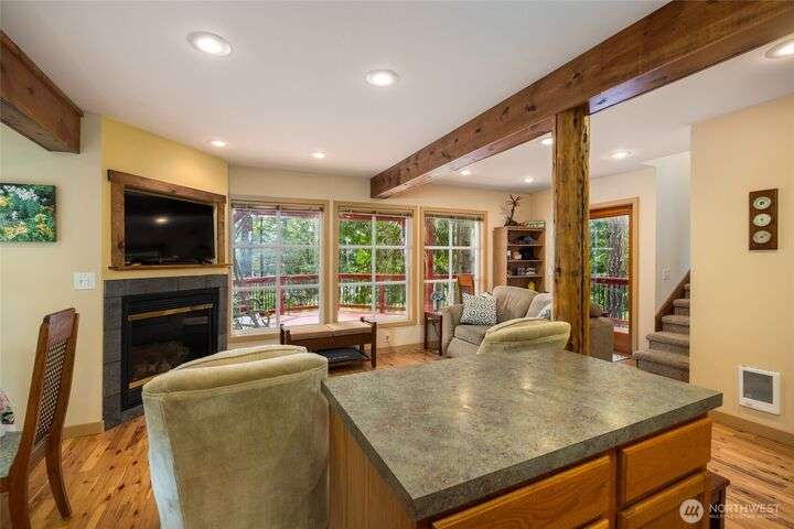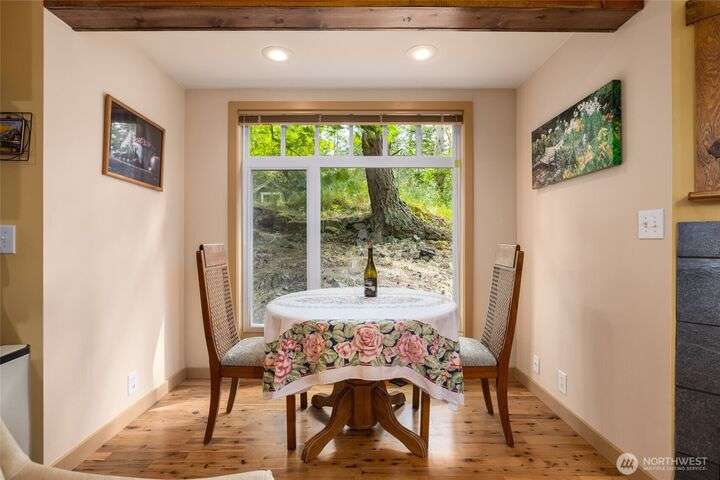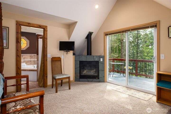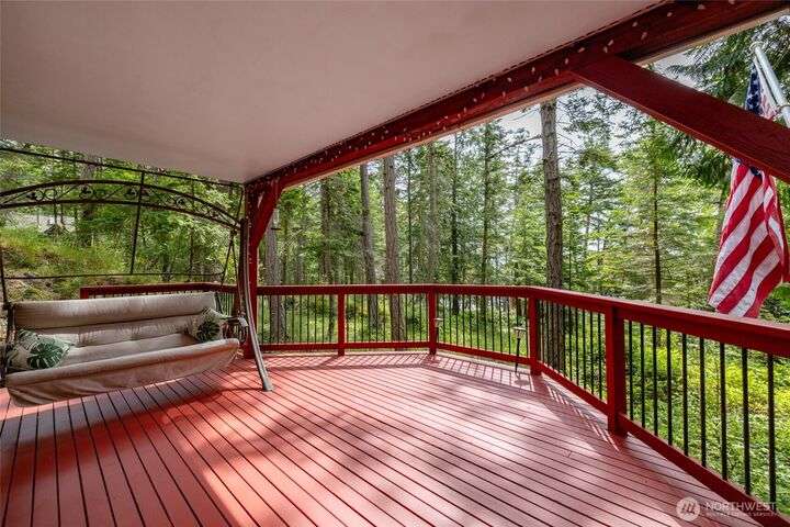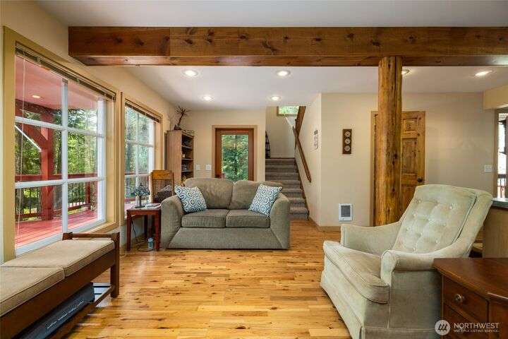 Amazing price for this special home. Nestled in the firs with the water sparkling through the trees, house has multiple decks for enjoying the sunny days and cool evenings. The primary bedroom has an ensuite bath with soaking tub and separate shower, plus a propane fireplace and private deck. The main floor great room has warm Australian Cypress floors, fully equipped kitchen, lovely dining area and another propane fireplace. Main floor bedroom hosts the washer/dryer and has its own deck access. A 3/4 bath is perfect for guests. All you need is your toothbrush to start using this delightful place. Fully furnished, including golf cart. A mooring buoy can be purchased separately. Two deep-water docks, private airstrip, clubhouse, caretakers.