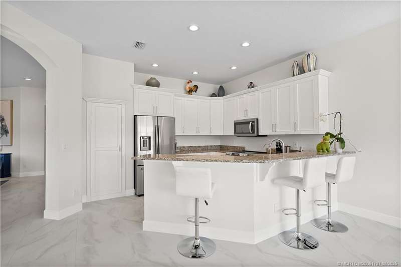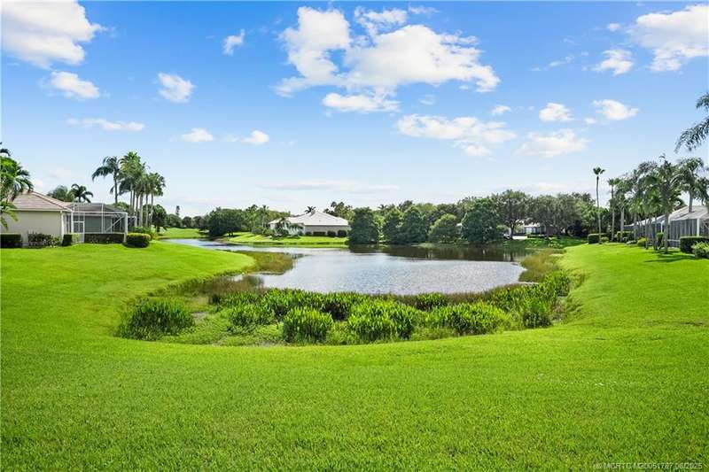 Renovated 3BD/2BA home with oversized 2-car garage plus bonus space for golf cart or storage. Roof 2021. Elegant double tray ceiling entry, arched walls, wainscoting in formal dining, upgraded chandelier, and crown molding. Gourmet kitchen with 42" solid wood cabinets, crown molding, soft-close drawers, granite counters, tile backsplash, new range, and newer appliances. 10-ft ceilings, 8-ft doors, and arched entryways throughout. Abundant light from custom 76" windows with remote blinds in common areas. Walk-in closets in all bedrooms; primary suite and main living areas enjoy beautiful lake views. Updated landscaping on oversized lot, upgraded recessed lighting, screwless electrical plates, and extensive custom upgrades to office/third bedroom. Walk or bike to the country club—membership optional. HOA covers cable, high-speed internet, lawn care, and more for easy living year-round.