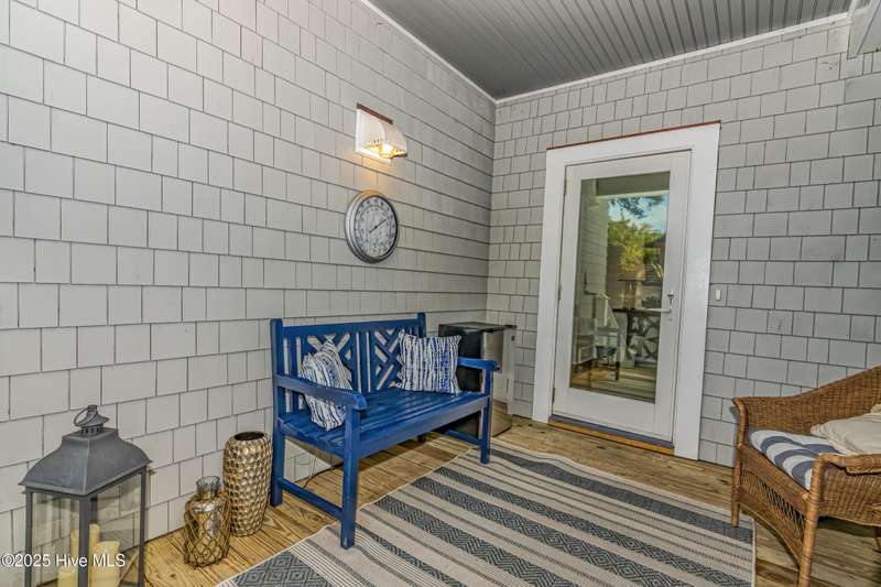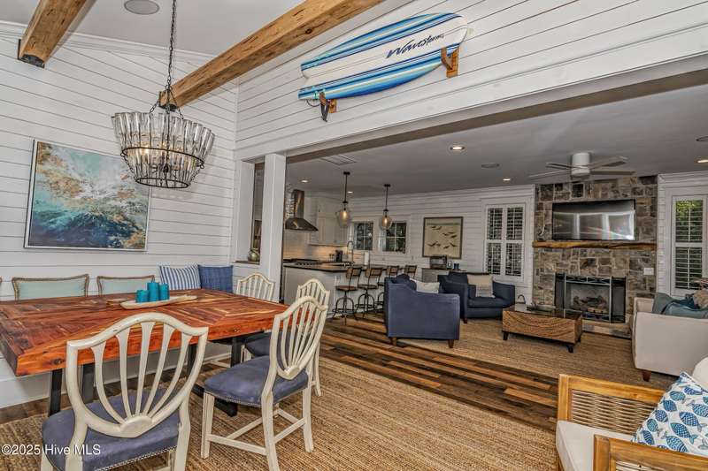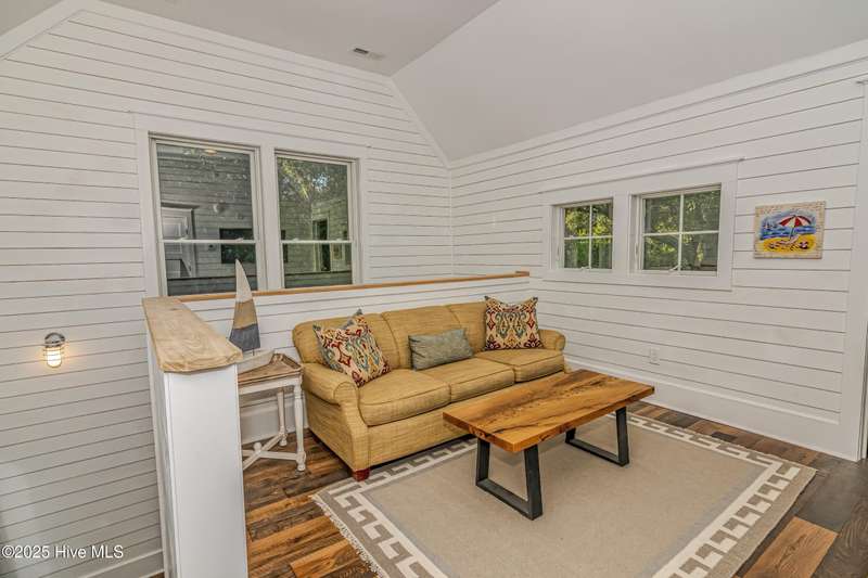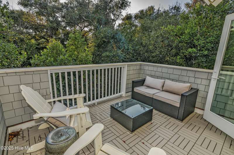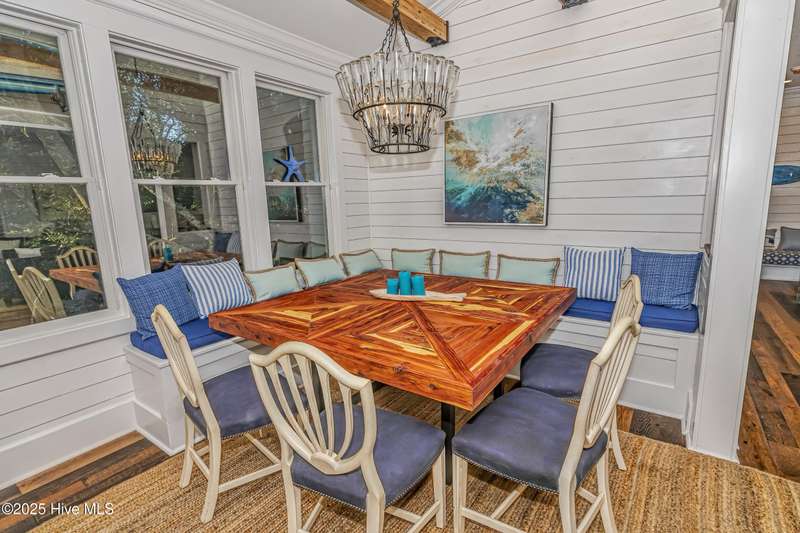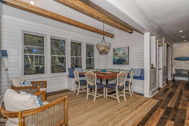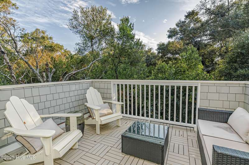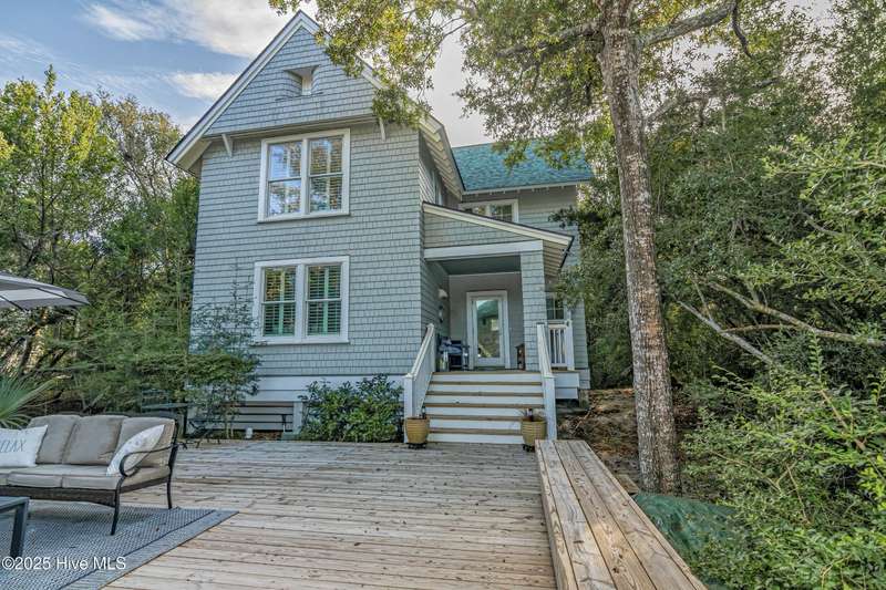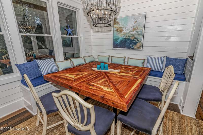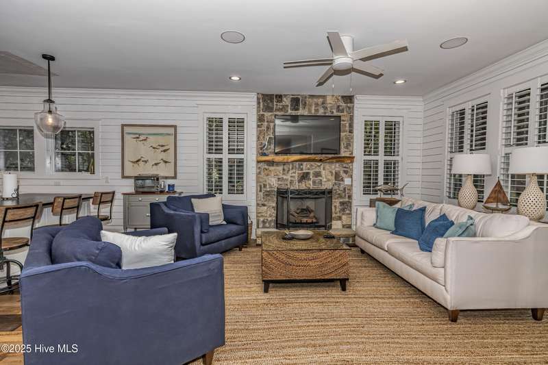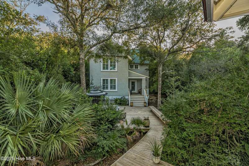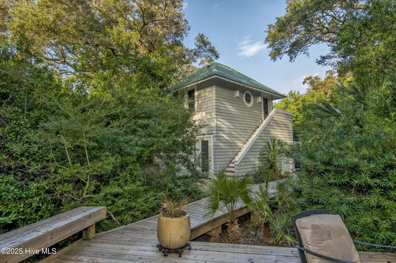 This secluded retreat in Keepers Landing boasts a recently renovated floor plan that features open spaces throughout the kitchen and living room. On cooler evenings, indulge in the ambiance of the living room gas fireplace, while the attached screened porch offers a picturesque overlook of the Maritime Forest. The dining space accommodates up to ten guests under a vaulted ceiling adorned with exquisite wooden beams. The first floor comprises a single bedroom (with a queen-sized bed and en-suite bathroom) and two additional bedrooms on the second floor. The primary bedroom features a king-sized bed and a separate bathroom, while the ''bunk room'' accommodates two twin beds and a double bed, along with a private bathroom. This floor also includes a designated entertainment area, ideal for movie viewing, reading, gaming, and puzzle-solving, as well as a laundry room. Bedroom four is situated in the separate crofter, which offers a queen-sized bed and a newly renovated en-suite bathroom. The crofter is situated above the cart garage, which also houses the outdoor shower, a collection of bicycles, beach chairs, umbrellas, and beach toys. This home is offered furnished with exclusions and a BHI Lifestyle and Shoals club membership for separate purchase.