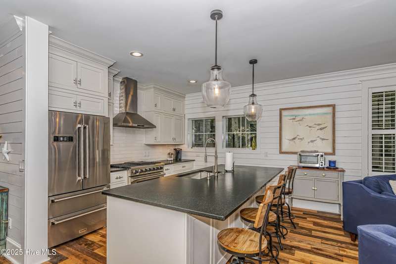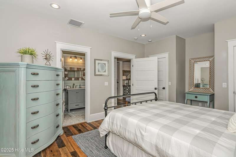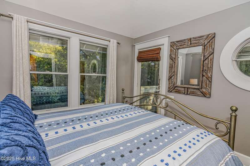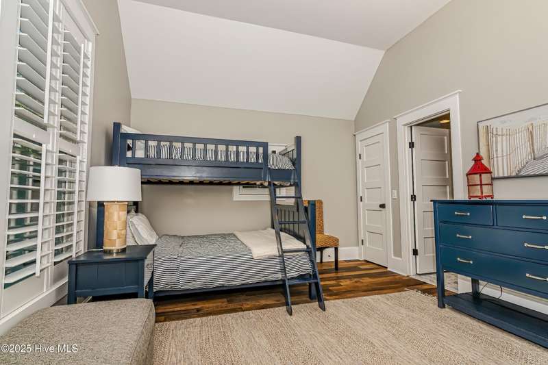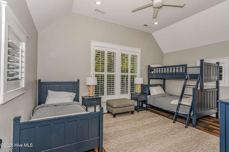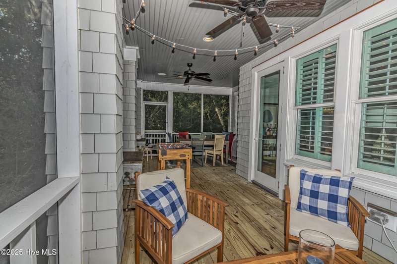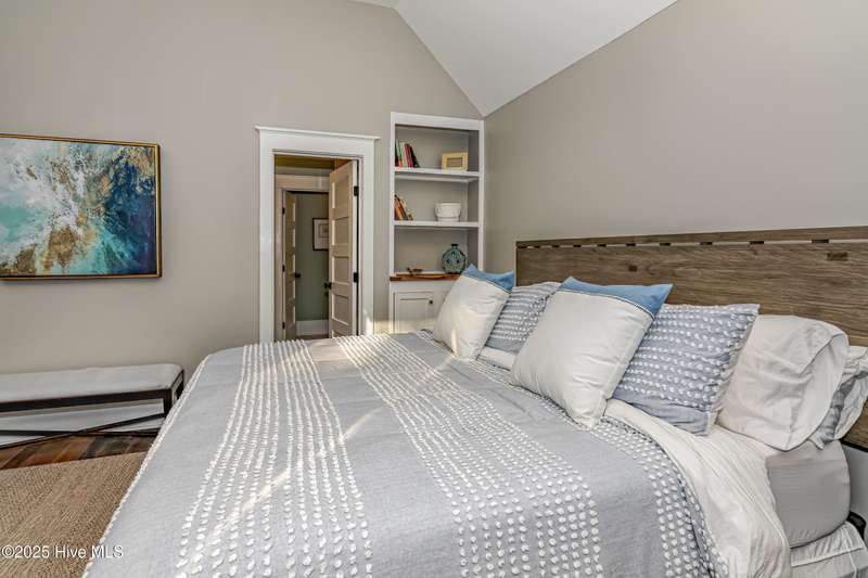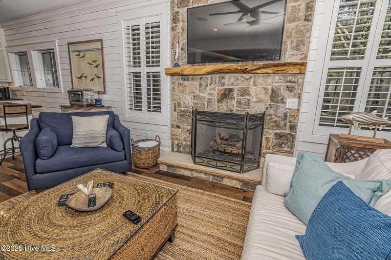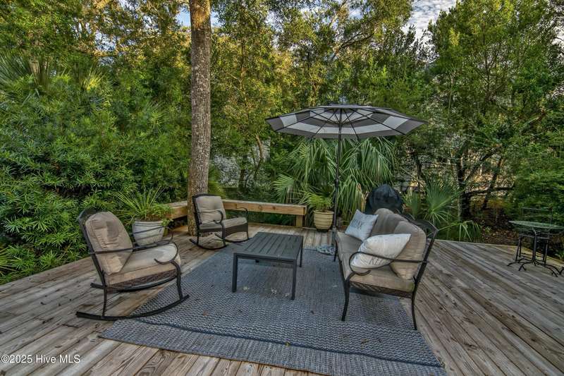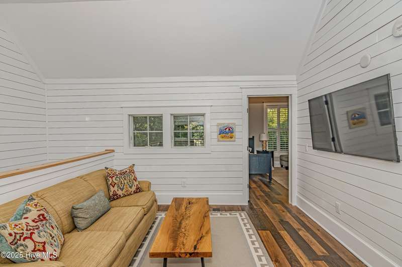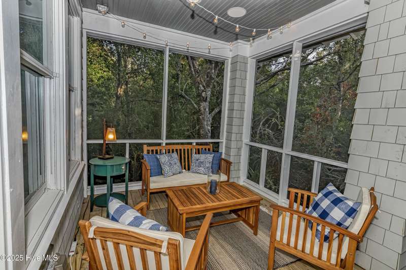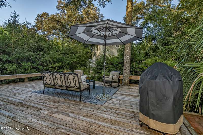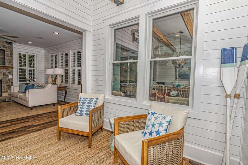 This secluded retreat in Keepers Landing boasts a recently renovated floor plan that features open spaces throughout the kitchen and living room. On cooler evenings, indulge in the ambiance of the living room gas fireplace, while the attached screened porch offers a picturesque overlook of the Maritime Forest. The dining space accommodates up to ten guests under a vaulted ceiling adorned with exquisite wooden beams. The first floor comprises a single bedroom (with a queen-sized bed and en-suite bathroom) and two additional bedrooms on the second floor. The primary bedroom features a king-sized bed and a separate bathroom, while the ''bunk room'' accommodates two twin beds and a double bed, along with a private bathroom. This floor also includes a designated entertainment area, ideal for movie viewing, reading, gaming, and puzzle-solving, as well as a laundry room. Bedroom four is situated in the separate crofter, which offers a queen-sized bed and a newly renovated en-suite bathroom. The crofter is situated above the cart garage, which also houses the outdoor shower, a collection of bicycles, beach chairs, umbrellas, and beach toys. This home is offered furnished with exclusions and a BHI Lifestyle and Shoals club membership for separate purchase.