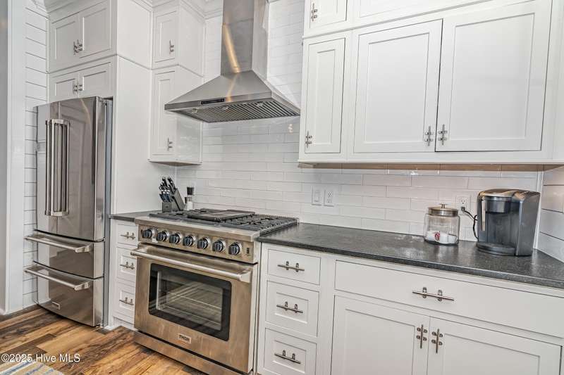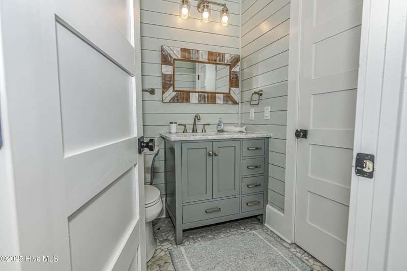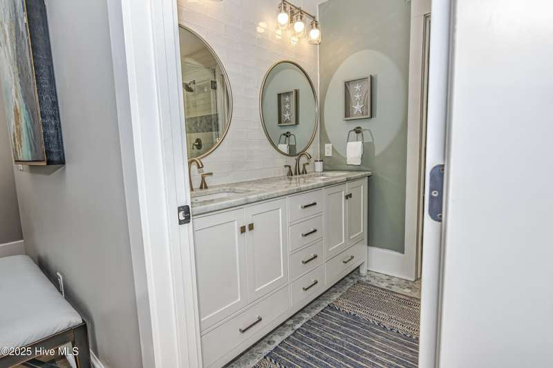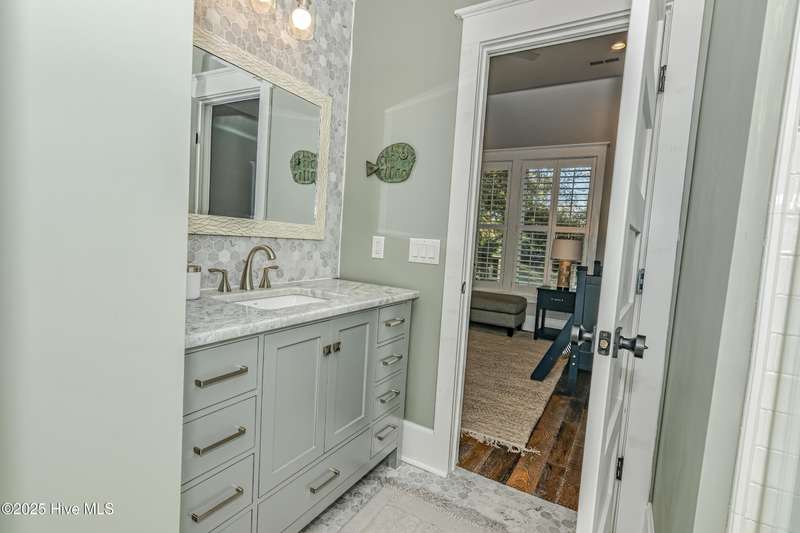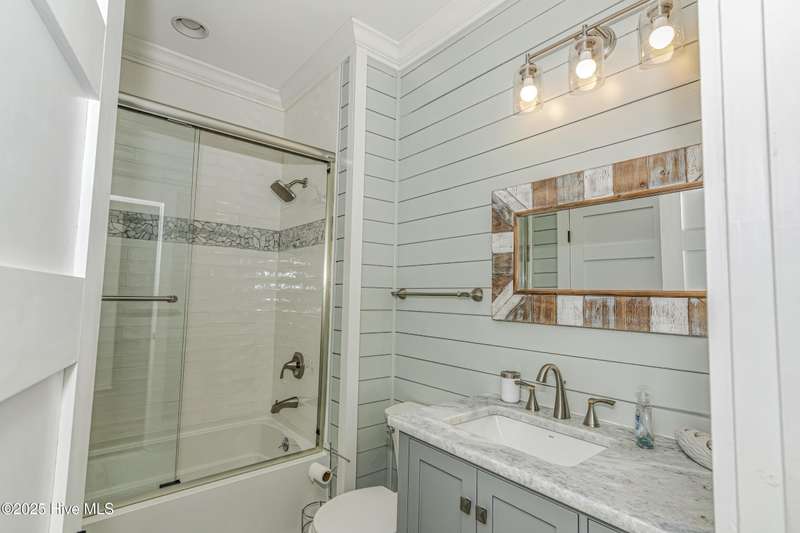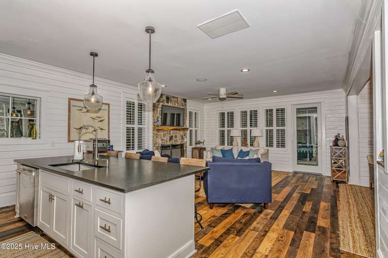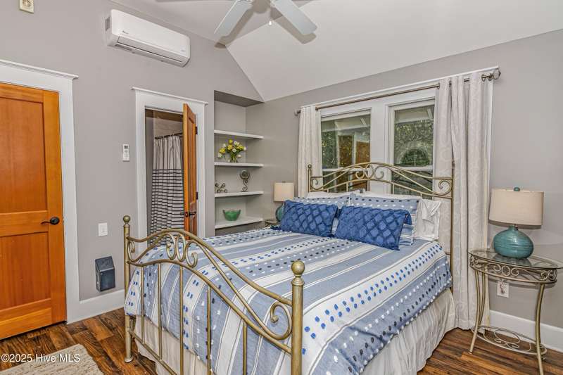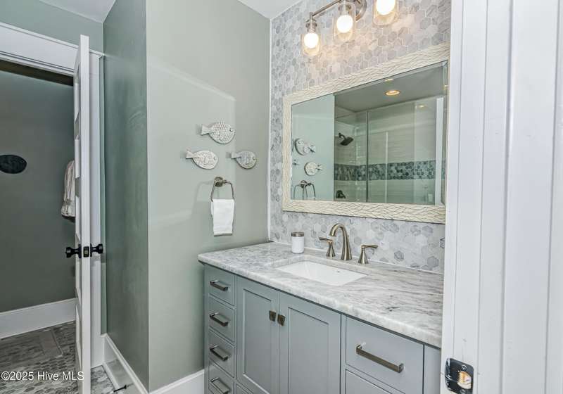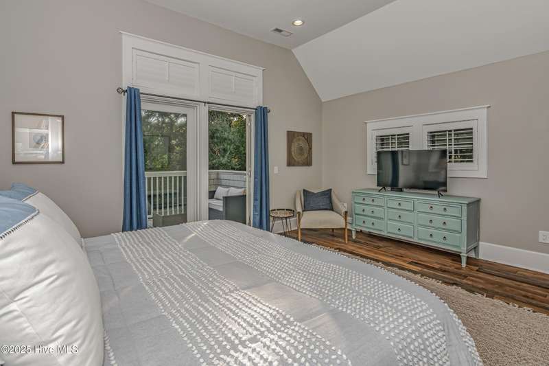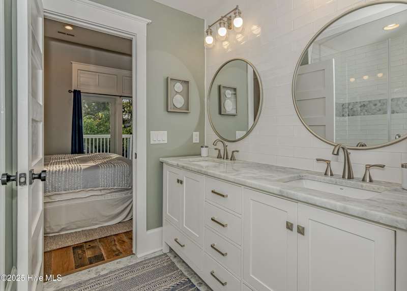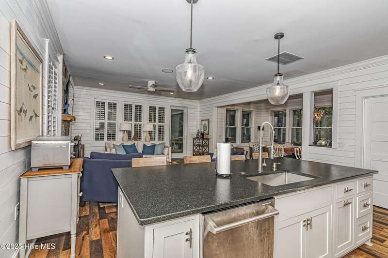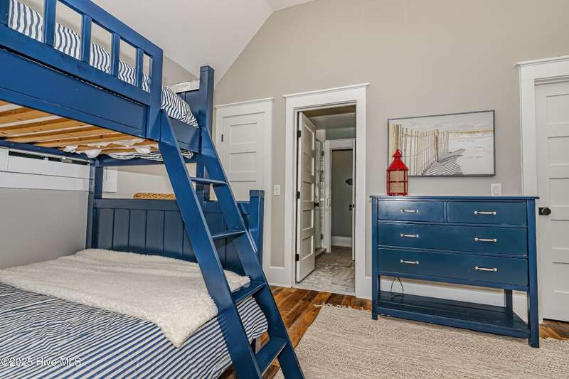 This secluded retreat in Keepers Landing boasts a recently renovated floor plan that features open spaces throughout the kitchen and living room. On cooler evenings, indulge in the ambiance of the living room gas fireplace, while the attached screened porch offers a picturesque overlook of the Maritime Forest. The dining space accommodates up to ten guests under a vaulted ceiling adorned with exquisite wooden beams. The first floor comprises a single bedroom (with a queen-sized bed and en-suite bathroom) and two additional bedrooms on the second floor. The primary bedroom features a king-sized bed and a separate bathroom, while the ''bunk room'' accommodates two twin beds and a double bed, along with a private bathroom. This floor also includes a designated entertainment area, ideal for movie viewing, reading, gaming, and puzzle-solving, as well as a laundry room. Bedroom four is situated in the separate crofter, which offers a queen-sized bed and a newly renovated en-suite bathroom. The crofter is situated above the cart garage, which also houses the outdoor shower, a collection of bicycles, beach chairs, umbrellas, and beach toys. This home is offered furnished with exclusions and a BHI Lifestyle and Shoals club membership for separate purchase.