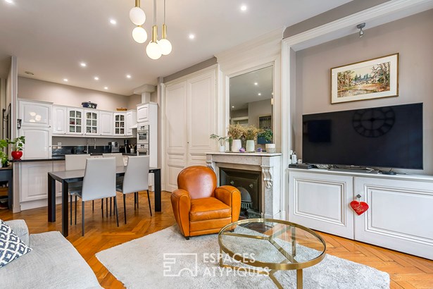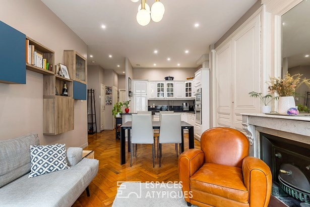 Near the banks of the Rhone and the prefecture, in the 3rd arrondissement of Lyon, this renovated old apartment of 73sqm carrez is located on the 2nd floor of an old building from 1900. The entrance opens onto a kitchen open to the south-facing living room, the central room of the apartment, is distinguished by its Hungarian-point parquet flooring, its fireplace and its high ceilings bringing charm and modernity.