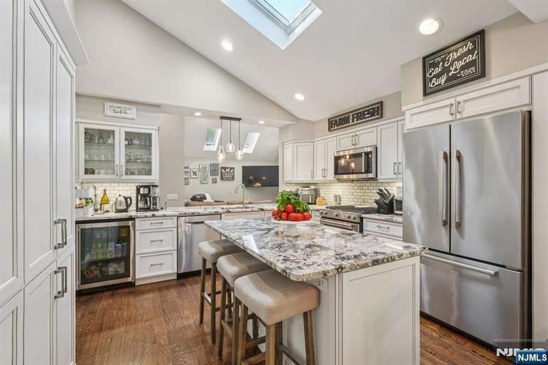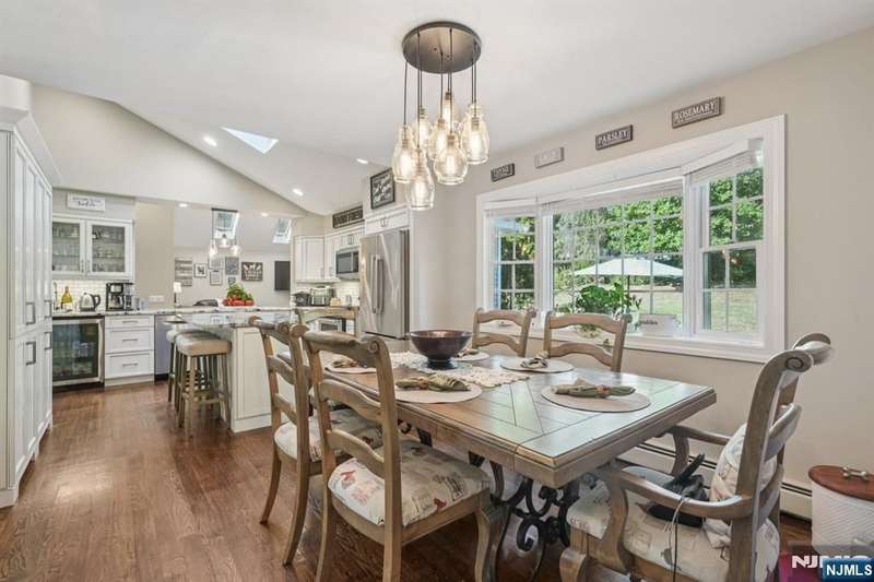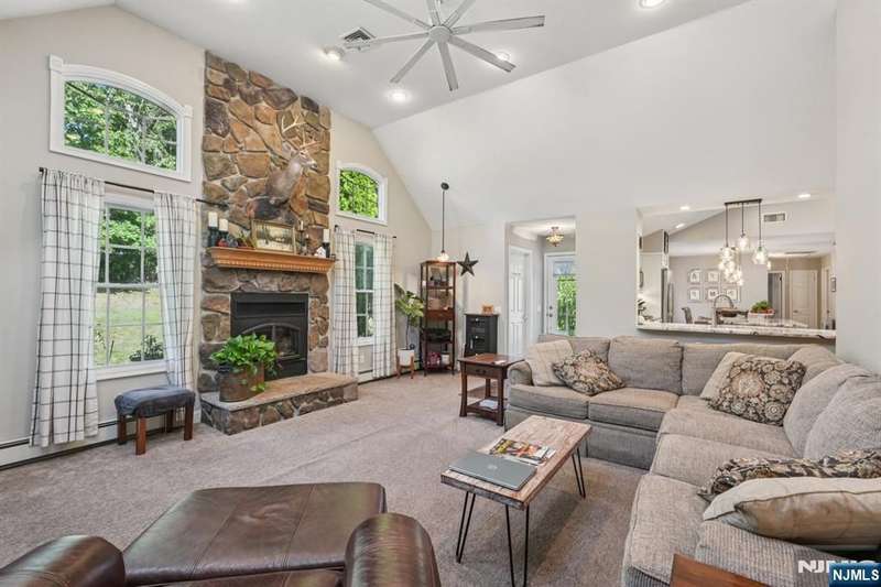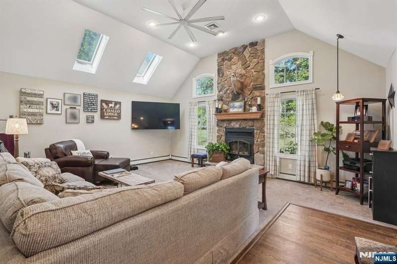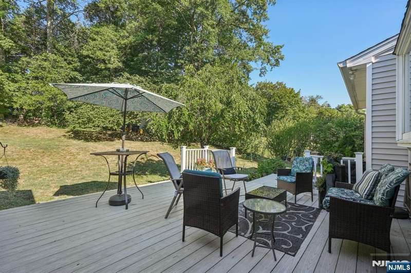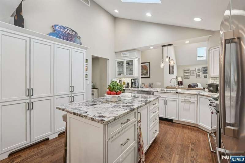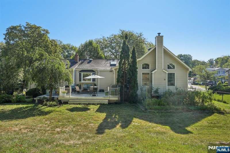 Welcome home to this beautifully maintained 3 bedroom, 3.5 bathroom Expanded Ranch nestled on a wooded lot in the heart of Wayne. Thoughtfully designed for easy one-floor living, this home offers a bright and inviting atmosphere throughout. Step into the spacious living room featuring large windows that fill the space with natural light. A wide cased opening leads into the elegant dining room, perfect for intimate dinners or entertaining. The eat-in kitchen is the heart of the home, boasting custom cabinetry, marble countertops, stylish backsplash, stainless steel appliances, a center island with barstool seating, skylights, and a custom pantry for ample storage. Seamlessly connected, the generous family room impresses with vaulted ceilings, large windows, skylights, and a cozy fireplace, creating the ideal space for relaxation and conversation. The primary bedroom features a large closet and en suite. Two additional bedrooms and two full baths and powder room provide comfort and convenience. The full, partially finished basement offers a versatile den, full bathroom, laundry, storage and garage access. Enjoy indoor-outdoor living with a rear patio and deck, perfect for grilling, al fresco dining, and entertaining, overlooking the spacious yard for gardening, play, or relaxation. A 1-car attached garage and ample driveway parking complete this home. Conveniently located near NYC transportation, shopping, and dining, this residence combines comfort, style, and function.