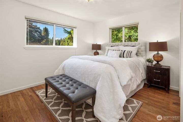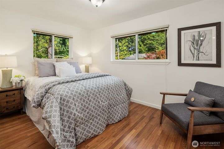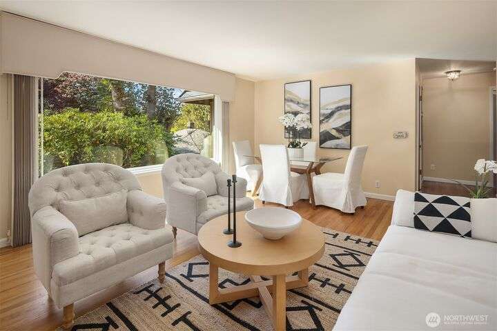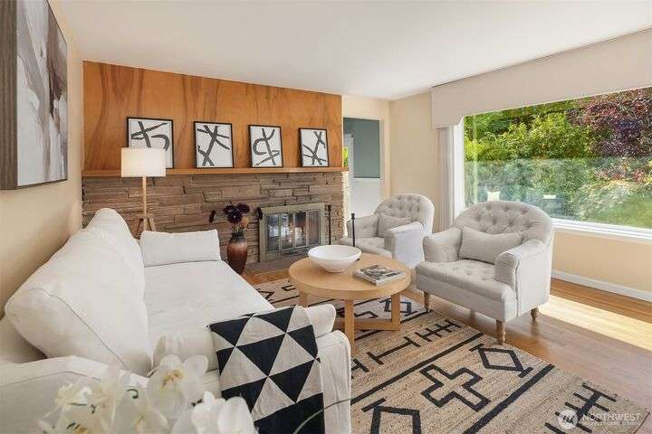 Bright 3-bedrooms/1.75-bathrooms rambler conveniently located in Richmond Highlands. Spacious living room with large picture window overlooking a secluded backyard. Primary suite includes private 3/4-bath. Full bath with skylight off hallway. Gleaming hardwood floors in living room and bedrooms. Private study with high ceiling and a slider opening to backyard patio. Walking distance to Richmond Highlands Park, Shorewood High School, Town and Country market, and many other amenities. Easy access to light rail and Downtown Seattle.