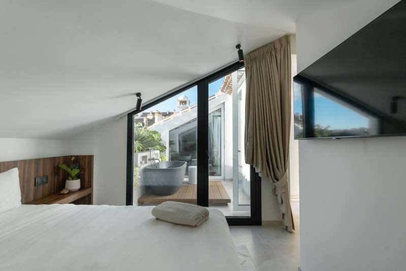 Nestled in the prestigious Nueva Andalucía, it offers an unparalleled living experience, combining the best of Californian-style living with the charm of Mediterranean elegance. This beautifully designed duplex penthouse, crafted by the renowned Archidom architects, spans 160 square meters of meticulously curated interior space, perfectly complemented by an expansive 82-square-meter terrace, ideal for enjoying the stunning views of the surrounding landscape. Step inside and discover a sophisticated layout featuring three spacious bedrooms, each with its own luxurious en-suite bathroom, offering complete privacy and comfort. The living areas are designed for both relaxation and entertaining, with a grand dining space that seamlessly flows into the living room. Custom-made furniture by Aldecora adds a touch of elegance and refinement to the space, creating a home that’s as functional as it is stylish. The true highlight of this exceptional penthouse is its private rooftop oasis. Ascend