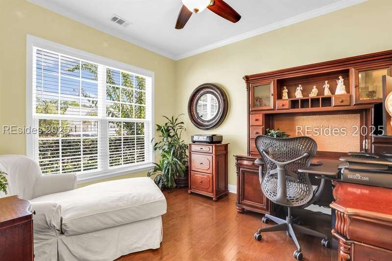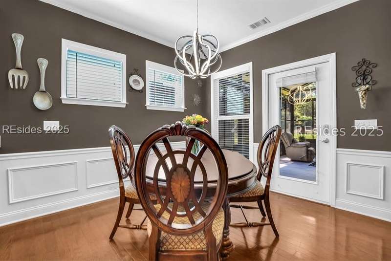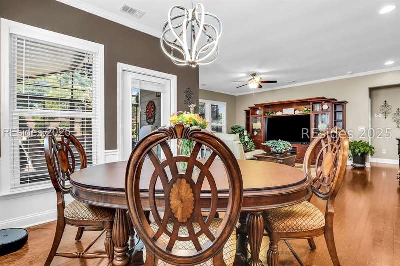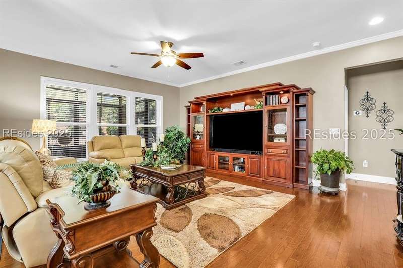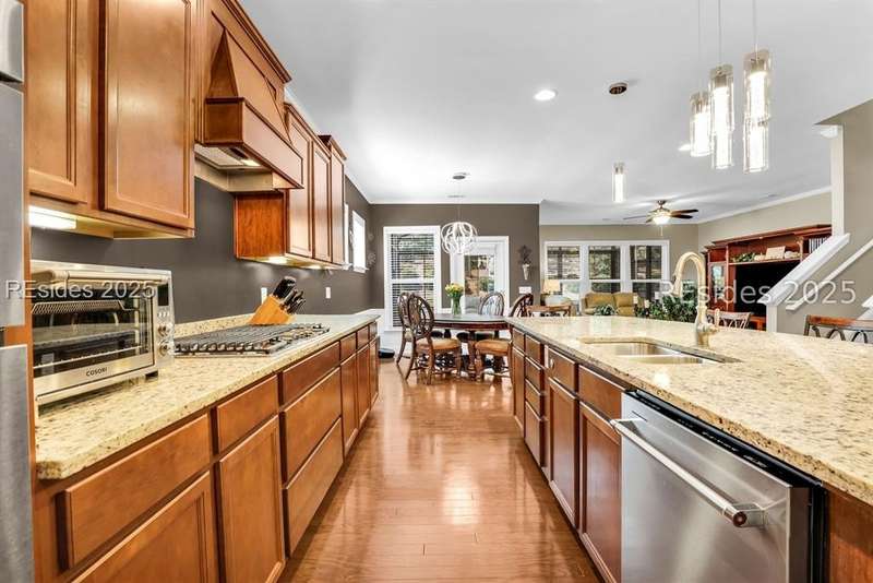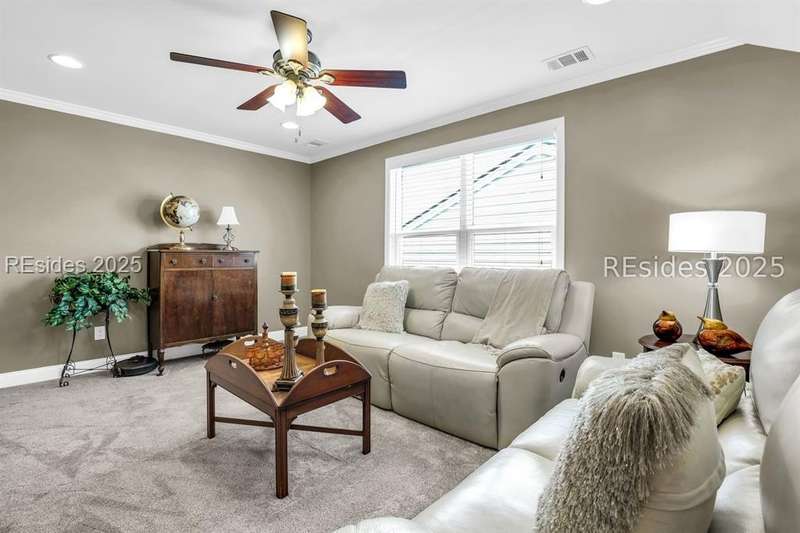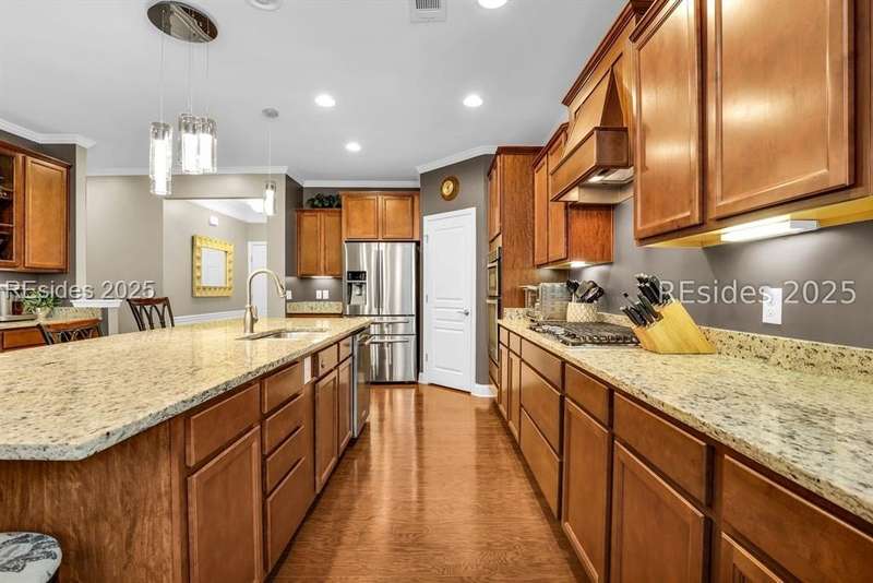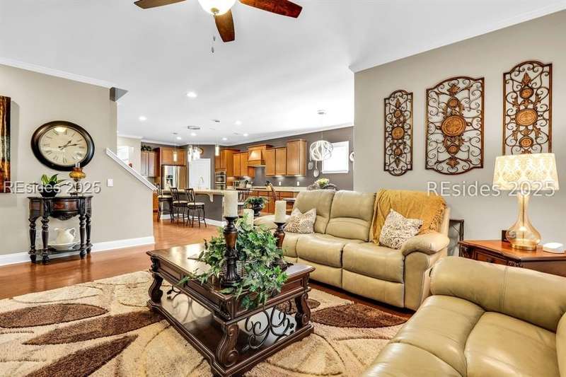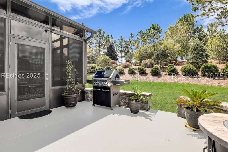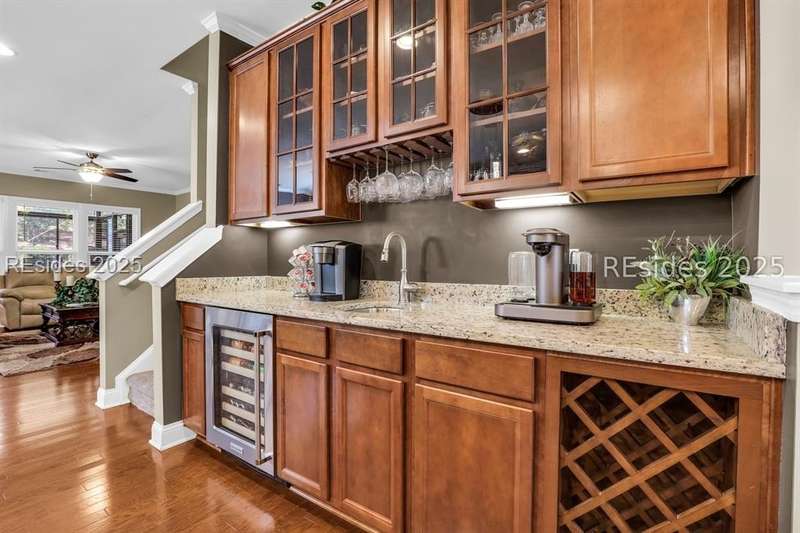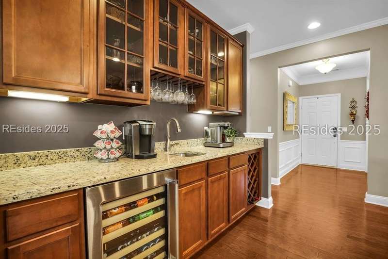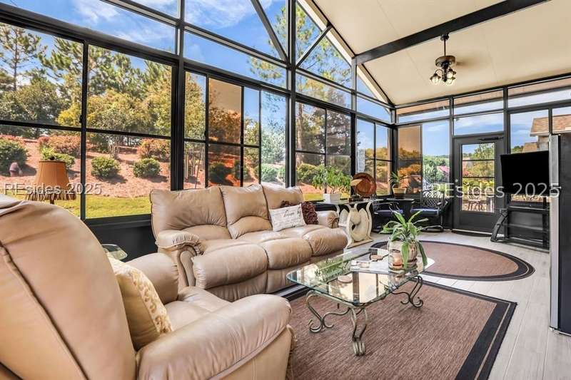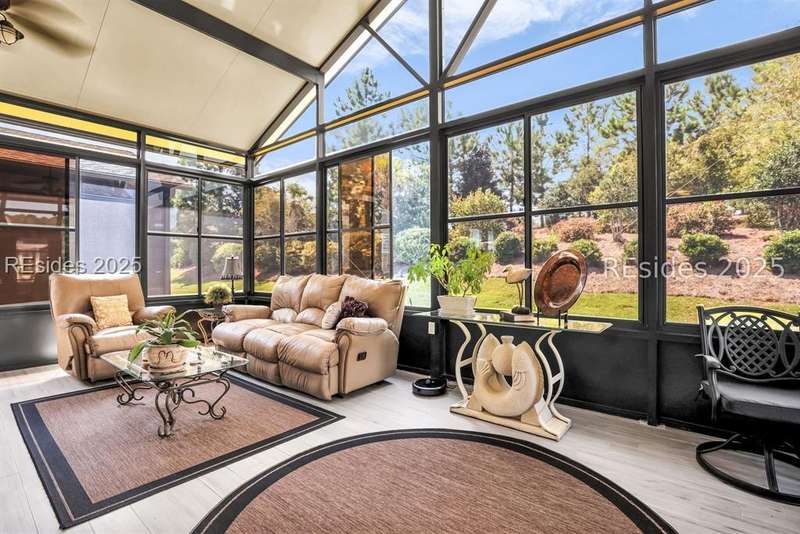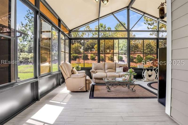 Beautiful Castle Rock Model in Sun City Hilton Head. This move-in ready 3BR/3BA home offers stunning landscape views and refined upgrades throughout. The gourmet kitchen features granite countertops, large island, 5-burner gas stove, wood cabinetry, and a complete wet bar with wine fridge, perfect for entertaining. Crown and chair molding add elegance to the main living spaces. Owners suite boasts a tray ceiling, tiled walk-in shower, and quartz counters. Upstairs, a spacious den with bedroom and bath provides the perfect guest retreat. Enjoy outdoor living in the enclosed sunroom. The oversized garage allows for parking, additional storage, or golf cart. Located in one of the premier active adult communities near Hilton Head Island, this home offers both luxury and lifestyle.