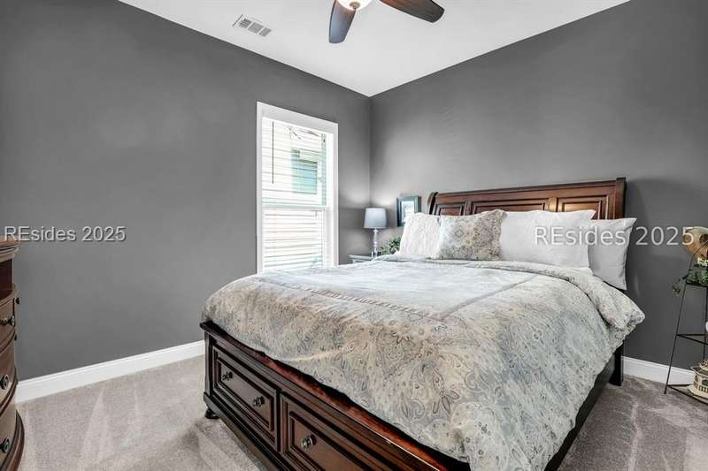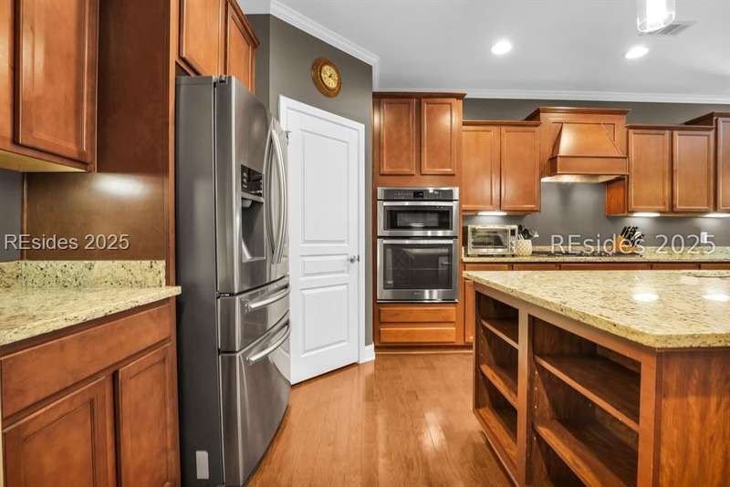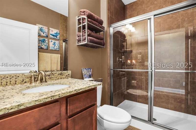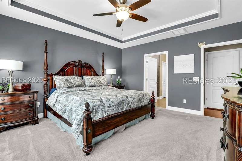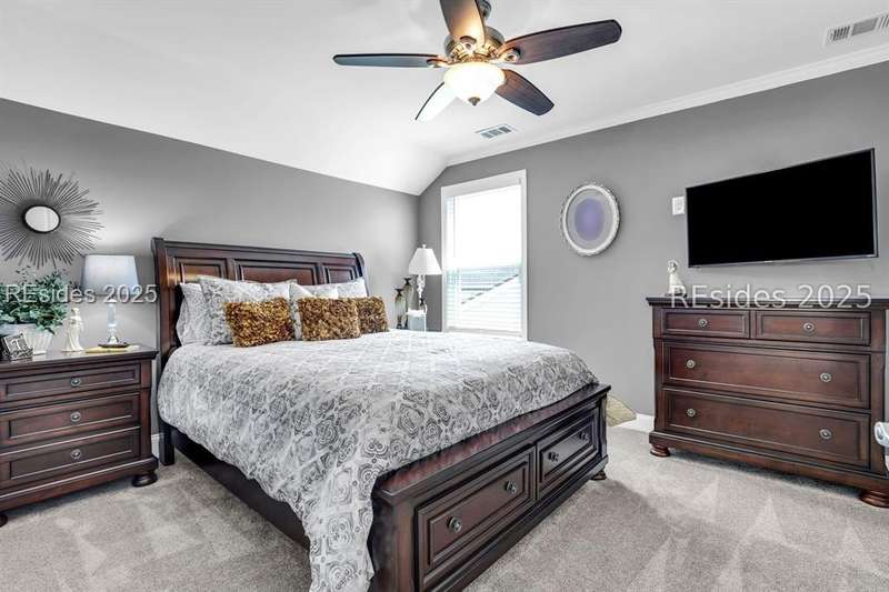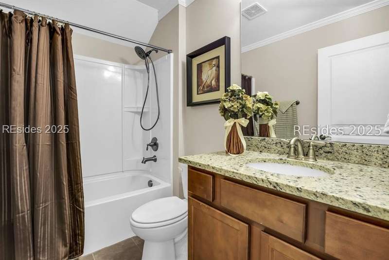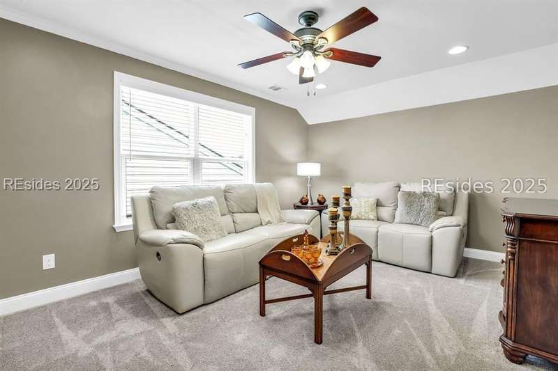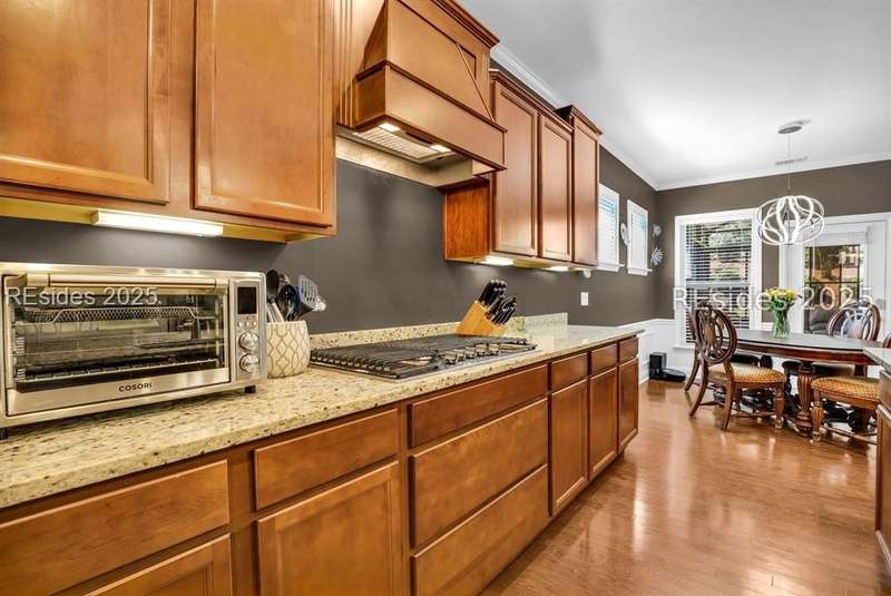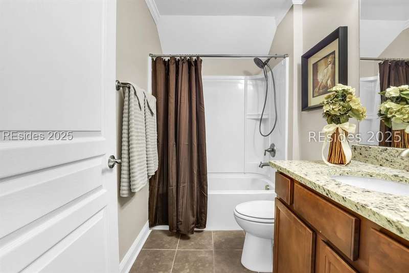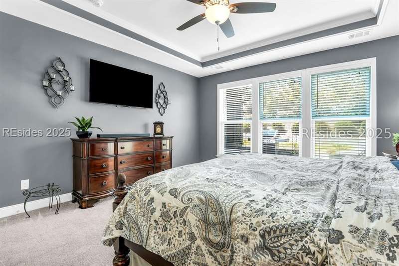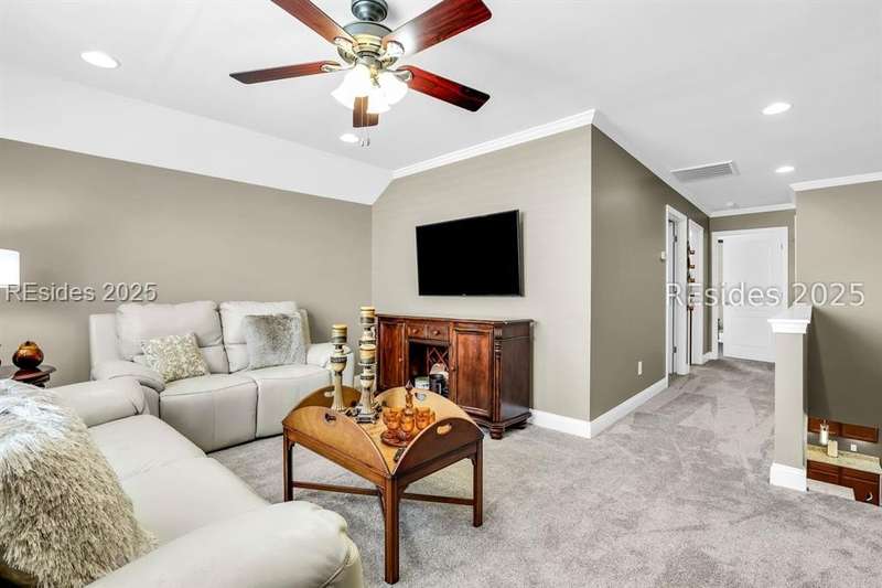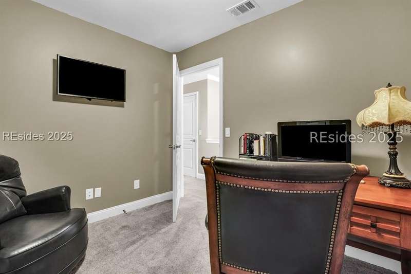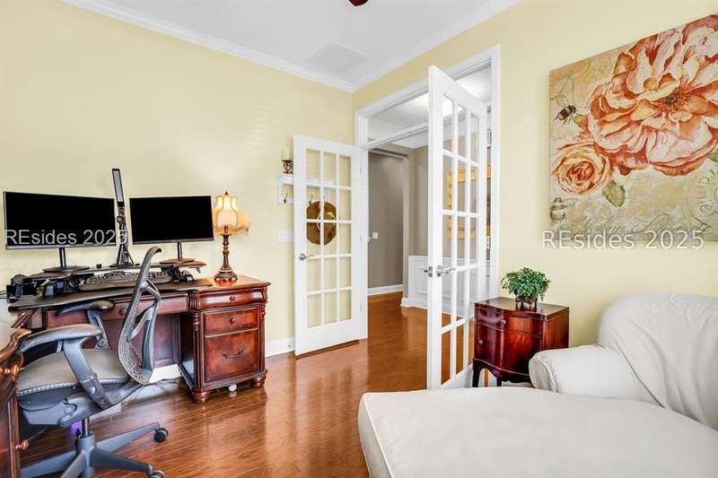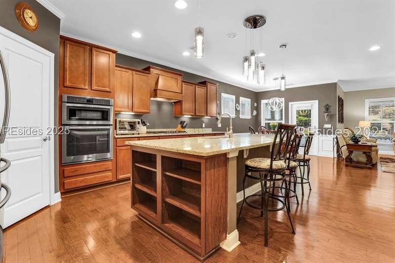 Beautiful Castle Rock Model in Sun City Hilton Head. This move-in ready 3BR/3BA home offers stunning landscape views and refined upgrades throughout. The gourmet kitchen features granite countertops, large island, 5-burner gas stove, wood cabinetry, and a complete wet bar with wine fridge, perfect for entertaining. Crown and chair molding add elegance to the main living spaces. Owners suite boasts a tray ceiling, tiled walk-in shower, and quartz counters. Upstairs, a spacious den with bedroom and bath provides the perfect guest retreat. Enjoy outdoor living in the enclosed sunroom. The oversized garage allows for parking, additional storage, or golf cart. Located in one of the premier active adult communities near Hilton Head Island, this home offers both luxury and lifestyle.