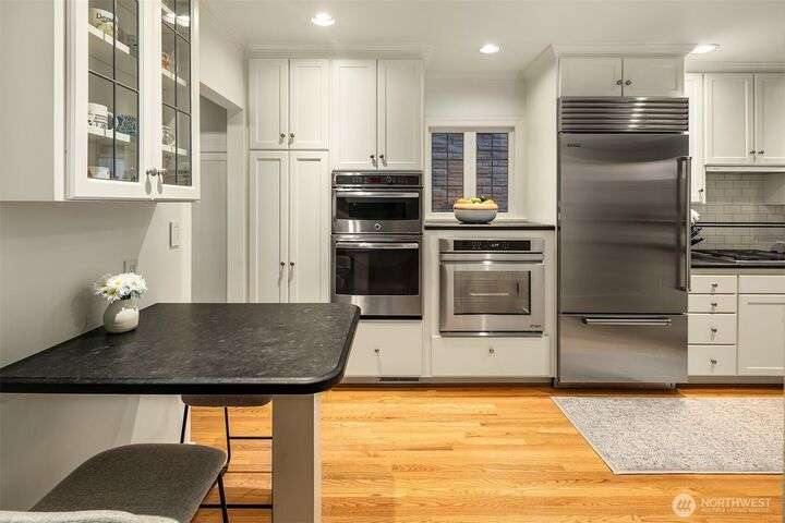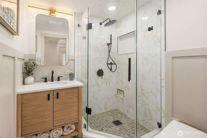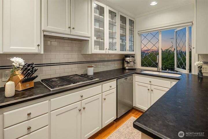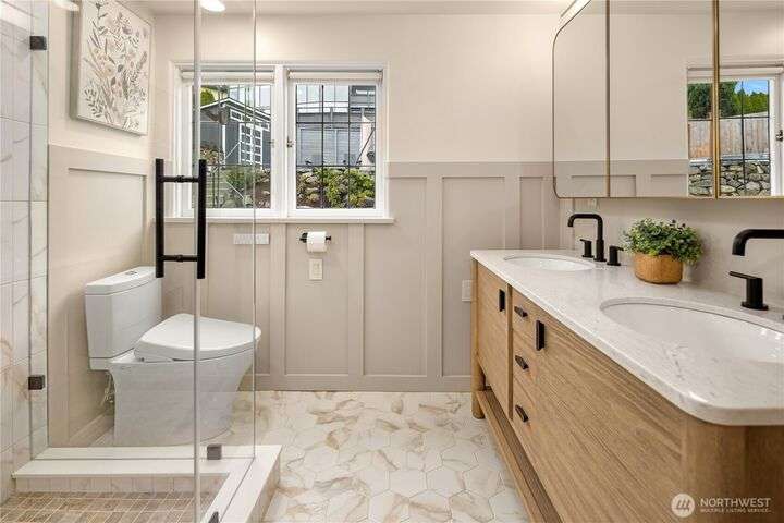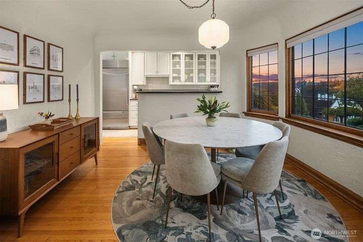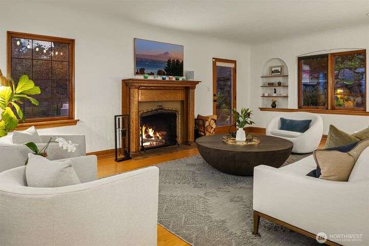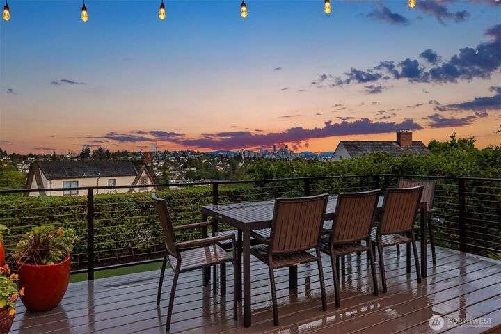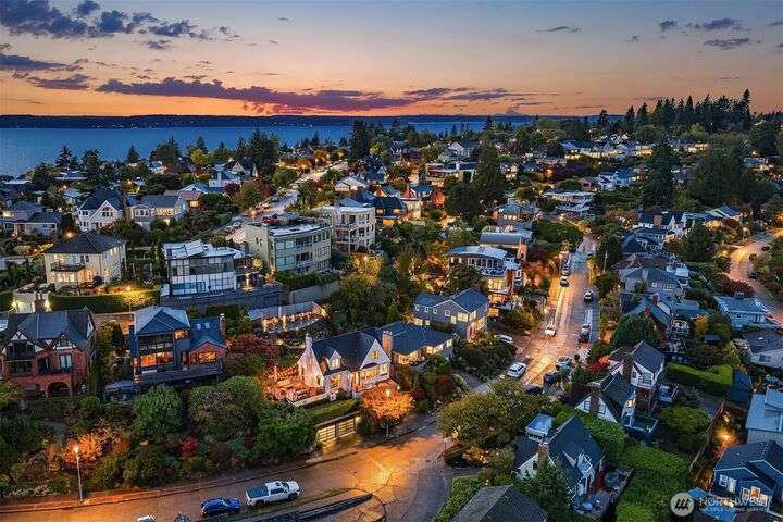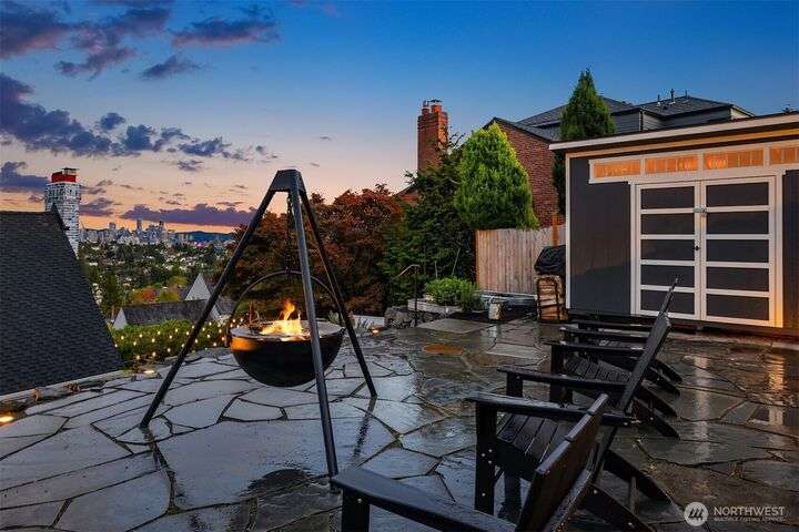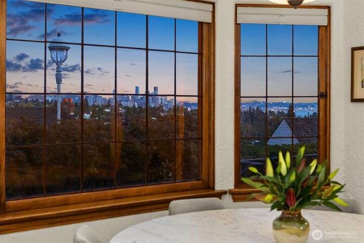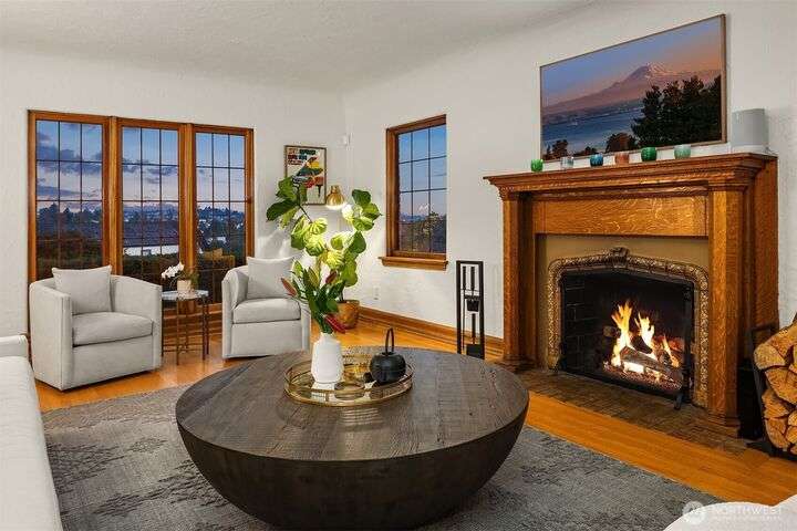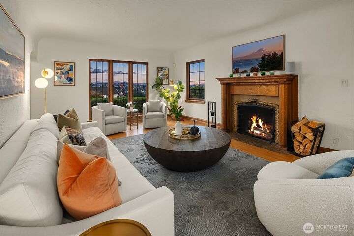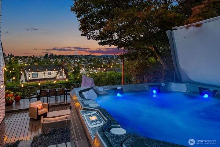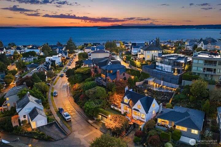 Perched high on Magnolia’s coveted west hill with underground wiring, this storybook Tudor delivers jaw-dropping Seattle views—Cascades and Mt. Rainier by day, city lights by night. Stylishly updated with central A/C, new roof, exterior paint and lighting, designer fixtures, and smart Lutron lighting throughout. The lower level WOWS with a speakeasy vibe and remodeled bath, laundry and mudroom, while upstairs offers three bedrooms with two new luxe ¾ baths with West Elm fixtures. Main floor blends period charm with an open kitchen/dining, sitting area, and generous living spaces. Outside, new Trex decking, saltwater hot tub, and a sprawling street-to-alley lot that has been leveled and lit up! Rare 3-car garage seals the deal.