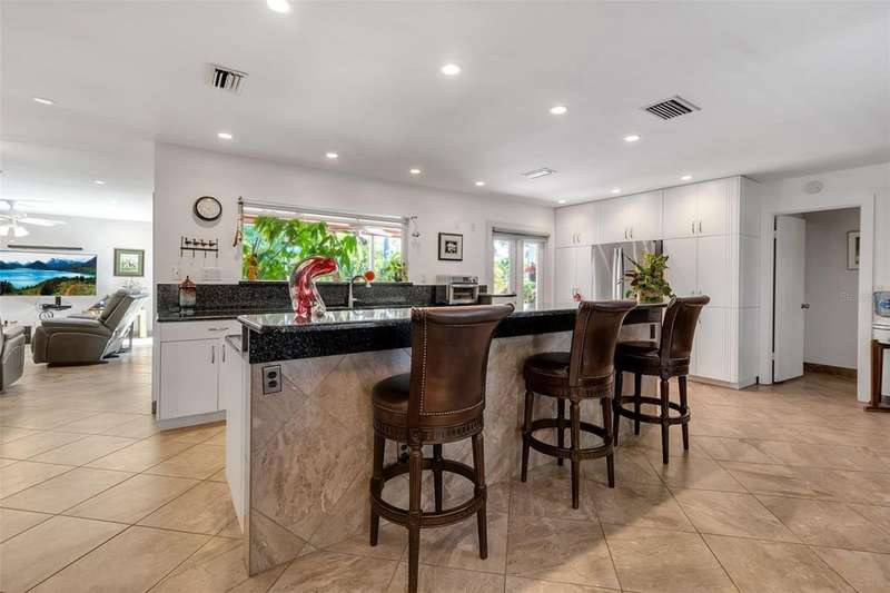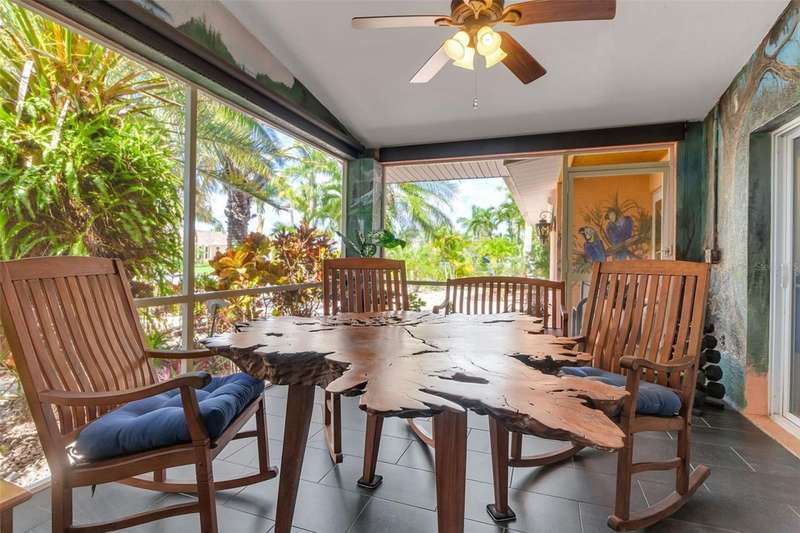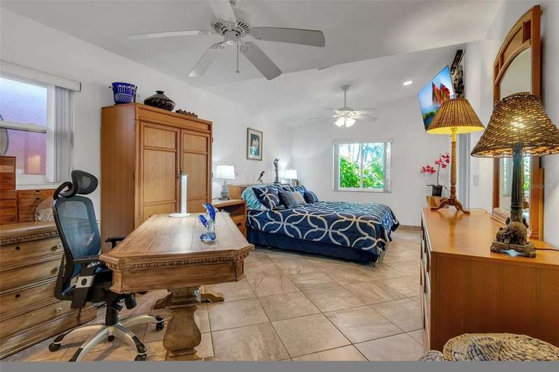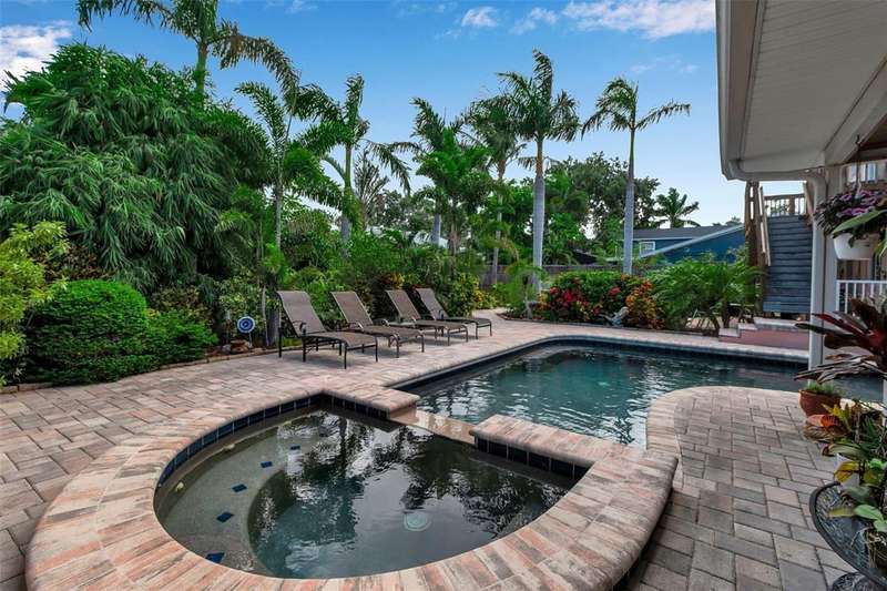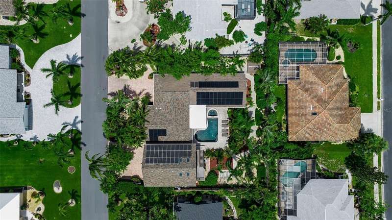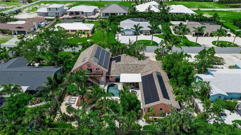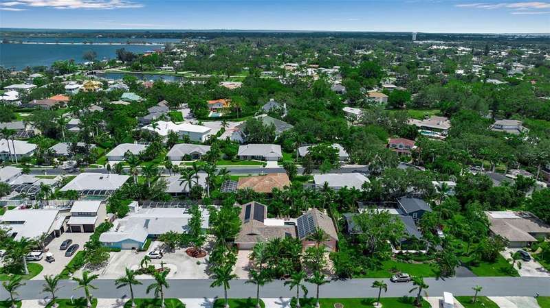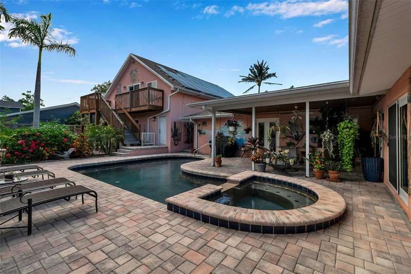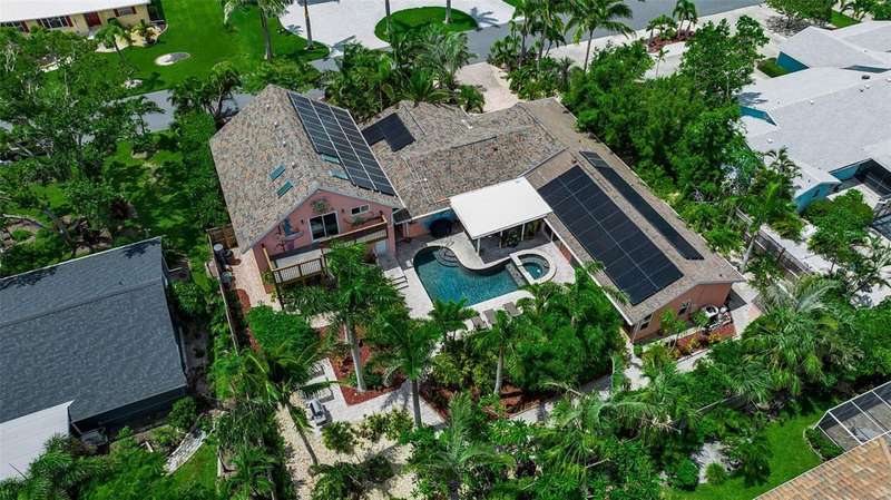 Just 800 feet from Palma Sola Bay and minutes from the white sands of Anna Maria Island, this custom 4-bedroom, 5-bathroom home offers exceptional flexibility, privacy, and indoor-outdoor living. Located on a quiet dead-end street, this property is ideal for multi-generational living, hosting guests, or simply enjoying your own private retreat near the coast.Inside, the split open-concept layout features two spacious primary suites, each with walk-in closets, tile flooring throughout, recessed can lighting, and a thoughtfully designed flow perfect for everyday living or entertaining. The paid-in-full solar system helps keep electric bills impressively low year-round.Outdoor spaces are equally impressive: relax in the screened front lanai or entertain under the covered back patio, overlooking the heated pool and spa. Both the attached and detached garages include electronic screen doors, allowing breezes while keeping bugs out.The detached 30x40 garage is a true standout-featuring 2+ car capacity, a concrete-encased 14' x 9' secure vault ideal for valuables or collectibles, a full bath downstairs, and a guest-ready upstairs with two bedrooms, another full bath, skylights, and a central living area. There's also plumbing and electrical in place to easily finish a kitchenette, making this space perfect for guests, adult children, or a potential mother-in-law suite.The exterior is as beautiful as it is unique, with paver driveways, winding garden pathways, and mature landscaping that includes a bamboo garden and cactus garden for a truly Florida-inspired setting.Located just a short bike ride to Potosueno Park and the Palma Sola Boat Basin, this one-of-a-kind home offers space, style, and location-just 4 miles from the beach.