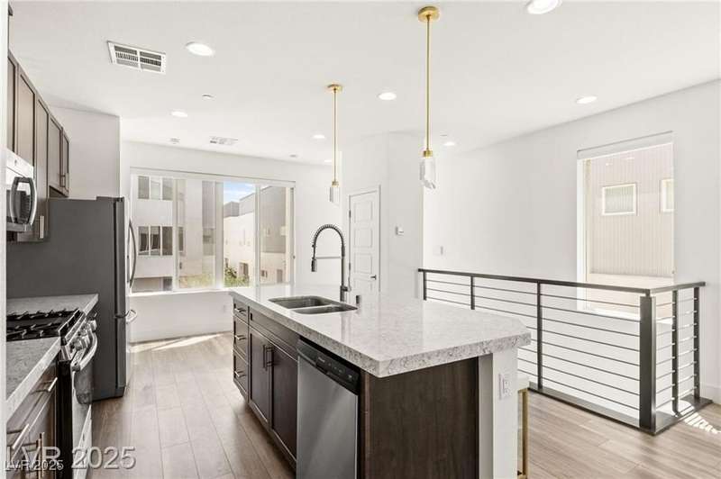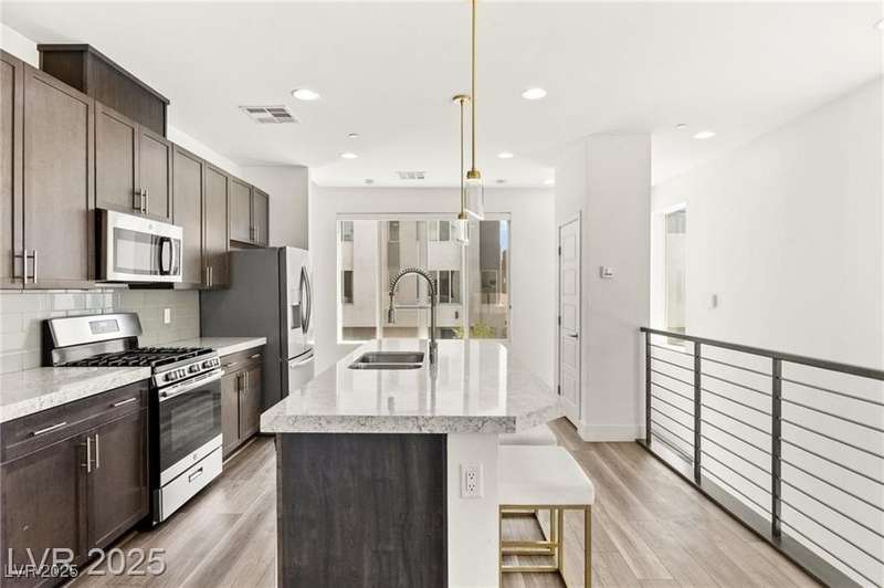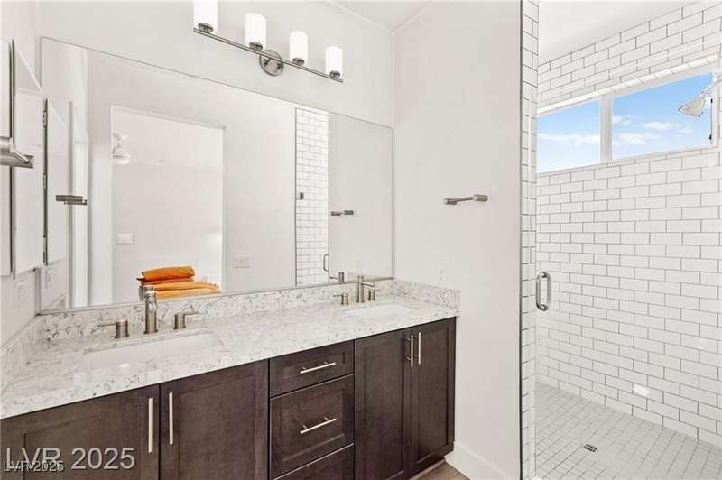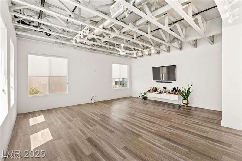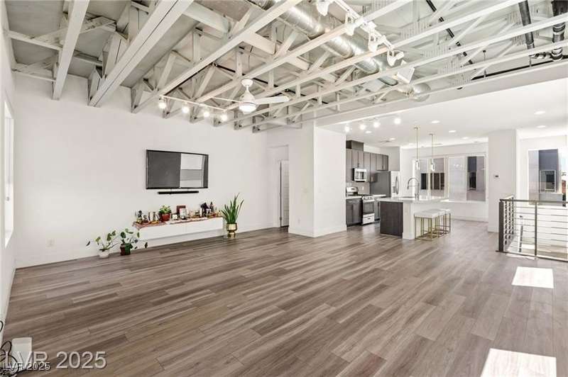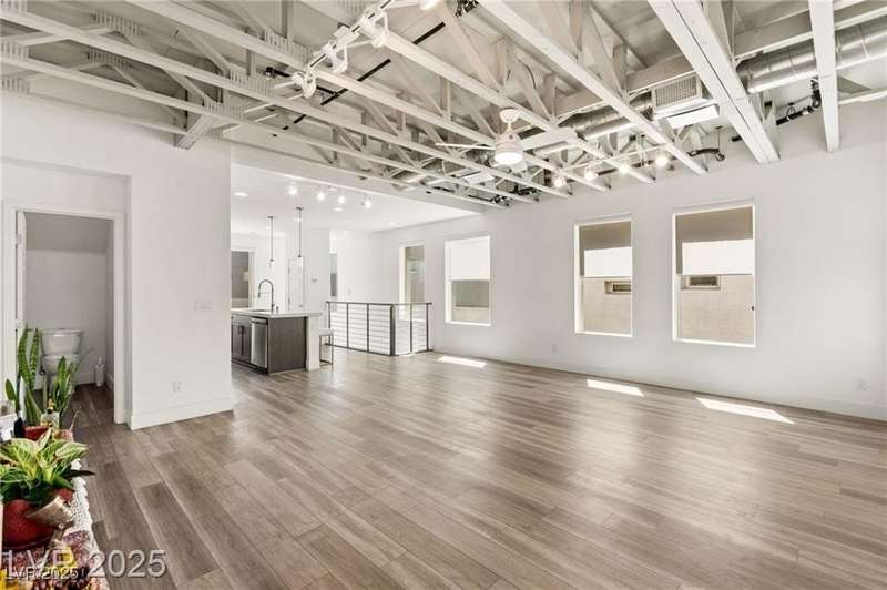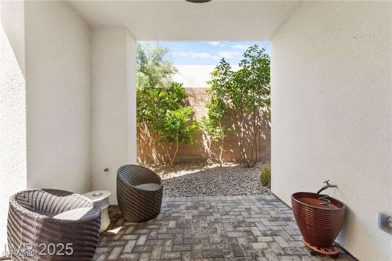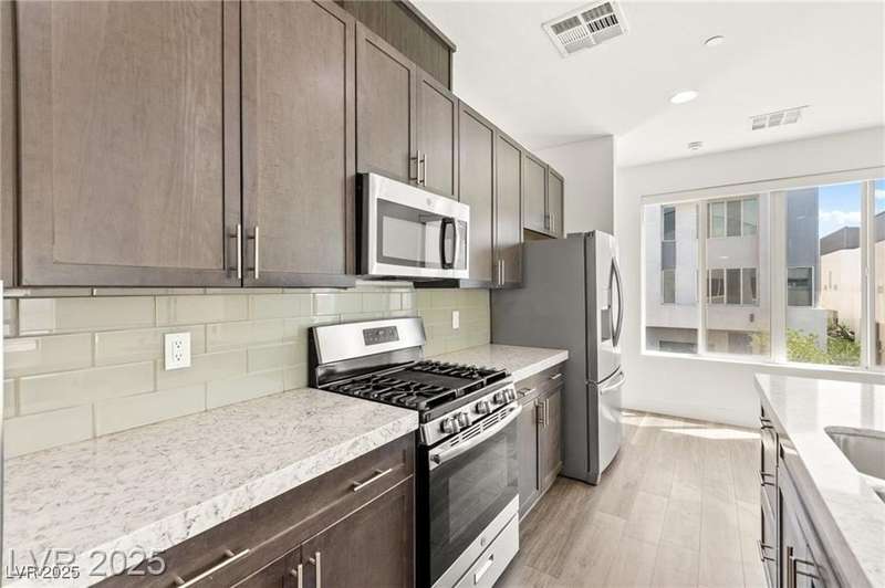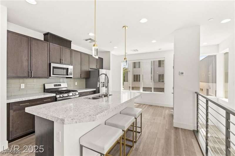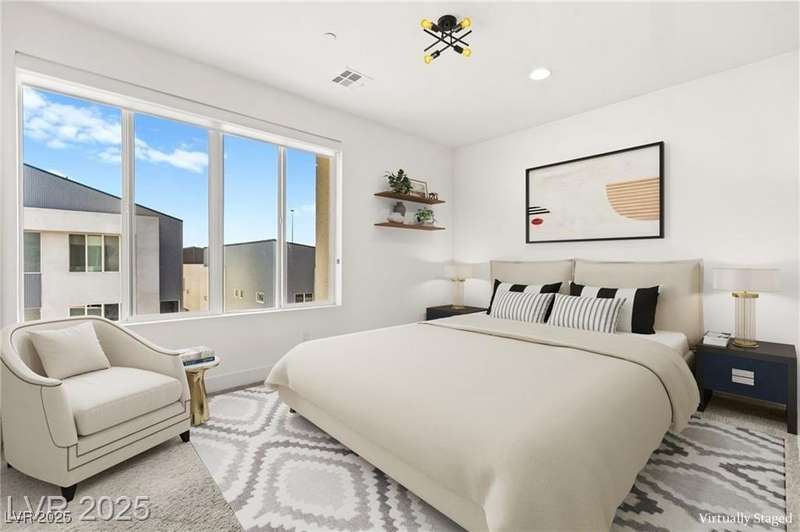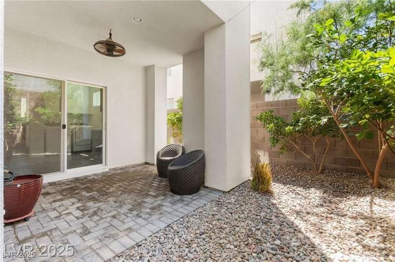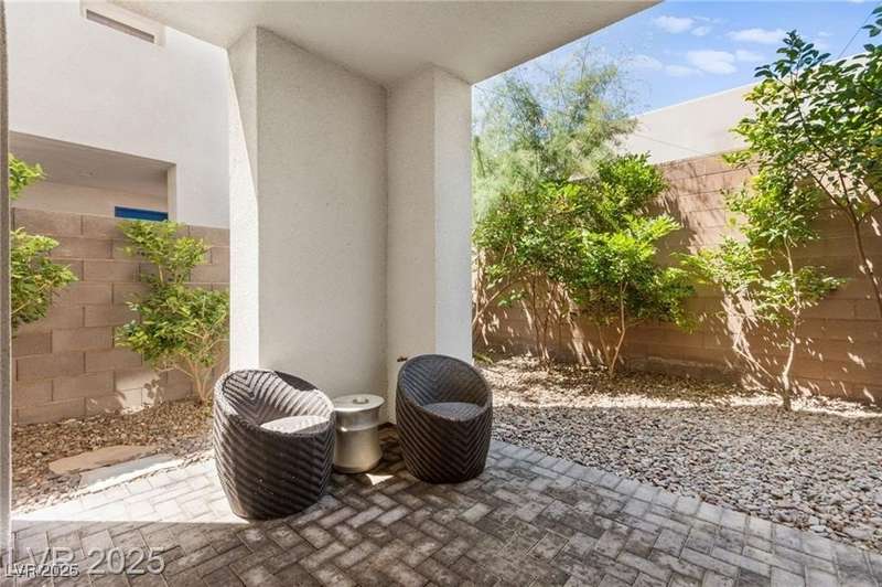 This modern-urban-industrial designed home offers exceptional living in a prime location, conveniently situated close to the Raider's Stadium, Town Square, and the vibrant Las Vegas Strip.The interior of this condo is designed with an open concept, featuring a stunning kitchen with stainless steel appliances, a spacious island that's perfect for entertaining, and a stylish subway tile backsplash. The living room is wonderfully light and bright, thanks to an abundance of windows, and boasts unique exposed ceiling beams that add to its modern aesthetic. The third-floor master suite is a true retreat, complete with a customized walk-in closet, a luxurious walk-in tile shower, and impressive views of the Strip. The second bedroom offers an en-suite style with its own attached bathroom, providing privacy and comfort. Additionally, the private backyard is designed for relaxation and ease, offering a covered patio, attractive pavers, and low-maintenance landscaping.