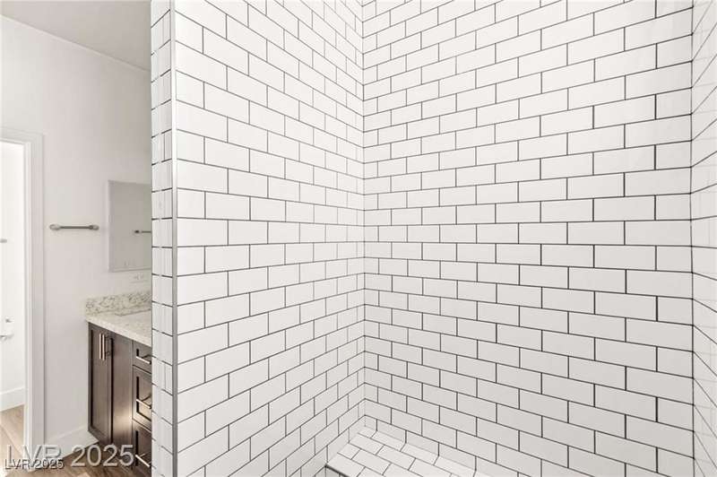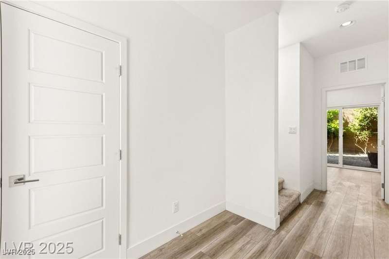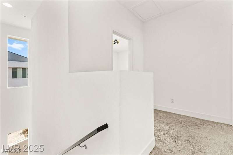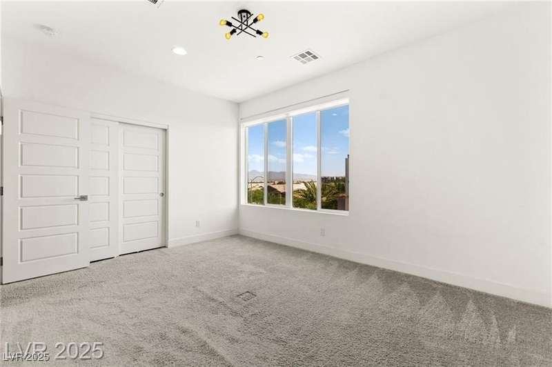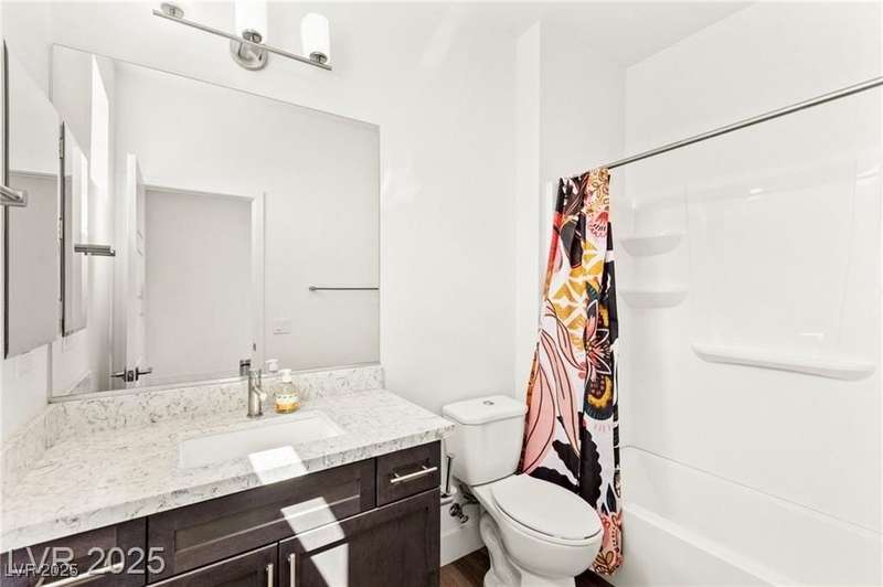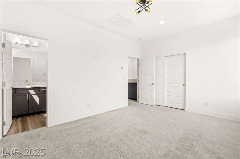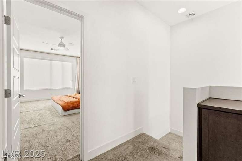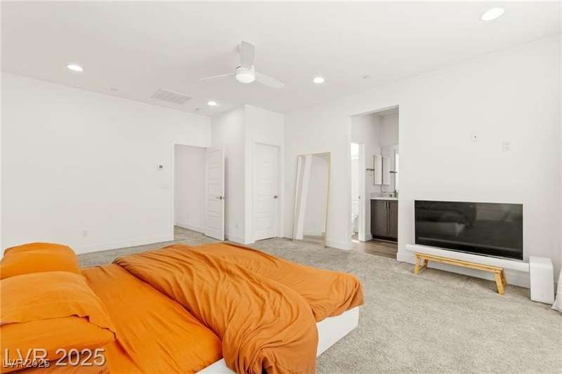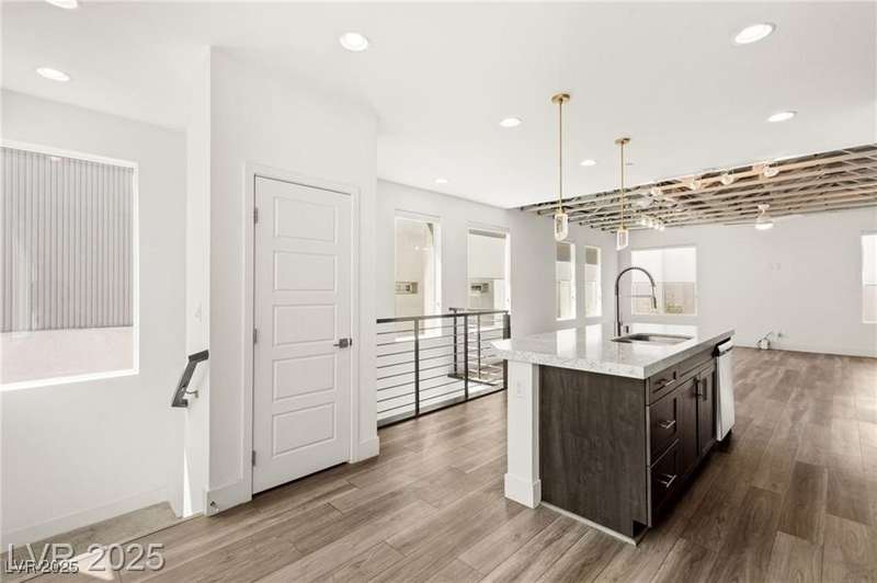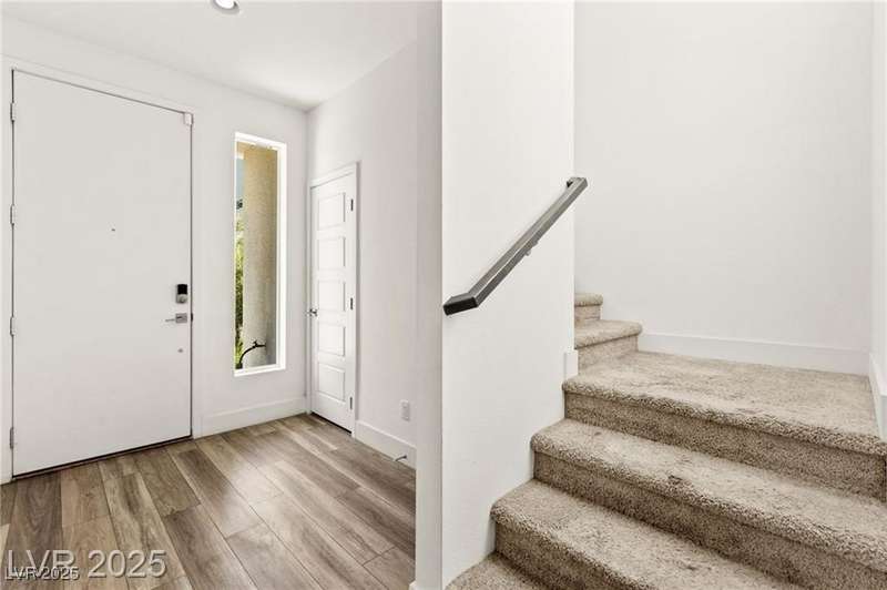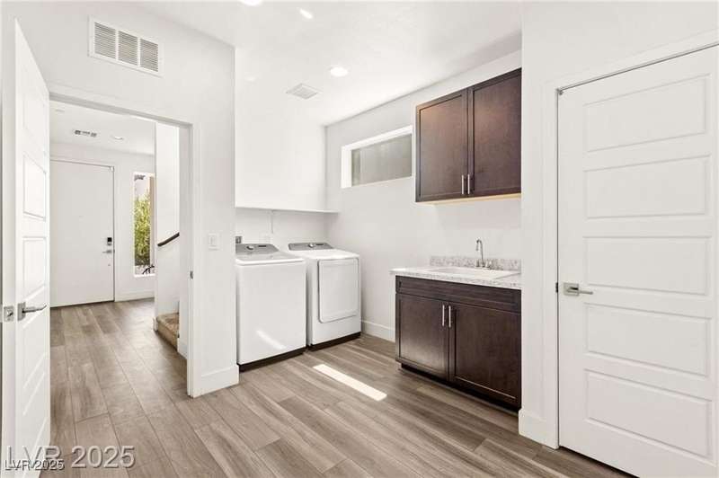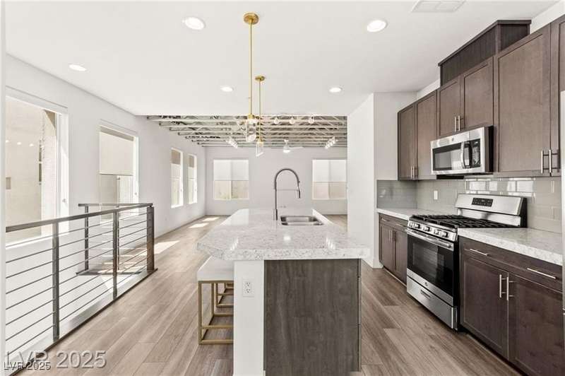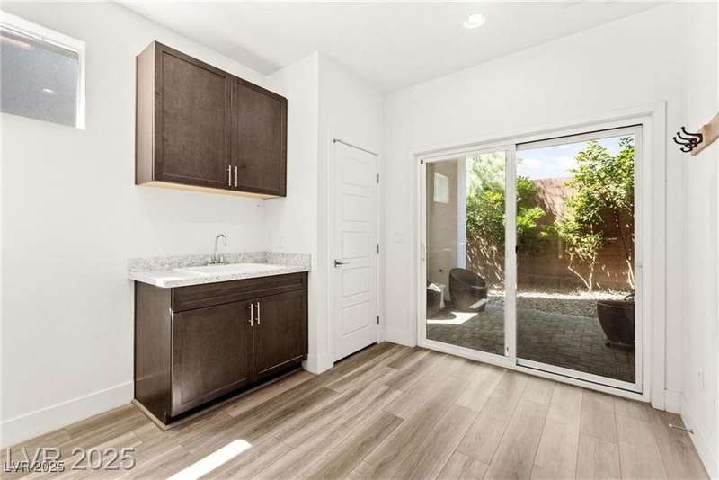 This modern-urban-industrial designed home offers exceptional living in a prime location, conveniently situated close to the Raider's Stadium, Town Square, and the vibrant Las Vegas Strip.The interior of this condo is designed with an open concept, featuring a stunning kitchen with stainless steel appliances, a spacious island that's perfect for entertaining, and a stylish subway tile backsplash. The living room is wonderfully light and bright, thanks to an abundance of windows, and boasts unique exposed ceiling beams that add to its modern aesthetic. The third-floor master suite is a true retreat, complete with a customized walk-in closet, a luxurious walk-in tile shower, and impressive views of the Strip. The second bedroom offers an en-suite style with its own attached bathroom, providing privacy and comfort. Additionally, the private backyard is designed for relaxation and ease, offering a covered patio, attractive pavers, and low-maintenance landscaping.