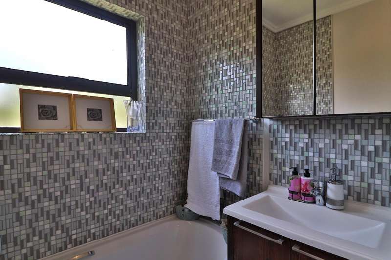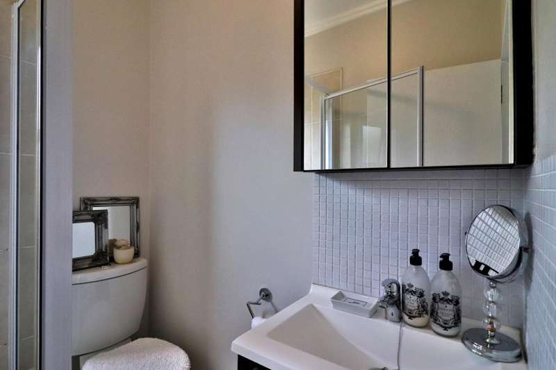 The spacious, light filled main bedroom is ensuite. The bathroom is equipped with a bath, a vanity with basin and cupboards below, and a toilet. The second bedroom also includes built-in cupboards, and the second bathroom offers a shower, basin, and toilet.