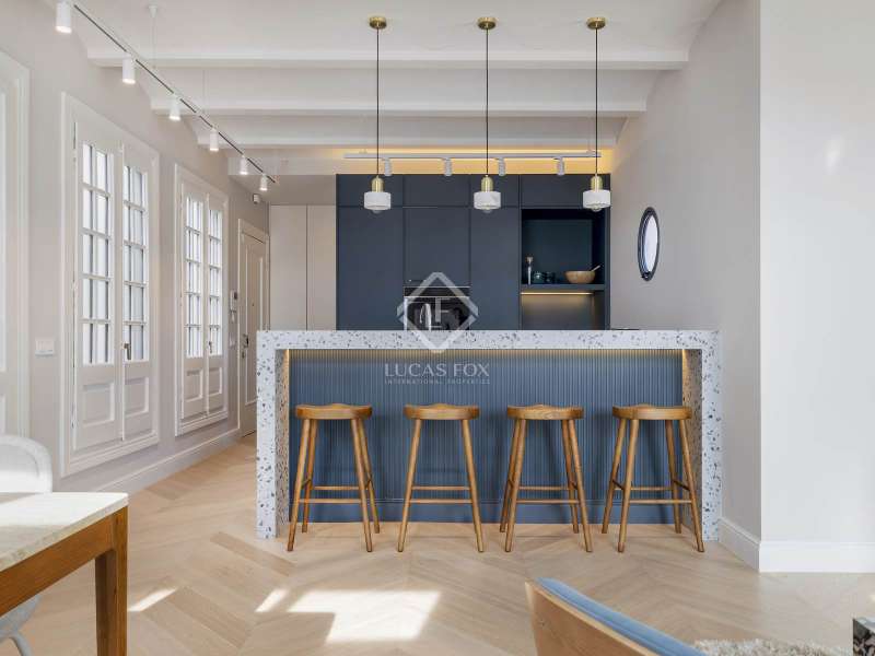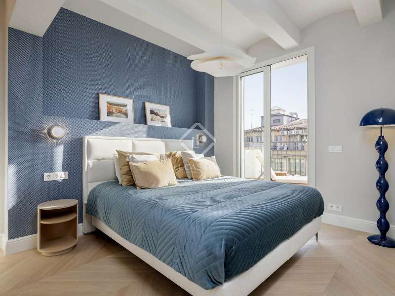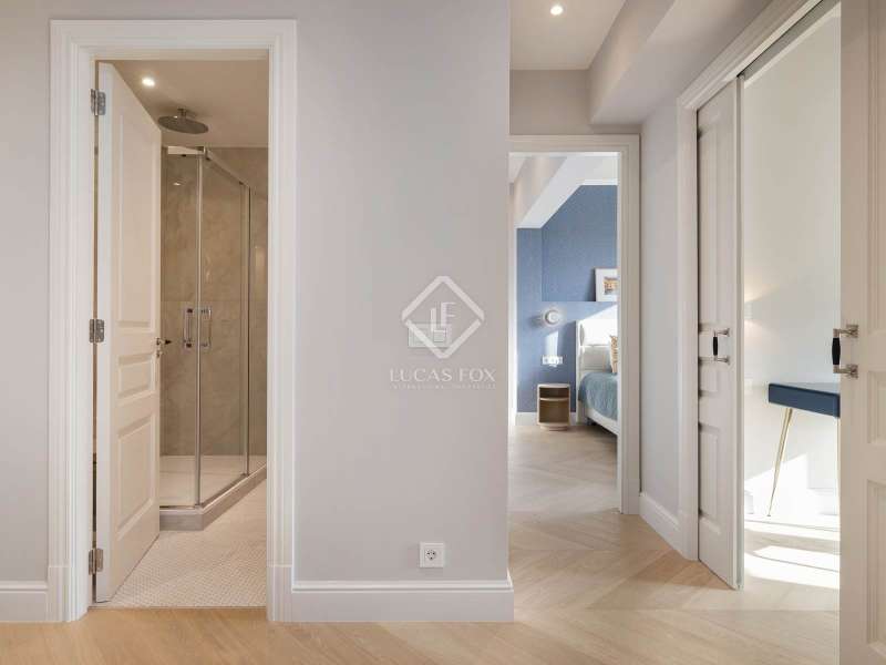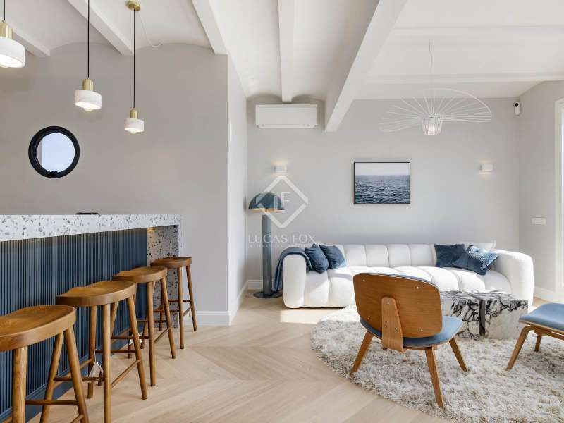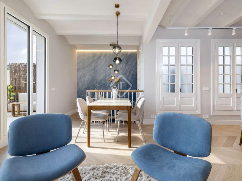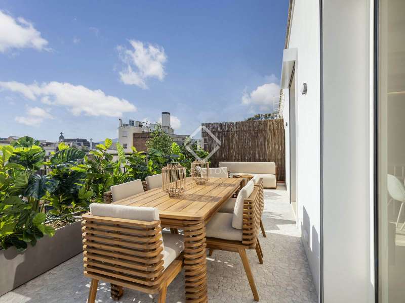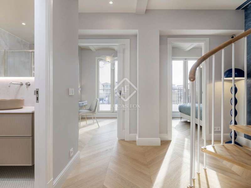 Located next to the former Ritz Hotel, this exquisite 133 m² apartment sits within a beautiful modernist building featuring a grand entrance hall and two original lifts. Nobohome has designed the 6th and top floor as the day zone, where a bright and spacious living room seamlessly integrates with a fully equipped open kitchen. This space extends onto a south-facing 22 m² terrace, perfect for enjoying the sun and city views. An elegant internal staircase leads to the 5th floor, the night zone. Here, two bedrooms share a stylish bathroom, while the main suite boasts a walk-in wardrobe and a private ensuite bathroom. Each of the three bedrooms enjoys direct access to a 18 m² balcony, enhancing the sense of space and light. In the hallway, discreet built-in wardrobes house the washer, dryer, and heat pump. Additionally, both floors have separate entrance doors, providing flexibility and convenience. This stunning penthouse blends modern comfort with timeless elegance in one of Barcelona’s most sought-after locations. Please contact us for further information.