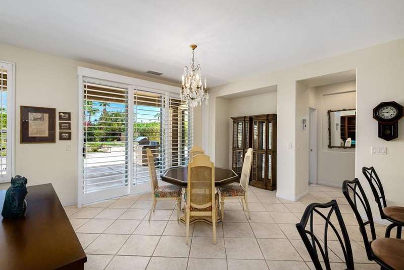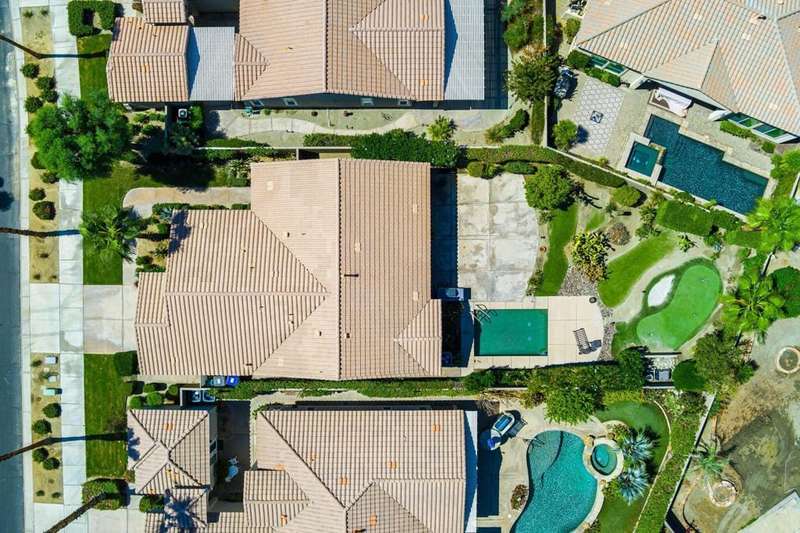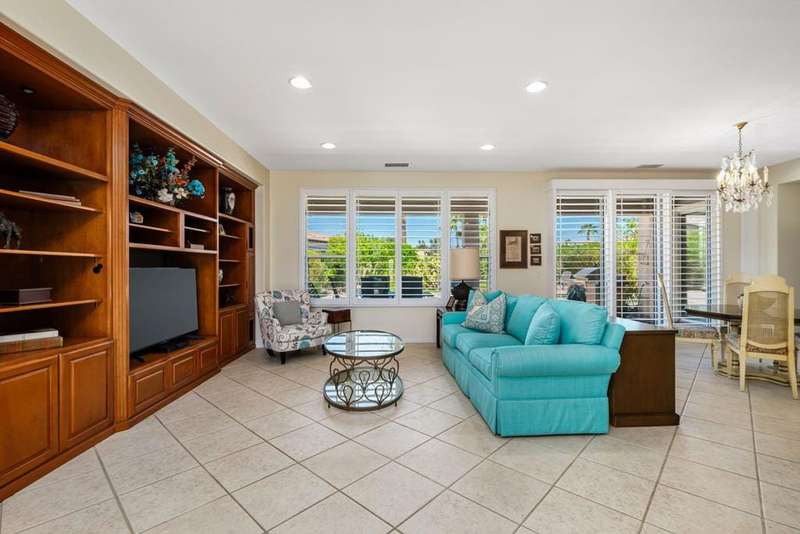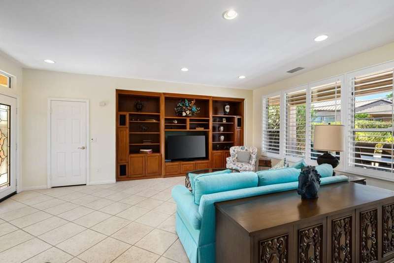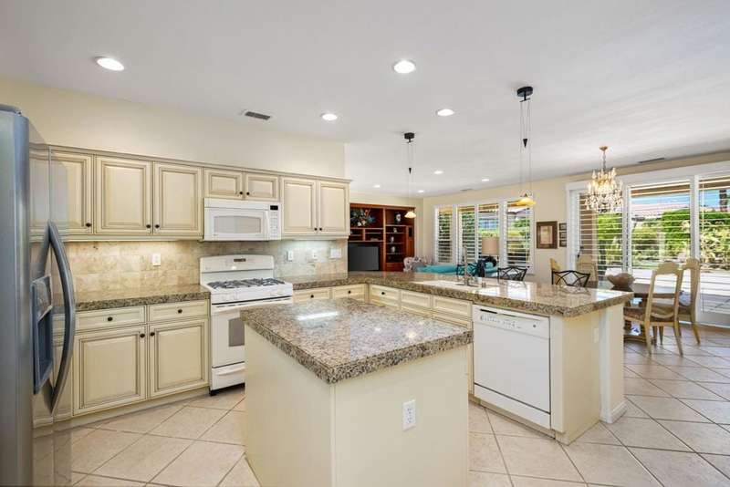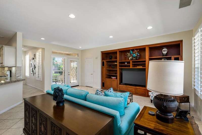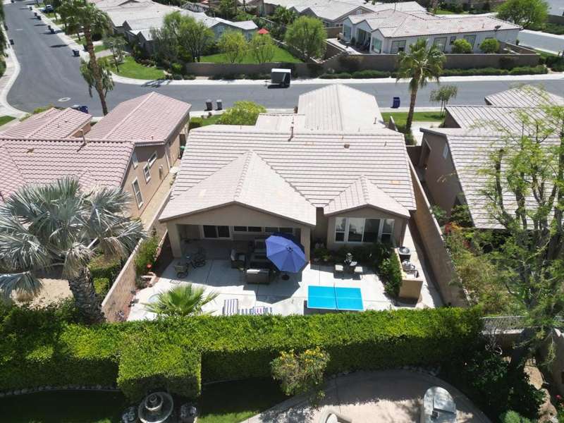 Situated within the prestigious 55+ gated community of Trilogy La Quinta, this impeccably maintained Oasis floor plan offers an exceptional blend of refined interior living and vibrant outdoor lifestyle. Sited on an expansive 9,000 square foot lot, the residence features approximately 1,580 square feet of thoughtfully designed living space, encompassing 2 spacious bedrooms and 2 well-appointed bathrooms. Enter through a custom etched glass front door into a light-filled great room enhanced by a built-in media and entertainment center, elegant plantation shutters, and a seamless flow into the adjacent dining area with a dedicated hutch niche. The gourmet kitchen is adorned with granite countertops, upgraded cabinetry, a central prep island, built-in microwave, gas range and oven, dishwasher, and a generously sized walk-in pantry--perfect for entertaining or everyday culinary pursuits. The private primary suite showcases a bay window with views of the backyard, direct access via sliding glass doors, and an en suite bathroom complete with dual vanities, tiled countertops, a walk-in shower, and a spacious walk-in closet. Designed for year-round enjoyment, the resort-style backyard is a true entertainer's dream--featuring a rectangular Pebble Tec pool, an extended patio cover, built-in BBQ station, concrete deck, and a professionally installed PGA-style putting green. This remarkable property offers both comfort and luxury in one of the desert's most sought-after active adult communities. A must-see for discerning buyers--schedule your private showing today.