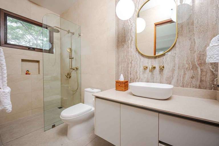 The villa features three elegant bedroom suites, each offering spa-like en-suite bathrooms and calming views of the gardens or poolside terraces. Every space is thoughtfully curated to provide tranquility and privacy.