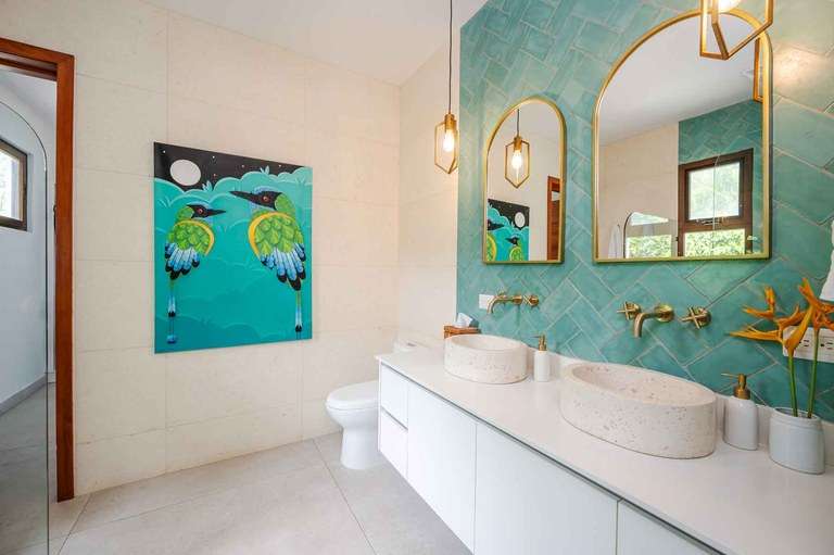 The villa itself embodies tropical modern design, with soaring ceilings, clerestory windows, and expansive glass doors that allow sunlight and breezes to flow freely throughout. The spacious open floor plan creates seamless indoor-outdoor living, enhanced by natural textures, handcrafted tilework, and rich tropical hardwood finishes.