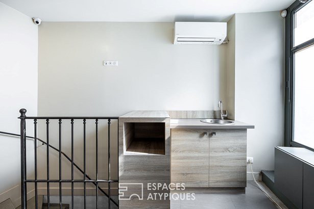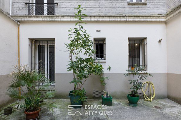 The commercial space is sold with a two-room apartment that opens onto both the street and the courtyard. It is accessible via the building's common areas but could be connected internally to the main space if desired.