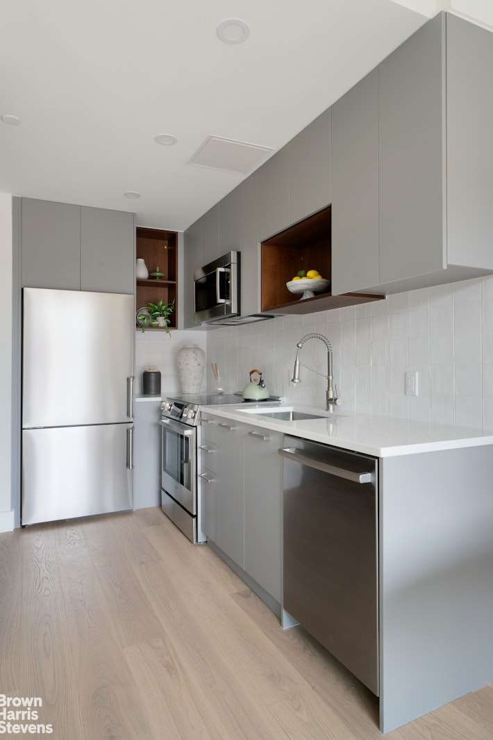 Residence 3A's 1 bedroom, 1 bathroom layout exemplifies the pinnacle of luxury living. The interiors are adorned with rich white oak engineered wood floors, creating a warm and inviting atmosphere. The spacious and open floor plan allows for effortless entertaining and comfortable living leading out to a private balcony. The state-of-the-art kitchen is a chef's dream, featuring sleek white countertops and a blend of custom painted wood shaker cabinetry and elegant open shelving that enhance the clean, modern aesthetic. High-end appliances by Bosch ensure every meal is prepared to perfection.