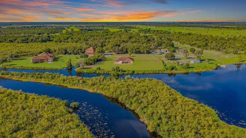 Breathtaking Multi-family waterfront estate offers privacy, a custom main house of 7181 sq ft of ultimate luxury with 4 ensuites, pool bath & half bath, 3/3 guest house with 6 car garage, acreage, private boat ramp, dock & natural spring. Built to withstand CAT 5 hurricanes, CBS, metal roof, X flood zone (no flood insurance required), high elevation, no flooding. Two Masters one upstairs & one downstairs each have his & her vanities, custom closets, rain showers & Jacuzzis. Flooring is travertine, marble, onyx, wood & carpet. Gourmet kitchen with Brookwood cabinetry & 'jeweled granite countertops, double sinks, double ovens, bread warmer, island with a gas cooktop, breakfast nook, wine room, huge walk-in pantry, & vast great room with a custom bar. Plantation shutters, wraparound waterfront veranda & private balconies up, elevator shaft, whole house security system. This property is stunning Zoned AG Unspoiled scenery as this breathtaking Florida Ecosystem encompasses miles of different waterways connecting to the Peace River and Charlotte Harbor. Property is filled with birdlife, bring your horses, boats, planes, or helicopter. You can land and store your helicopter or seaplane as the utilities are underground. F-13 airport across street, Punta Gorda Airport 10 miles 2nd folio #4024292000005.