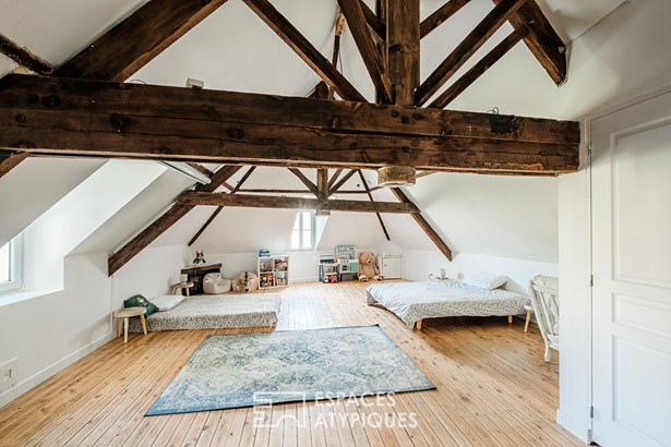 The staircase extends to the top level, where a large attic room awaits conversion, overlooking the house's roof structure. The large floor area offers ideal perspectives for creating additional living space. Outside, a glass roof currently houses a spa, an ideal place to recharge your batteries while enjoying the spectacle of nature.