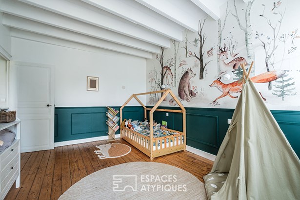 The view extends into a vast living room of approximately 40 sqm enjoying a double exposure. Cooking while enjoying a suspended view is the promise of this magical place. The openings allow you to admire the property's magnificent wooded park. From the living room, the staircase leads to two sleeping areas. The first wing is dedicated to the parental space and the second to the children's space with two bedrooms. Each space has its own bathroom.