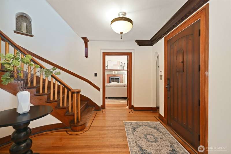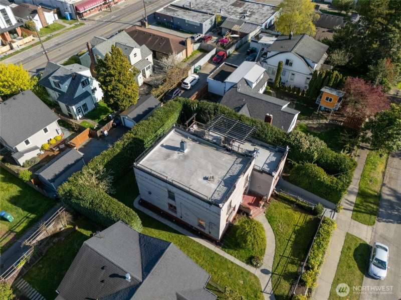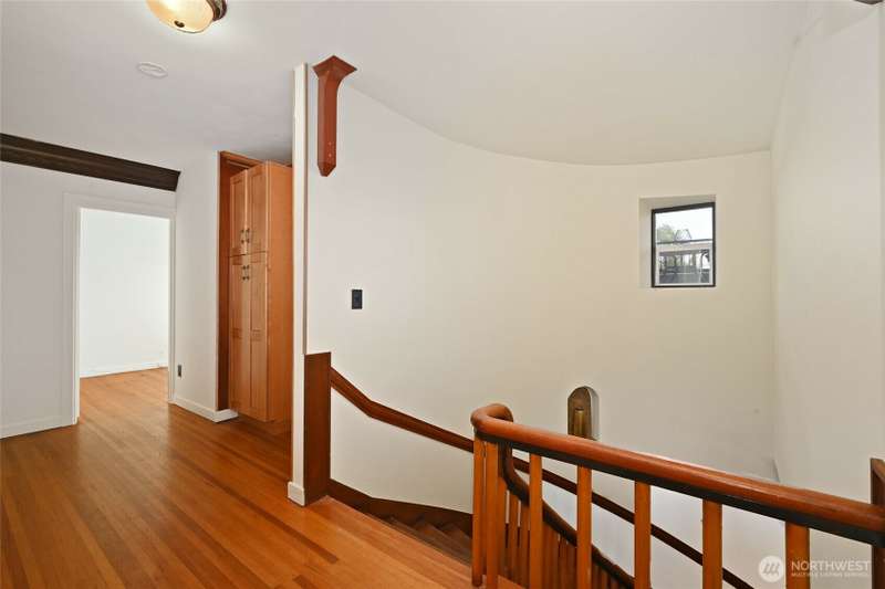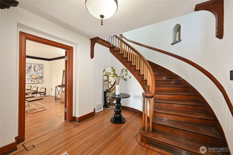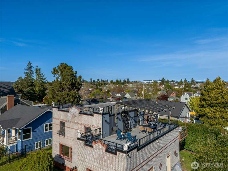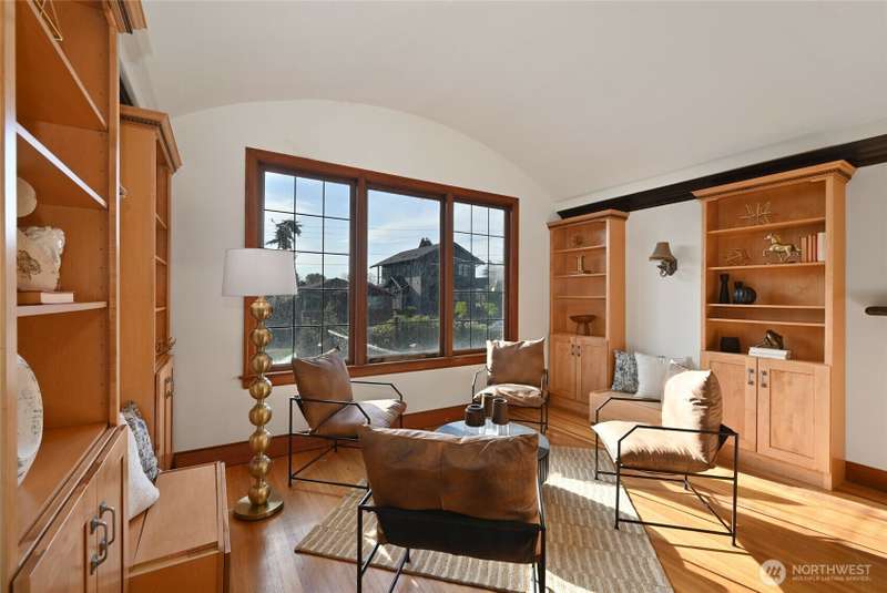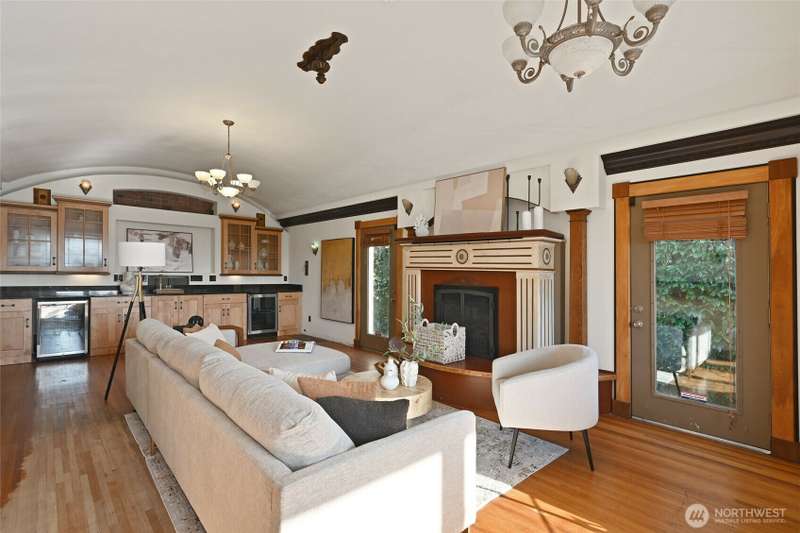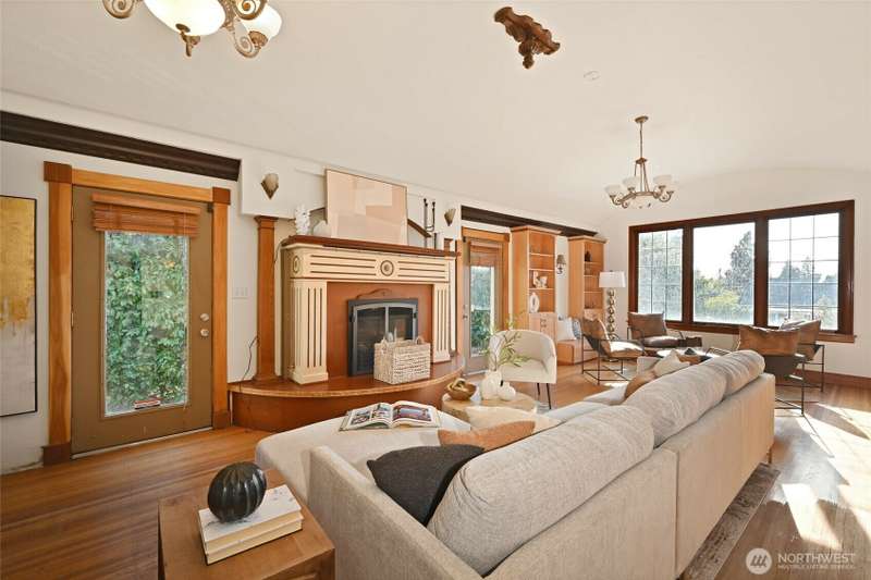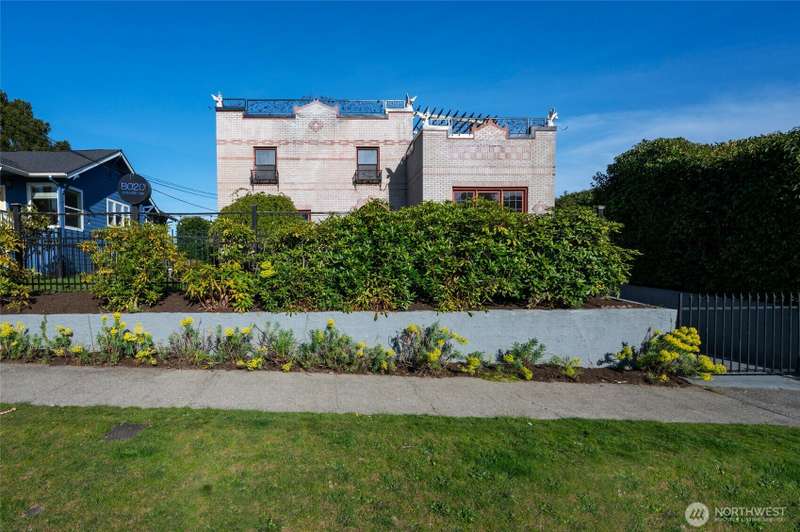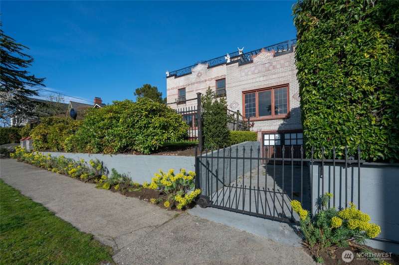 Rare opportunity to own a treasured one of kind 'castle' w/stunning architectural features & endless possibilities in Loyal Heights! Curved staircase invites you into the grand ballroom w/curved ceilings & stately fireplace. Oak hardwoods w/mahogany inlay. Art niches & wrought iron details. Kitchen updated w/maple cabs, Viking range & stone counters. 4 bd+office upstairs. Finished lower-level w/back entrance is an ideal theatre rm, office or bonus. Custom wrought iron railings on rooftop deck w/ Mt. Rainier views. Reimagine or build, double lot offers incredible potential. Subdivide Possibility. Perfect canvas for something truly special. Easy access to Ballard’s fabulous amenities: boutiques, upscale dining, hip bars & parks.95 Walk-score!