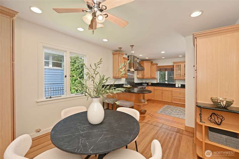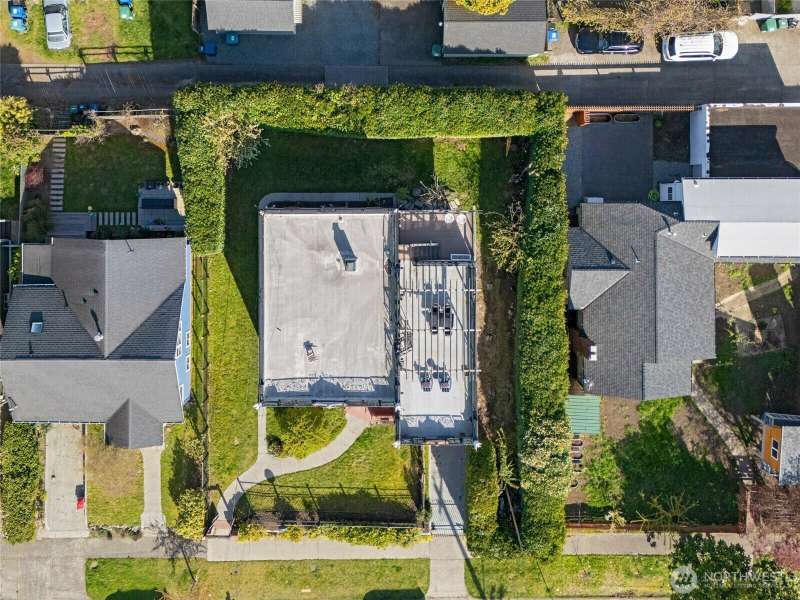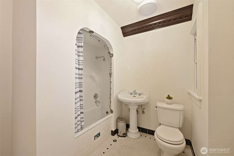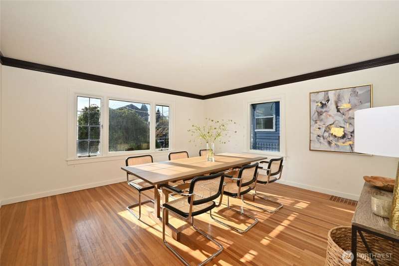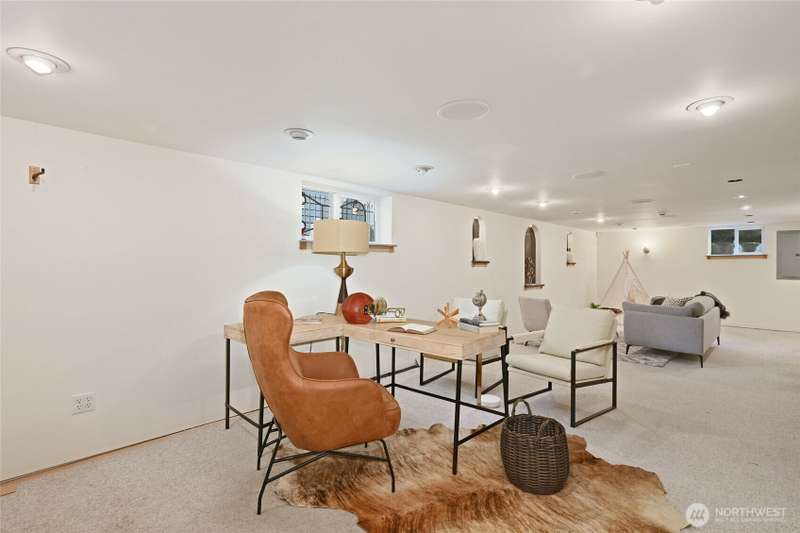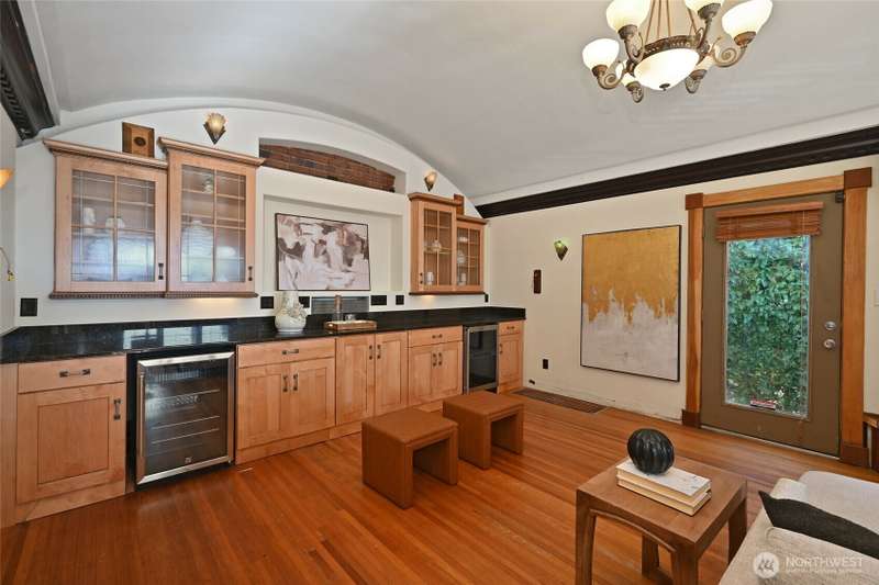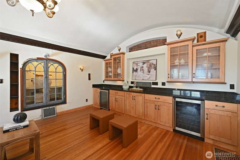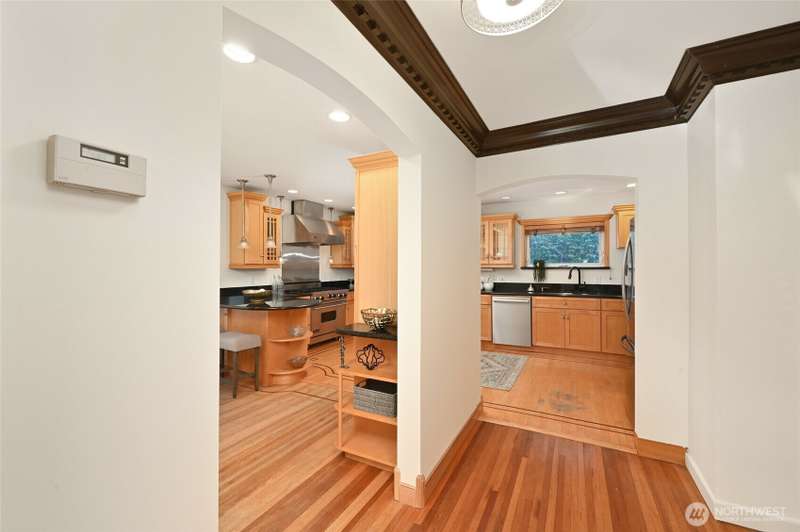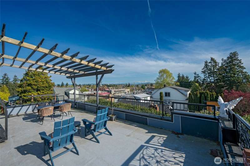 Rare opportunity to own a treasured one of kind 'castle' w/stunning architectural features & endless possibilities in Loyal Heights! Curved staircase invites you into the grand ballroom w/curved ceilings & stately fireplace. Oak hardwoods w/mahogany inlay. Art niches & wrought iron details. Kitchen updated w/maple cabs, Viking range & stone counters. 4 bd+office upstairs. Finished lower-level w/back entrance is an ideal theatre rm, office or bonus. Custom wrought iron railings on rooftop deck w/ Mt. Rainier views. Reimagine or build, double lot offers incredible potential. Subdivide Possibility. Perfect canvas for something truly special. Easy access to Ballard’s fabulous amenities: boutiques, upscale dining, hip bars & parks.95 Walk-score!