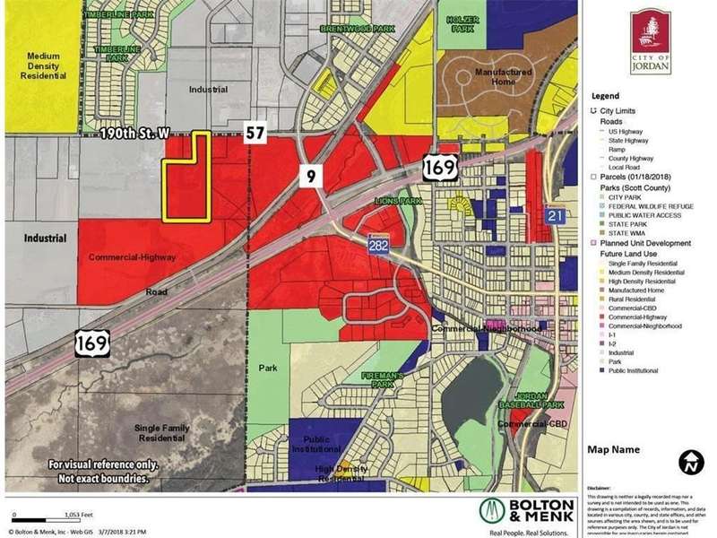 15+ acres guided for highway Commercial. Just off Hwy 169. Sewer and water available. Additional land available. Up to 107 -/+ acres. Easy access to Hwy. 169 & Hwy. 212. Just South of Shakopee. Very near the City of Jordan's new proposed interchange.