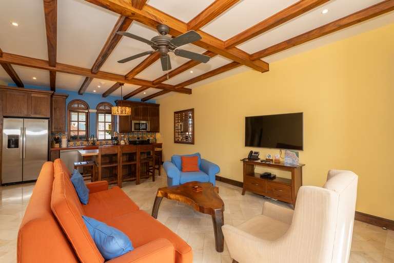 Located in the vibrant heart of downtown Las Catalinas, this beautifully designed 2-bedroom, 2-bathroom flat in Plaza Carlota offers the perfect blend of comfort, elegance, and scenic beauty. Ideal for families or small groups, it comfortably sleeps up to 5 guests with a king bed in the master suite, two single beds in the guest bedroom, and a queen pull-out sofa in the living area.
