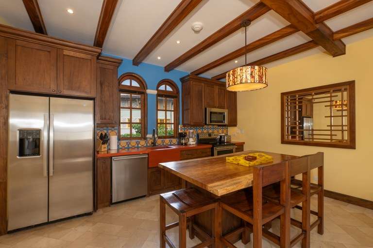 The open-concept living space serves as the central hub for relaxation and entertainment, seamlessly connecting to the highlight of the home: a private covered rooftop terrace. This elevated outdoor retreat offers panoramic views of the Pacific Ocean, surrounding mountains, and the charming pedestrian streets of Las Catalinas. With seating for eight, it's perfect for enjoying your morning coffee, hosting a sunset dinner, or simply unwinding under the stars.