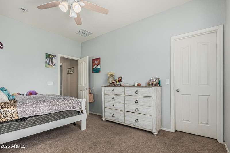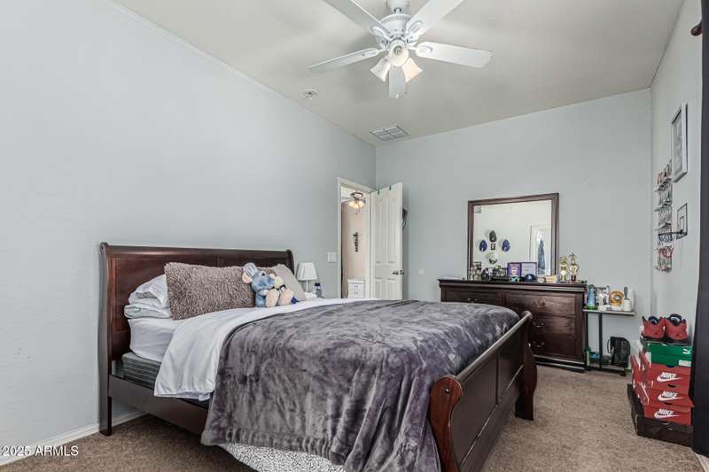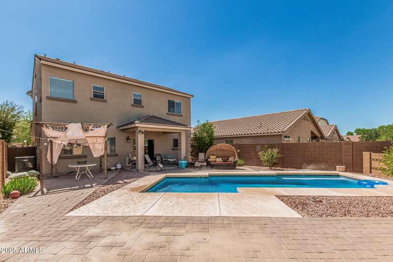 WOW! This beautifully maintained 4-bedroom, 3.5-bath home offers the perfect blend of comfort and style with two private master suites and a sparkling backyard pool retreat. Designed for effortless living, the open kitchen features upgraded maple cabinets with crown molding, a tiled backsplash, pantry, and island overlooking the great room. Enjoy north/south exposure, upgraded fixtures and ceiling fans, blinds throughout, and dual sinks with walk-in closets in the primary suites. Step outside to a covered back patio, stylish brick paver walkways, and a refreshing professionally maintained pool--perfect for Arizona living. Located in the desirable Laredo Ranch community near shopping, dining, and top schools.