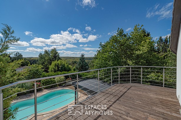 A landscaped driveway leads to the single-story entrance of the house. As soon as you cross the threshold, your gaze is captivated by a vast living room of over 100 m2 bathed in natural light. The interior architecture is distinguished by a cathedral ceiling that gives a feeling of openness and grandeur. The living room, warmed by a wood-burning stove, opens onto a German-quality fitted kitchen. This welcoming reception area extends naturally onto the terrace and pool. An office, located on a suspended mezzanine, offers breathtaking views of the surrounding greenery. The property has three bedrooms, including a master suite with a dressing room, bathroom, and private balcony. One bedroom has its own shower room, and a third bedroom also has its own dedicated shower room. To complete the functionality of this home, there is also a laundry room, a cellar, and a double garage accessible from the entrance.