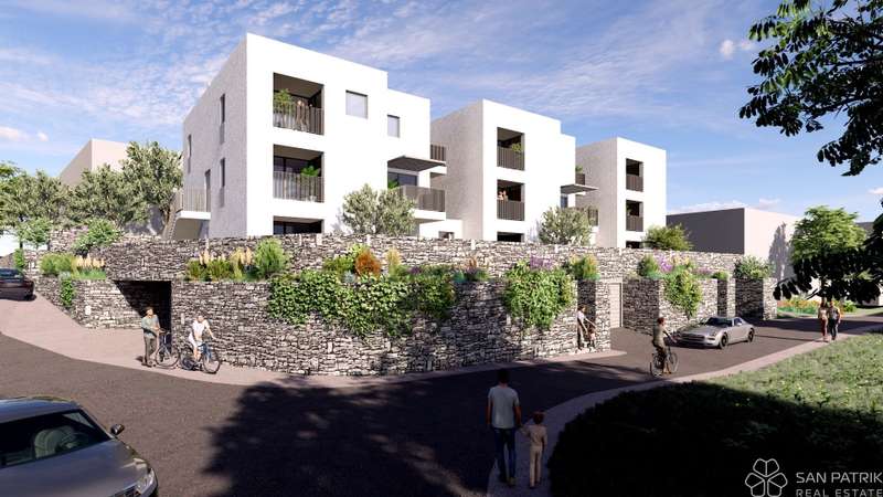 In a quiet part of Podstrana, just 500 meters from the beach, a contemporary residential building is under construction, featuring a total of 13 elegantly designed apartments. The building consists of three joined units with an underground level that includes garage parking spaces and storage rooms. The entire project is designed to offer high-quality living, comfort, and practicality at an exceptional micro-location above the main road, with excellent transport connections.