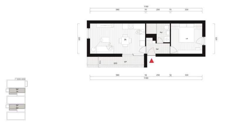 Apartment S-3-3 - 2nd floor - living area 36.37 m2 (1 bedroom + bathroom) + balcony (6.78 m2 - south) + storage room (2.44 m2) + garage parking space, total net area 47.29 m2 = €160,515