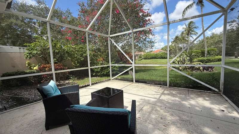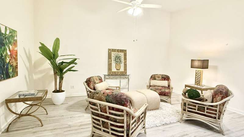 This Extended Capri floor plan has the unique situation of being located on a corner with a tremendous view of open green space! Extremely quiet and close to the park just north of Riverwalk Circle there is a peaceful view from every window! This home features the sought after expanded air conditioned space off of the dining area. The kitchen opens to the Great Room with cathedral ceilings and dining area, perfect for entertaining. Luxury vinyl plank flooring is throughout the whole home. There is a screened patio overlooking the lake and lush landscaping, an ideal spot for early morning coffee or winding down with a glass of wine while watching the sun set. The principal bedroom has an en suite bathroom with walk in shower and double sinks, large walk in closet.