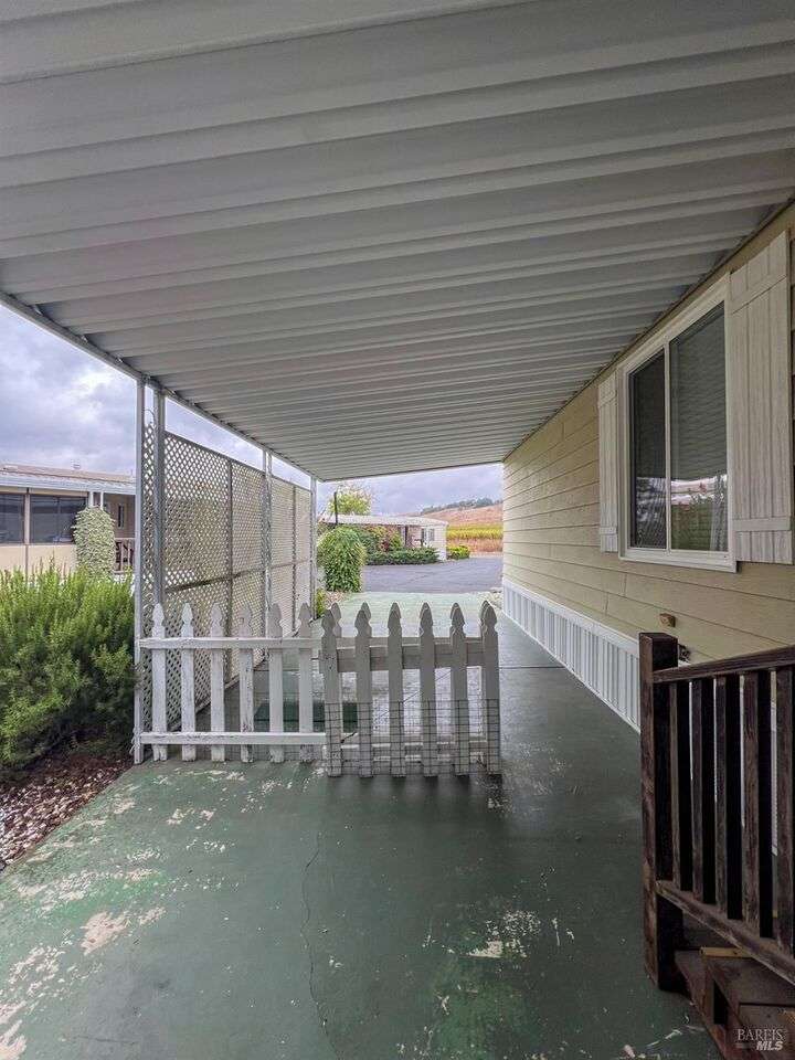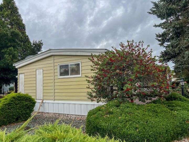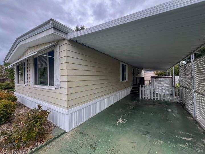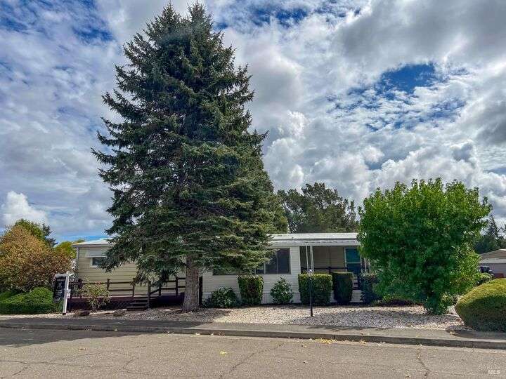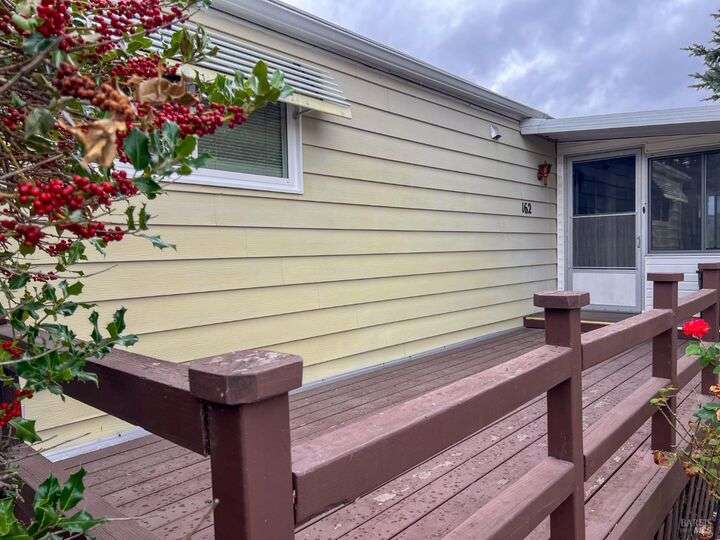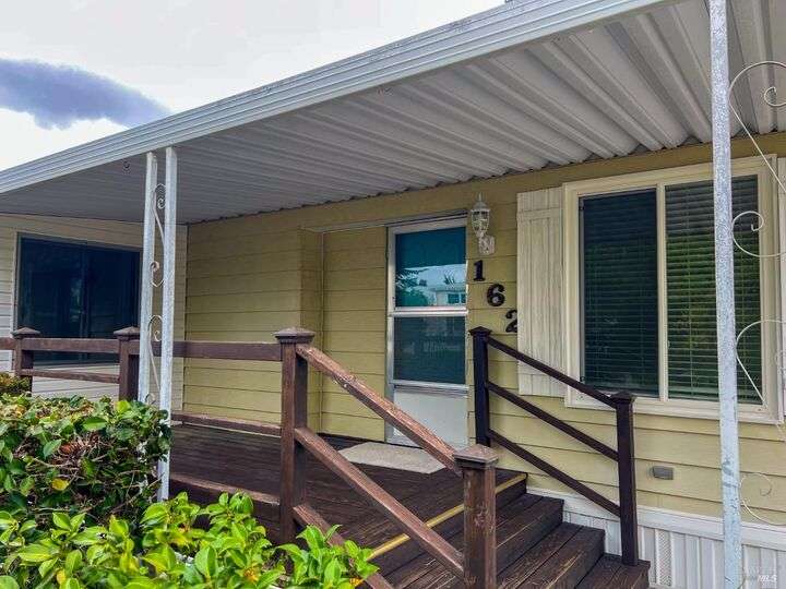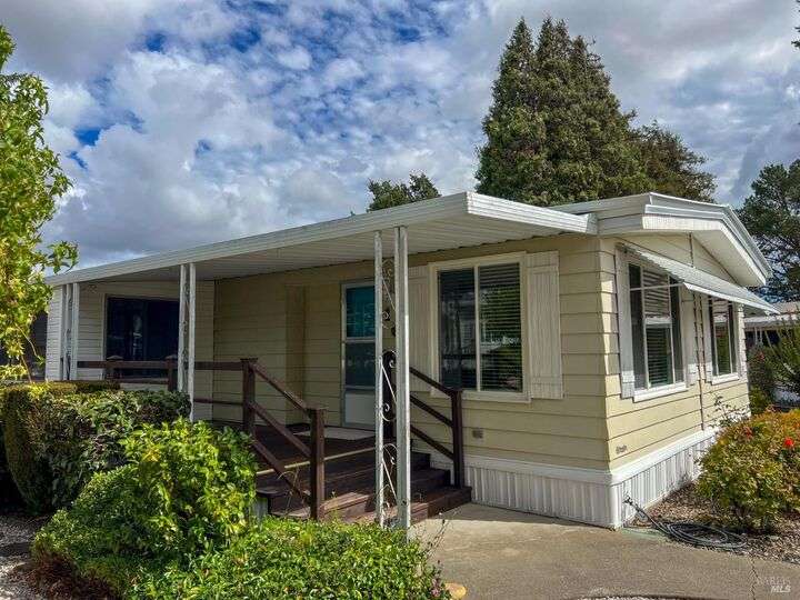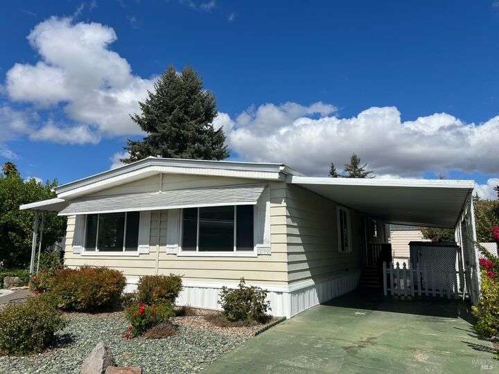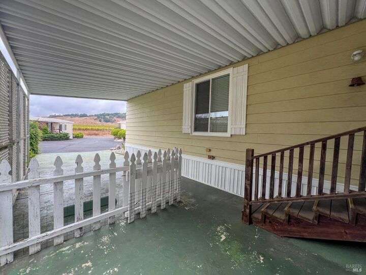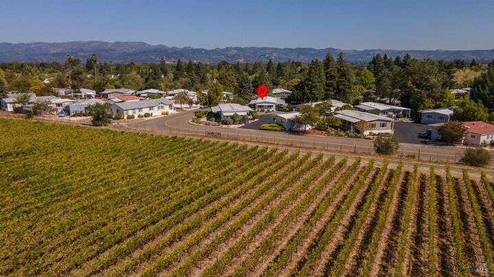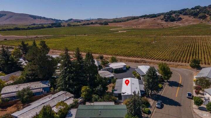 Prime cul-de-sac location with vineyard views - 2BR/2BA home. Open living/dining area with built-in buffet, kitchen with island and two pantries, plus adjoining family room. Light-filled with skylight tubes, new carpet, and fresh paint. Enclosed sun porch, multiple decks, and two storage sheds. Covered tandem carport plus ample street parking. Community pool, clubhouse, and recreation areas in a desirable 55+ park.