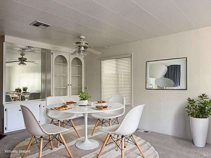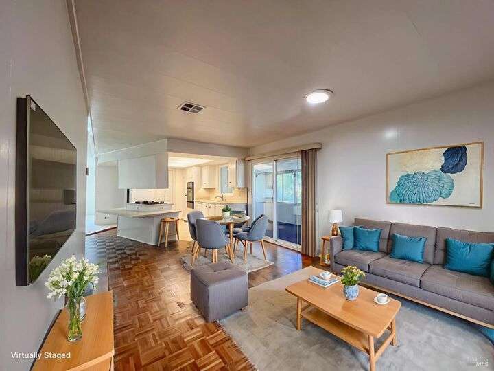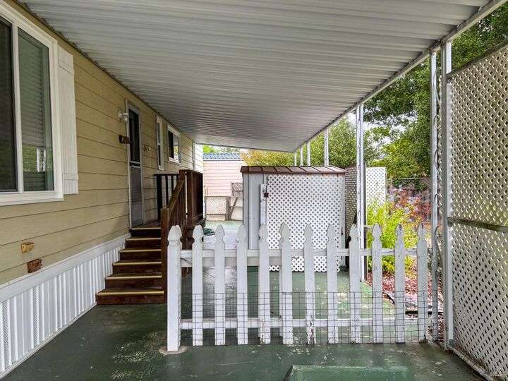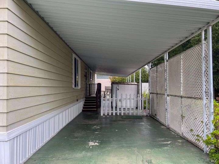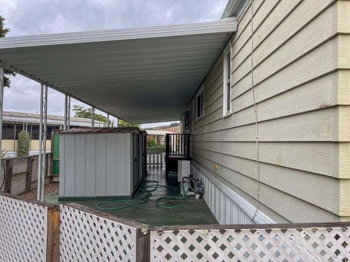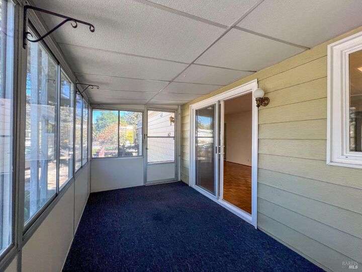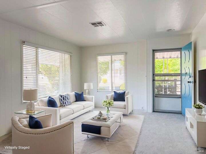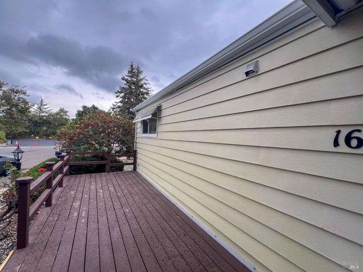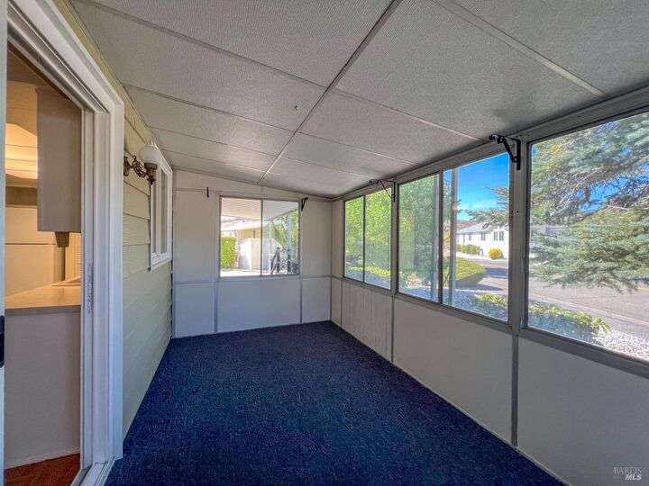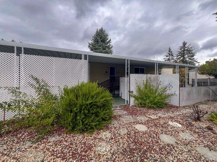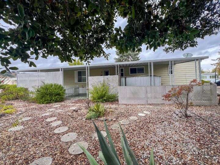 Prime cul-de-sac location with vineyard views - 2BR/2BA home. Open living/dining area with built-in buffet, kitchen with island and two pantries, plus adjoining family room. Light-filled with skylight tubes, new carpet, and fresh paint. Enclosed sun porch, multiple decks, and two storage sheds. Covered tandem carport plus ample street parking. Community pool, clubhouse, and recreation areas in a desirable 55+ park.