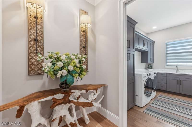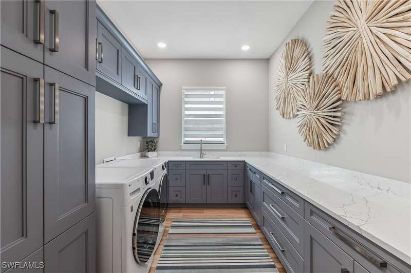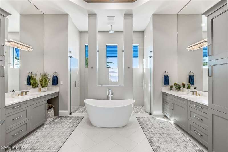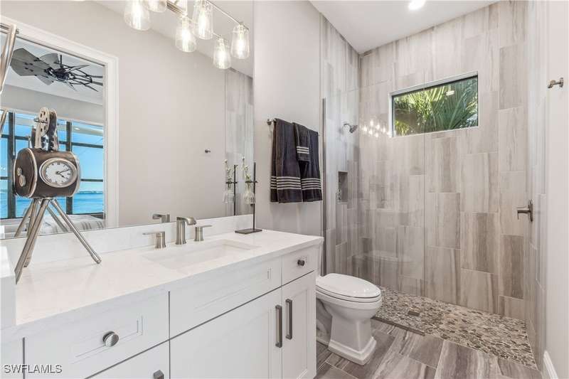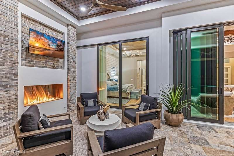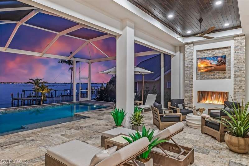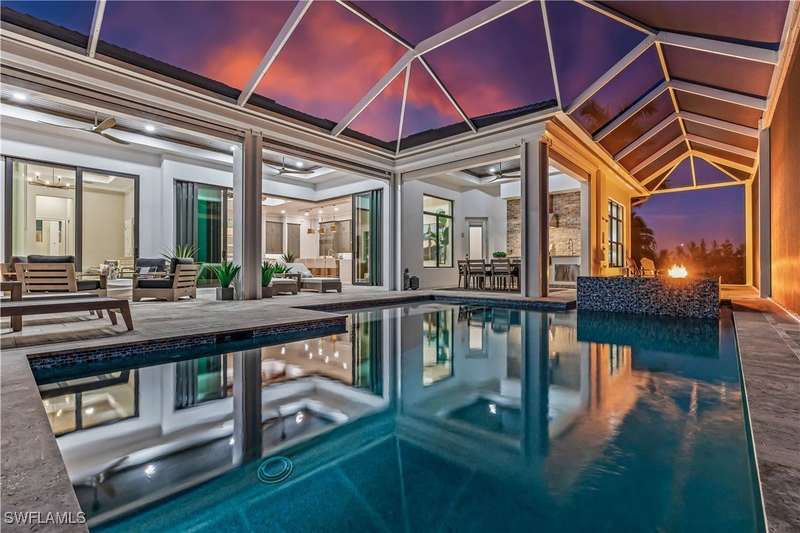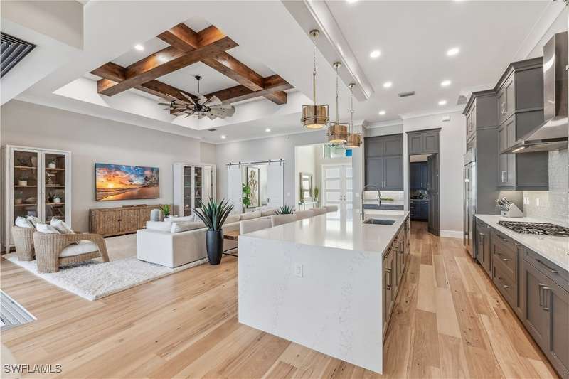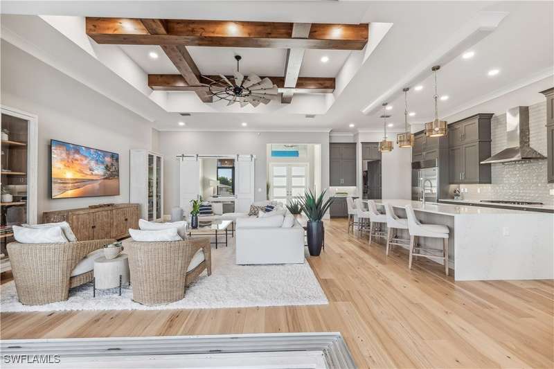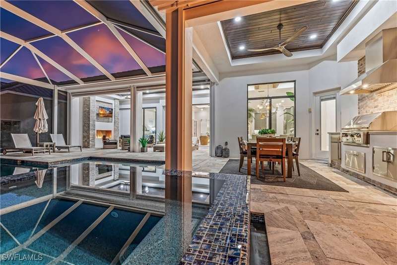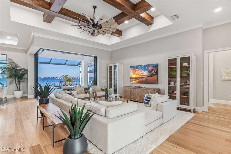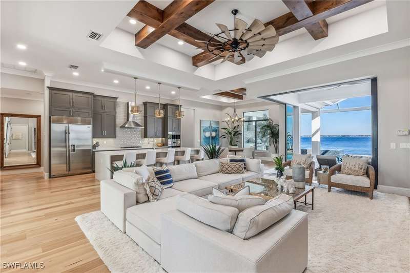 Discover the epitome of luxury living in this exquisite new construction (2023) coastal contemporary masterpiece, perfectly situated along the stunning riverfront. Designed for the discerning homeowner and avid boater, this home offers breathtaking views that transform every moment into a picturesque escape. As you step inside, you are welcomed by soaring 12 to 16-foot ceilings adorned with elegant Knotty Alder wood beams, complemented by rich American Hickory hardwood floors that exude warmth and sophistication. The culinary enthusiast will revel in the chef's dream kitchen, featuring state-of-the-art Wolf appliances, a gas cooktop, and an expansive island topped with luxurious quartz surfaces, making it the ideal space for entertaining. A hidden door discreetly leads to a spacious butler's pantry, perfect for gourmet preparations. This home boasts four opulent en-suite bedrooms, along with a convenient half bath for guests, ensuring comfort and privacy for all. Elegant tongue and groove southern pine wood ceiling inlays further enhance the home's exquisite design. Step outside to the breathtaking screened-in lanai, where panoramic views of the river create a serene backdrop for relaxation. This outdoor oasis is designed for entertainment, featuring a gourmet outdoor kitchen with a gas grill, a cozy gas fire pit, and a heated pool that beckons you to unwind. The harmonious elements of fire and water create an enchanting atmosphere, perfect for hosting gatherings or enjoying tranquil evenings under the stars. This is more than just a home-it's a lifestyle destination that embodies luxury and comfort. Don't miss the opportunity to claim this warm and inviting masterpiece as your own!