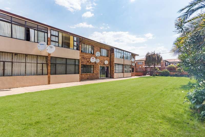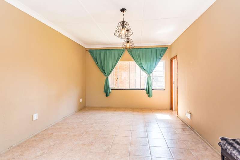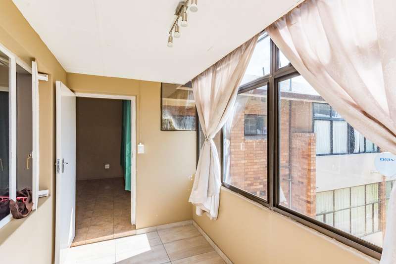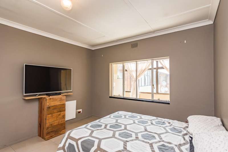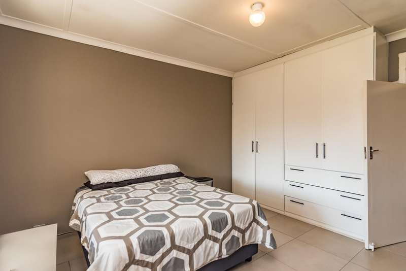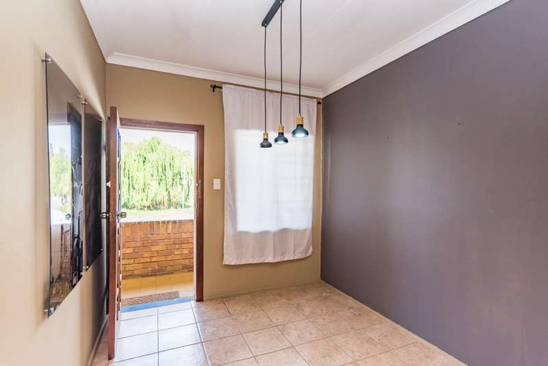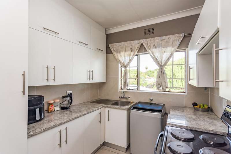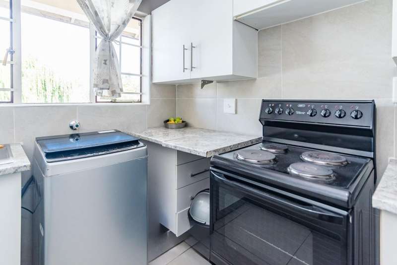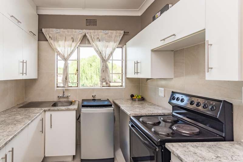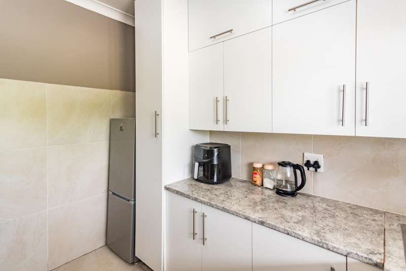 This one-bedroom unit with built-in cupboards has a modern kitchen, lounge, dining room, and bathroom.