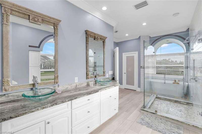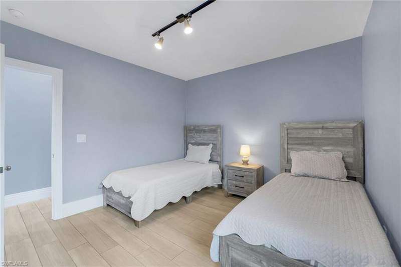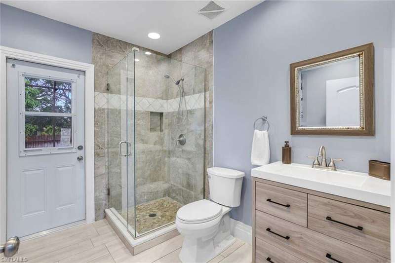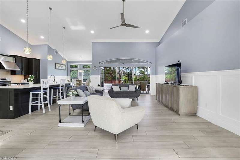 Discover the perfect blend of island living and modern comfort in this spacious, beautifully updated pool home, on an oversized lot. Ideally located just minutes from the famous white sandy beach of Marco Island, the home boasts of soaring ceilings, abundant natural light, and an open, airy floor plan that radiates warmth and character. Thoughtful design details set this home apart - wainscoting, crown molding, oversized windows, and recessed lighting on dimmers create an inviting atmosphere throughout. Quartz countertops in the kitchen, newer stainless-steel appliances, and an oversized island with a farmhouse sink - perfect for entertaining or everyday living. The main living area offers plenty of room for gatherings while maintaining a cozy, welcoming feel. Step outside to a private oasis complete with a large pool deck, paver patio with fire pit, lush lawn, mature mango tree, and an extra-large fenced-in back yard with lake views, plus a gated side yard ideal for a garden, boat, or RV storage. The primary suite is a serene retreat, featuring a spacious ensuite bath with freshly painted white cabinetry for a bright, coastal feel. Extensive updates completed in 2020-2021 include a new roof, AC, water heater, plumbing, pool heater, and interior renovations. This is the island home you've been waiting for - move-in ready, income-producing, and full of charm. Come see it for yourself!