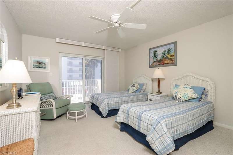 Enjoy this tropical paradise which is all about the beach at this charming 2-bedroom, 2-bath, 2nd floor condominium. Southwestern panoramic views from the lanai, kitchen and living area. Features include newly tiled common areas, comfortable living area with sofa, chairs, flat screen TV, and dining for 4 people. Bedrooms include king bed in one bedroom and two twins in other bedroom. There are private balconies from both the primary and guest bedroom. Wireless internet and cable included for your convenience. Washer and Dryer in unit or there is a large capacity washer and dryer in the common laundry room. Bonita Beach Club is a beachfront, tropically landscaped, gated community located on Hickory Blvd at the very North end tip of Bonita Beach! Offering many amenities, you are sure to never get bored. Amenities include an 80-ft. heated community beachfront pool, fitness center, tennis courts, 4 Pickleball courts, yoga and water aerobics available during season, billiards room, library, social room, project room, game room, lounge, BBQ area, shuffleboard, car wash area, fishing, direct beach access and so much more! All amenities have been renovated and are beautiful design with stunning decor.
