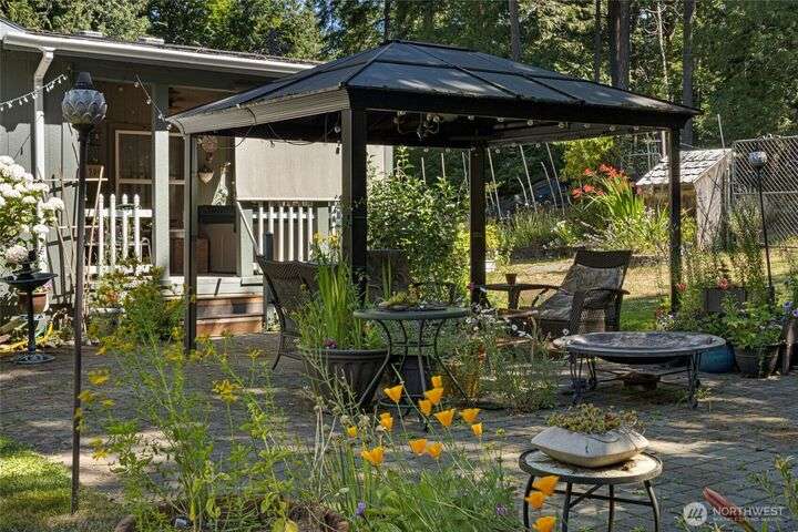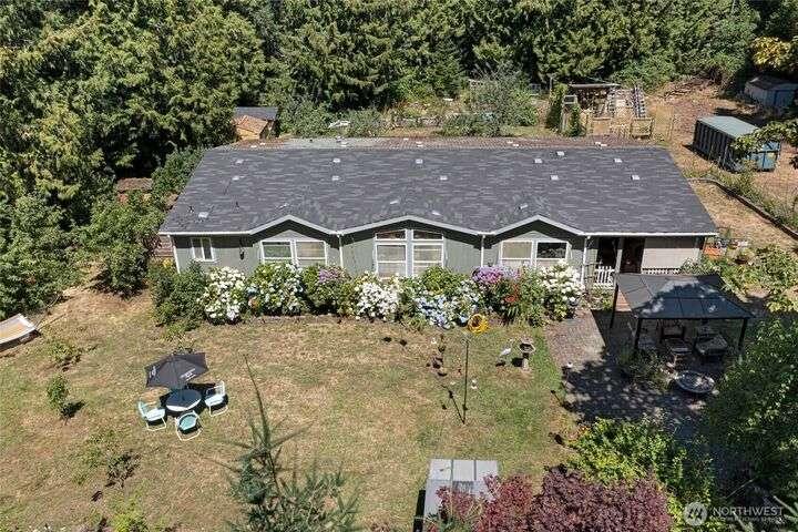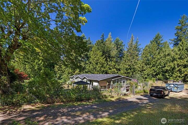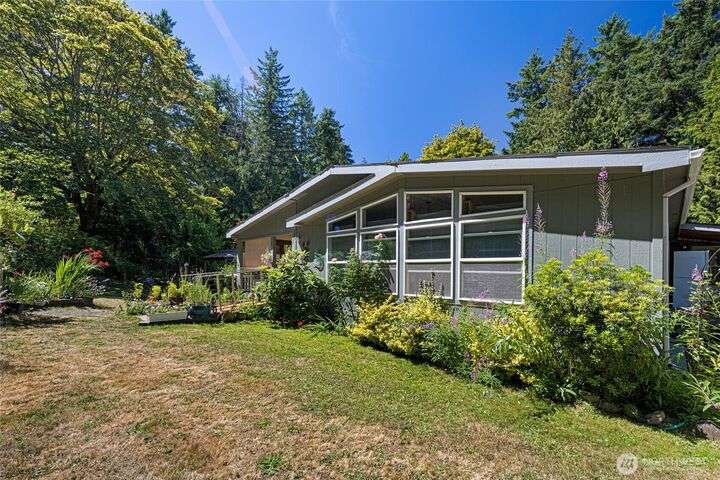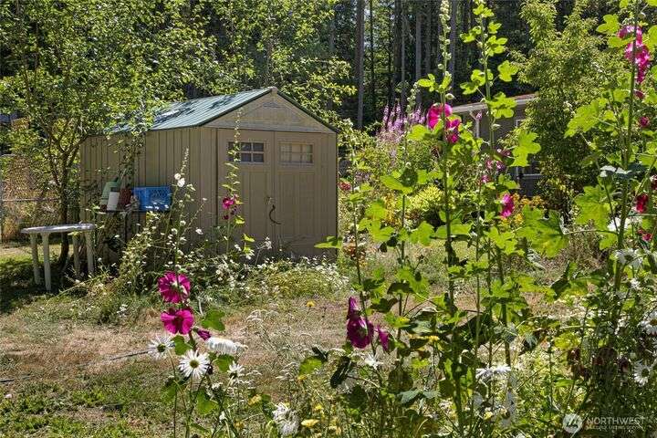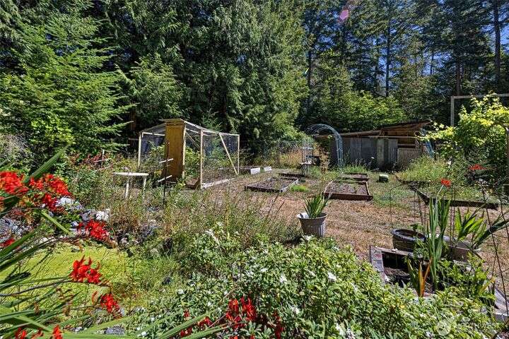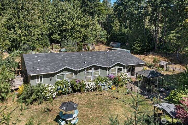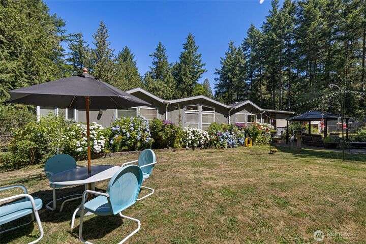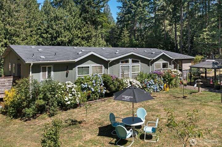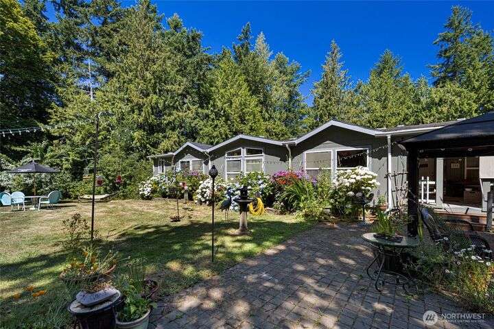 Private oasis near world class Roche Harbor Resort. Stunningly beautiful flowers for every season, fruit trees, hops, old growth, raised bed veg gardens & more. The perfect amount of sun & shade. This triple wide manufactured home offers a spacious layout & attention to detail, providing a comfortable & stylish living space. With 2,479 sqft of living area, there is plenty of room for relaxation & entertainment inside & out! Features 4 bedrooms & 2 bathrooms, offering convenience & privacy & creating a warm & inviting atmosphere. Private deck off the primary. The kitchen is equipped with everything you need & ample storage space, making it a delight for any home cook. the perfect choice for those seeking a well-designed and comfortable home.