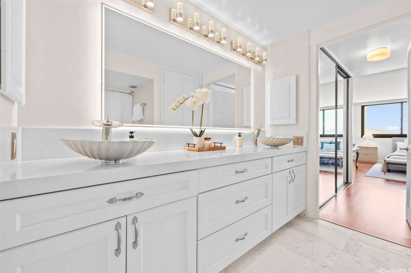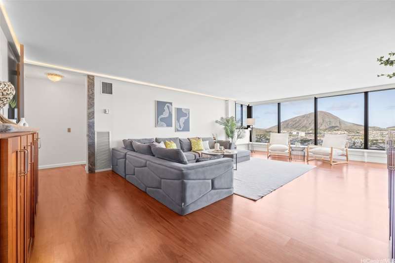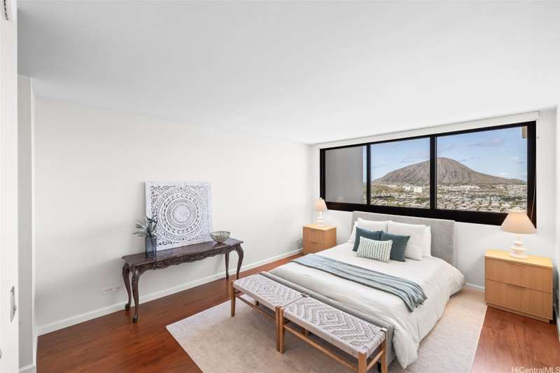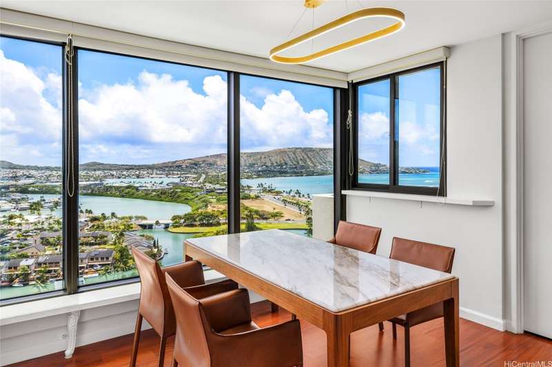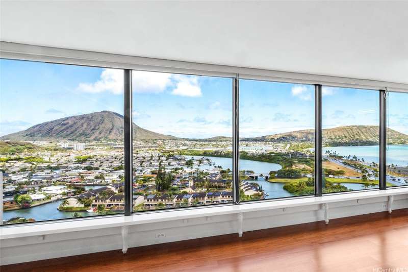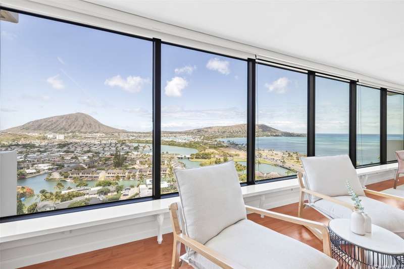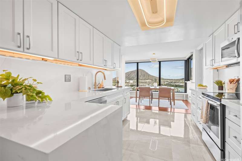 Rarely available! Stunningly RENOVATED unit in luxurious Mt.Terrace with unobstructed panoramic views of the ocean, mountain, and marina from EVERY room. One of the few buildings in Hawaii Kai that offer this level of security, space, and scenic views. This MOVE-IN READY 2 bed, 2 bath, 2 park, 1 storage home has been UPGRADED & FRESHLY PAINTED. Features quartz countertops & backsplash, stainless steel appliances, sleek cabinetry, & lots of storage. No popcorn ceilings---just clean lines and floor-to-ceiling windows showcasing the incredible 180° scenery. With 1600+ sq ft, this spacious retreat lives like a single-family home without the maintenance. Enjoy resort-style amenities: a heated pool, jacuzzi, sauna, racquetball, multiple BBQs, & a 1.5 acre garden. Ideal for retirees, a 1031 exchange, or as a vacation home. One of the few buildings with a 24-HOUR DOORMAN for added service and security. Minutes from the beach, COSTCO, dining, shopping, and just 10 miles to town. This exceptional home won't last, contact your agent today & be amazed!