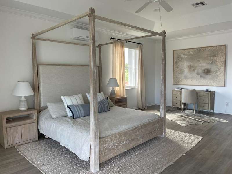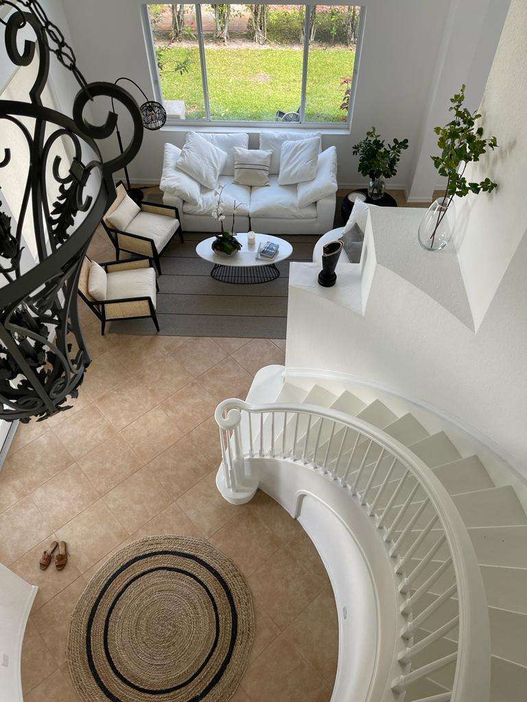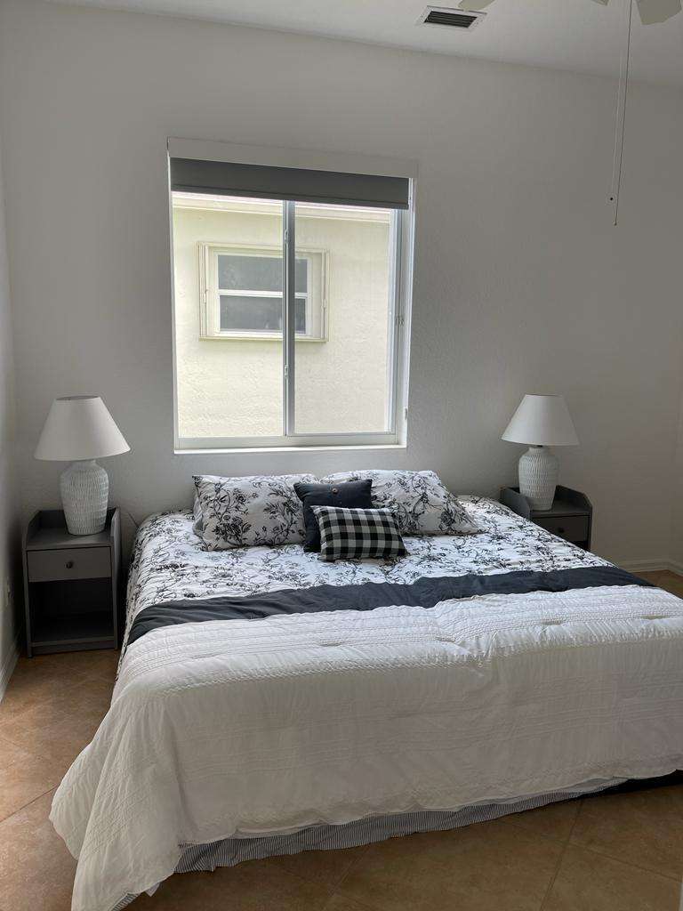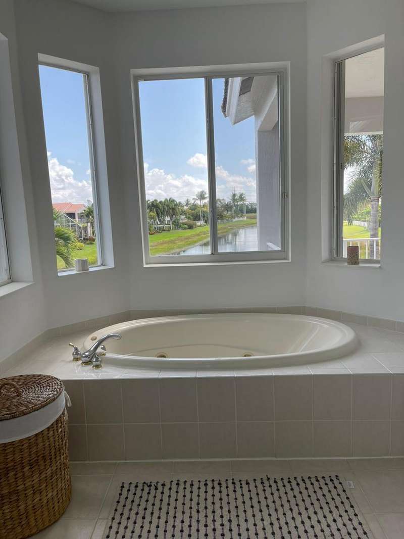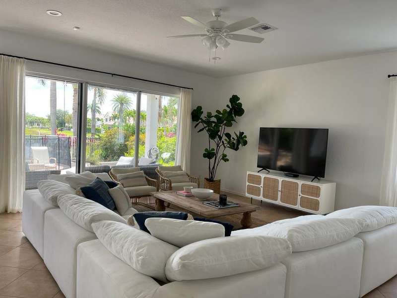 Spacious and elegant, this stunning home features a large family room with a triple slider that opens to breathtaking views of the pool and serene lake, plenty of nature. The modern kitchen boasts a generous island, perfect for entertaining opening to the large family room. A dramatic curved staircase adds architectural flair. The oversize main suite includes a private balcony with panoramic views. With one bedroom conveniently located downstairs, the layout is ideal for guest or multi-generational living. Fenced back yard offers privacy and space for out door enjoyment. Located in a community with resort style amenities. Available for summer rental fully furnished.