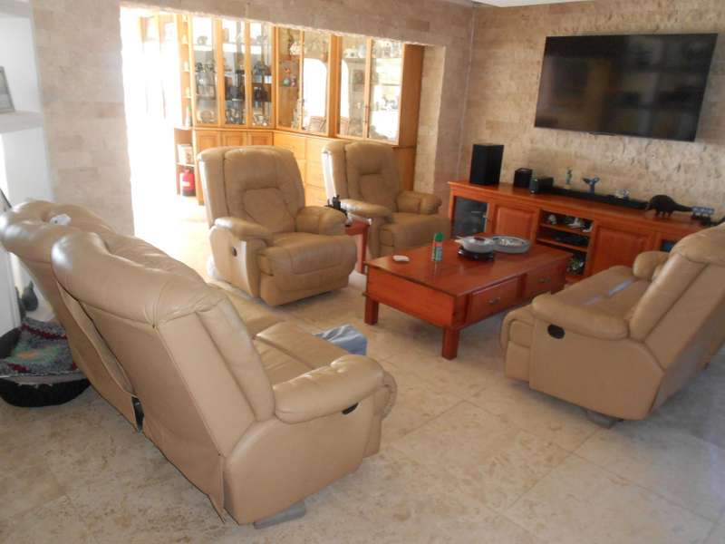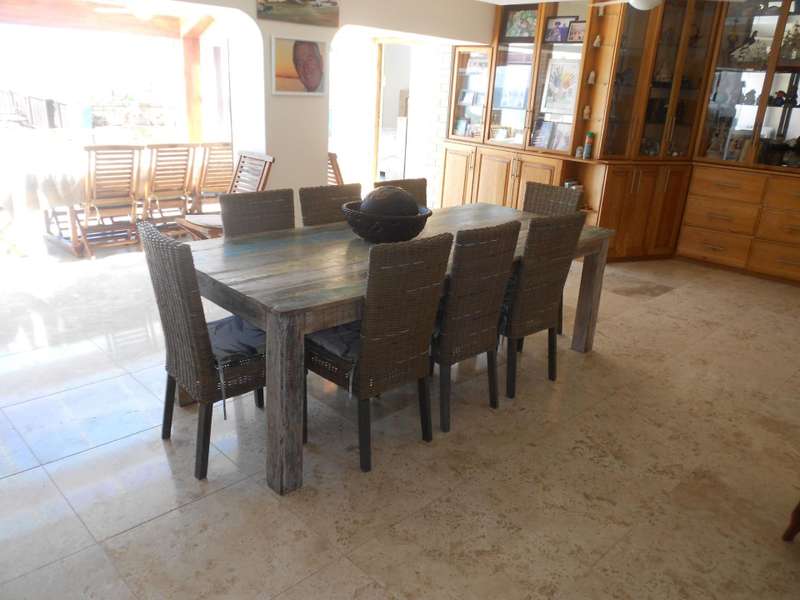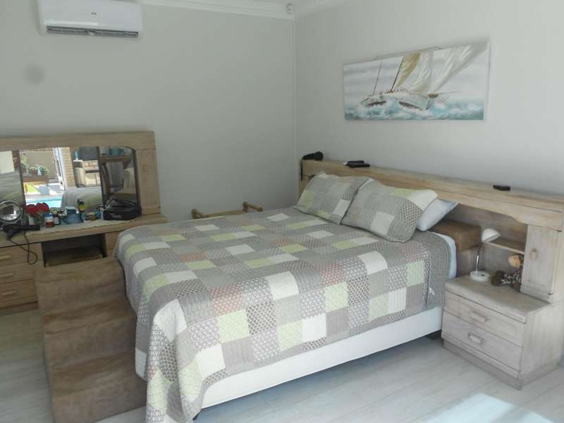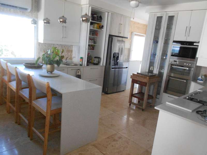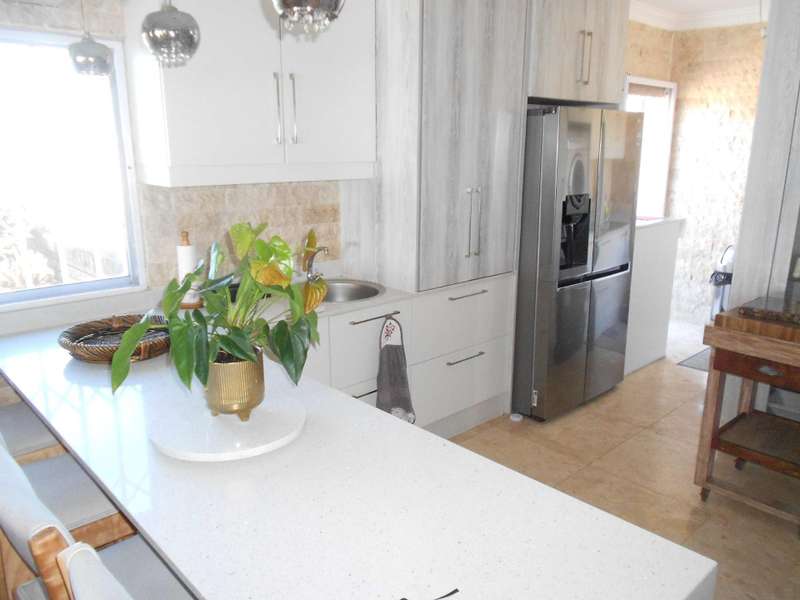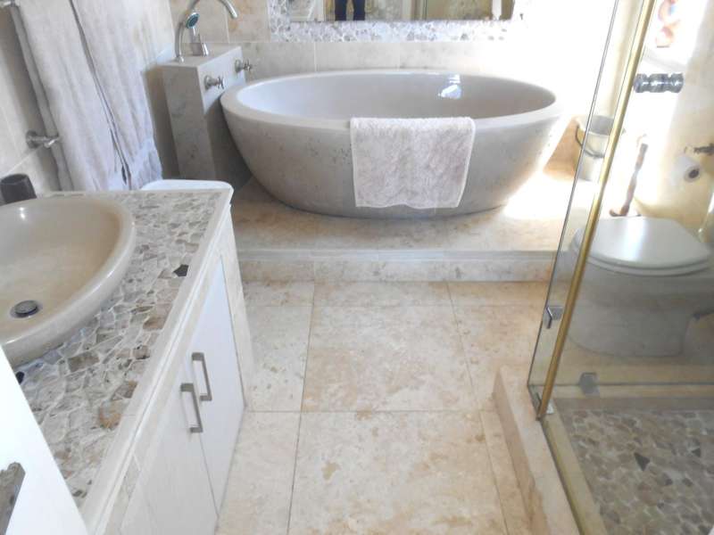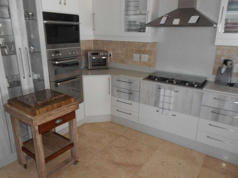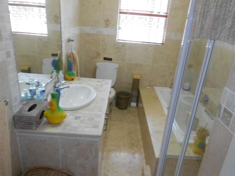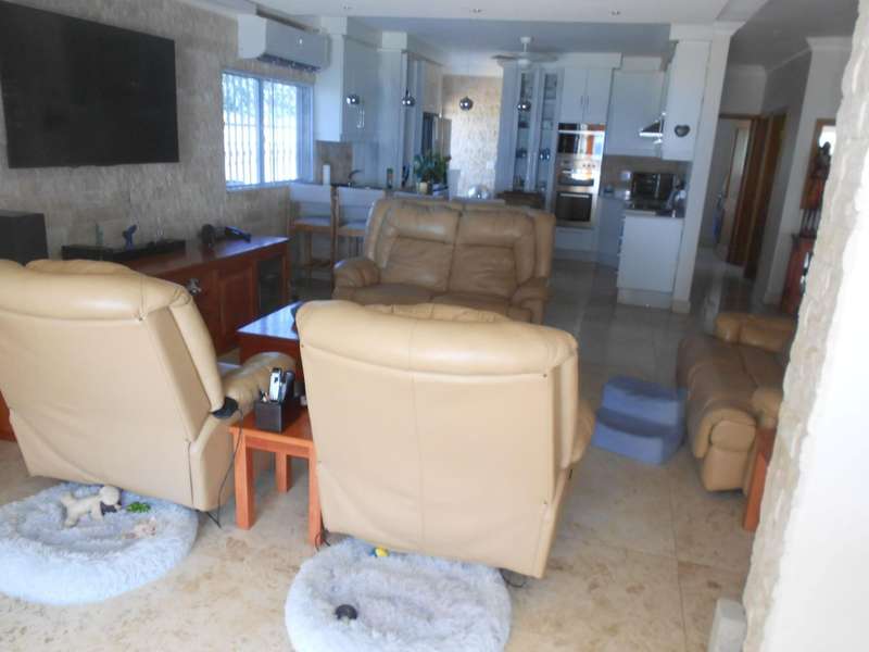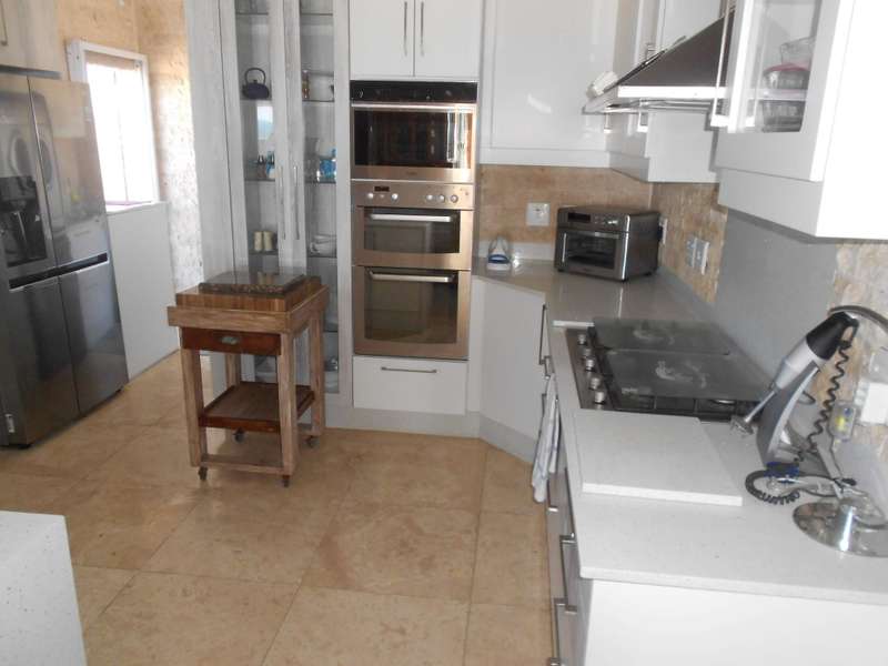 The bathrooms are beautifully finished with modern and oval stone and spa bath-tubs and showers. The main bedroom has a walk-through wardrobe. Aside from the four adult bedrooms, there is a kiddies bedroom also with on suite bathroom. The kitchen has beautiful finishes with engineered stone counter tops, a butchers chopping block, gas stove with eye-level ovens. There is a wash-up and laundry area leading off the kitchen. A large office or study room with a balcony, all living areas have air conditioning and there are solar panels, an inverter and four large lithium batteries. For the vehicles, there is double garage and a single garage. Many cupboards throughout the house. There is a gym room which can also be a kiddies play room and staff quarters with a bedroom, shower and toilet. A backup jojo tank of 2,5kl - is plumbed into the water supply, which along with the inverter will provide seamless uninterrupted utilities. This is a magnificent, luxury property and must be viewed to be fully appreciated. Call me for an appointment to view.