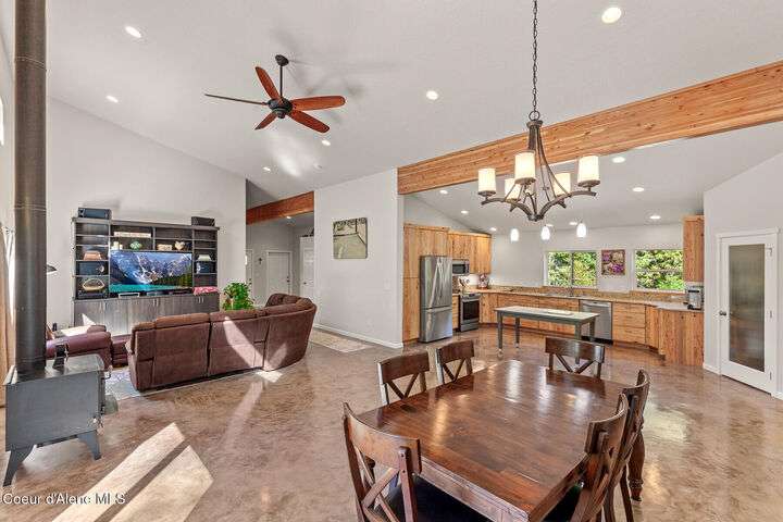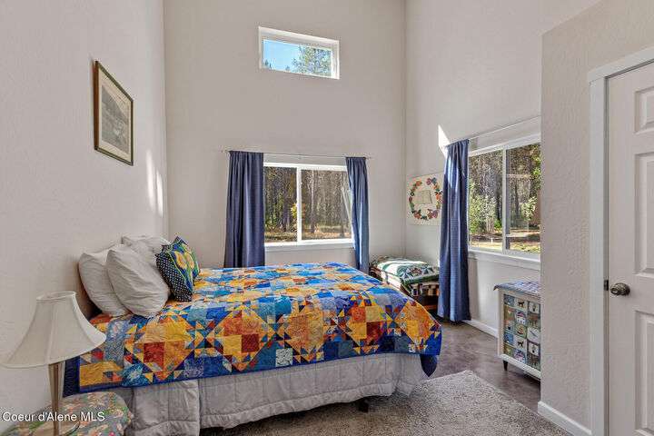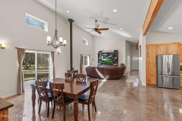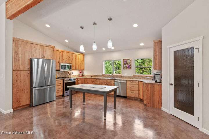 Custom Built Single Level Home with 30x40 Shop on 24 Acres! 2,112 sq ft features soaring high ceilings, hydronic in floor heat, wood stove, beautiful concrete flooring, large kitchen with stainless steel appliances, granite countertops & oversized pantry, large windows for optimal natural light, primary suite and so much more! 30x40 Shop with lean-to, concrete floor, windows and wired 220. Private, flat treed acreage with lawn, garden, and mature trees. Easy access on county-maintained road!